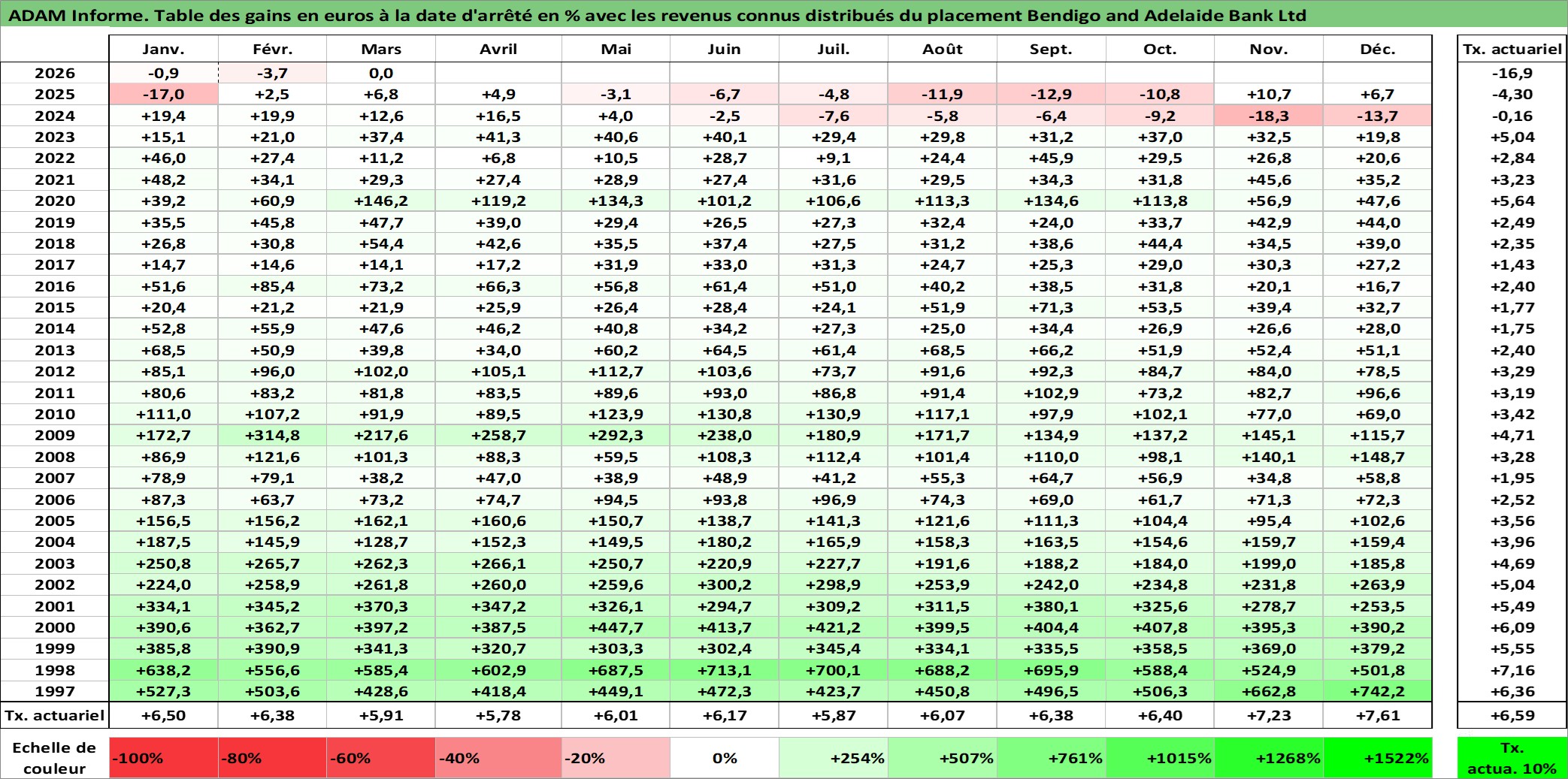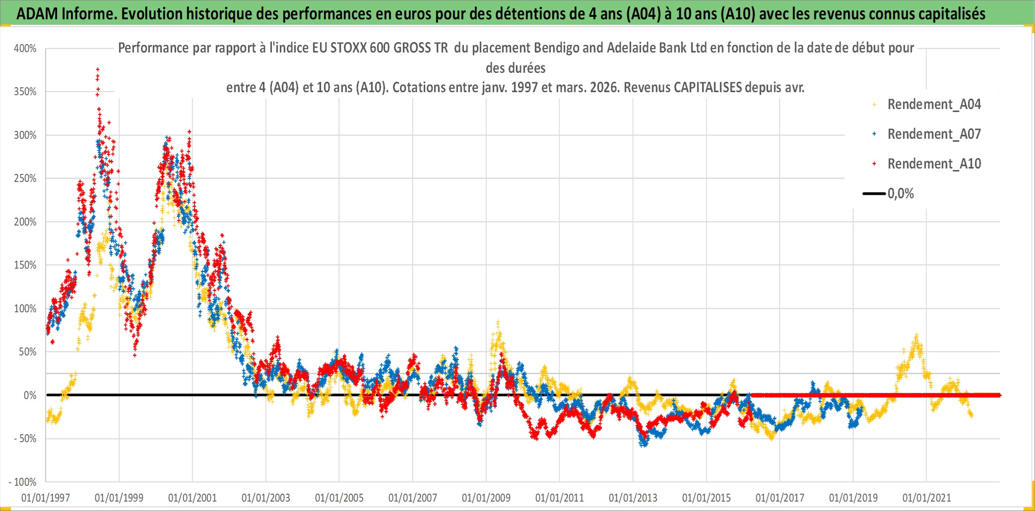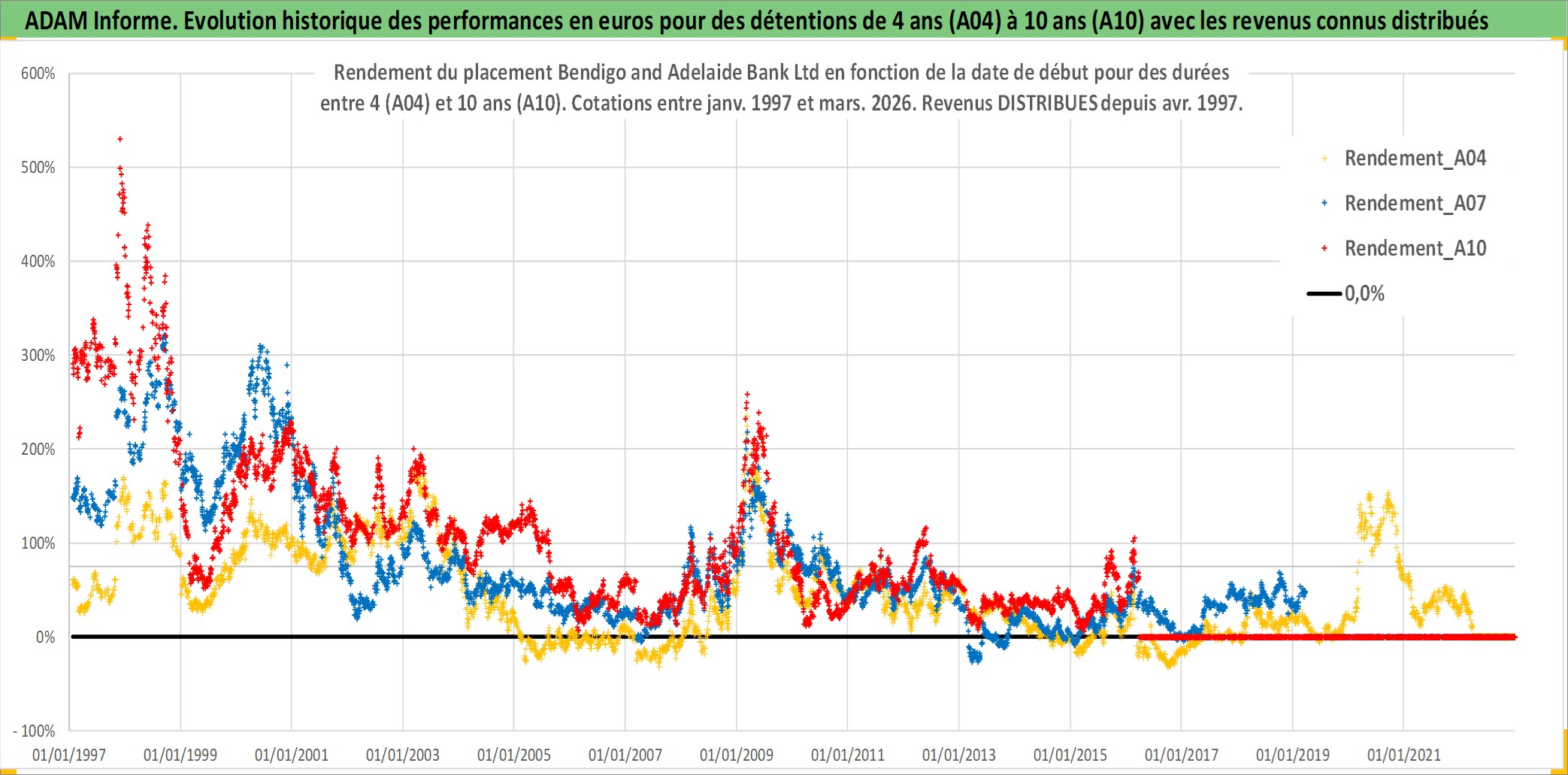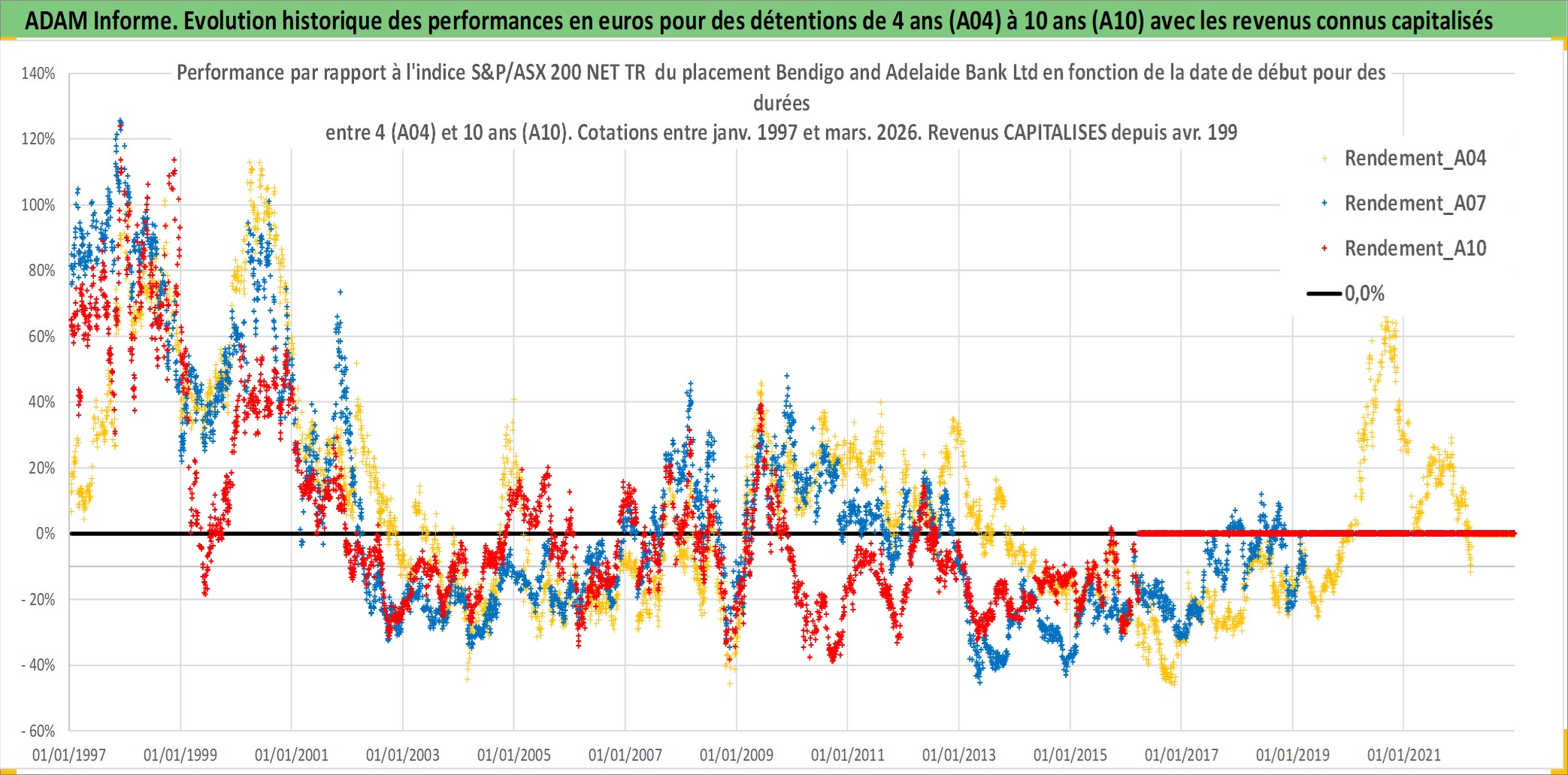 Site dédié aux investisseursPage dédiée sur site financeAnalyse des valorisations hebdomadaires de l'action Bendigo and Adelaide Bank Ltd. Cet actif est cote en AUD. Les valorisations sont en contrevaleur EURO et couvrent les semaines 1997W01 a 2026W13. Les revenus de cet actif financier sont pris en compte depuis la semaine 1997W15. La note ESG de cet actif n'est pas connue.