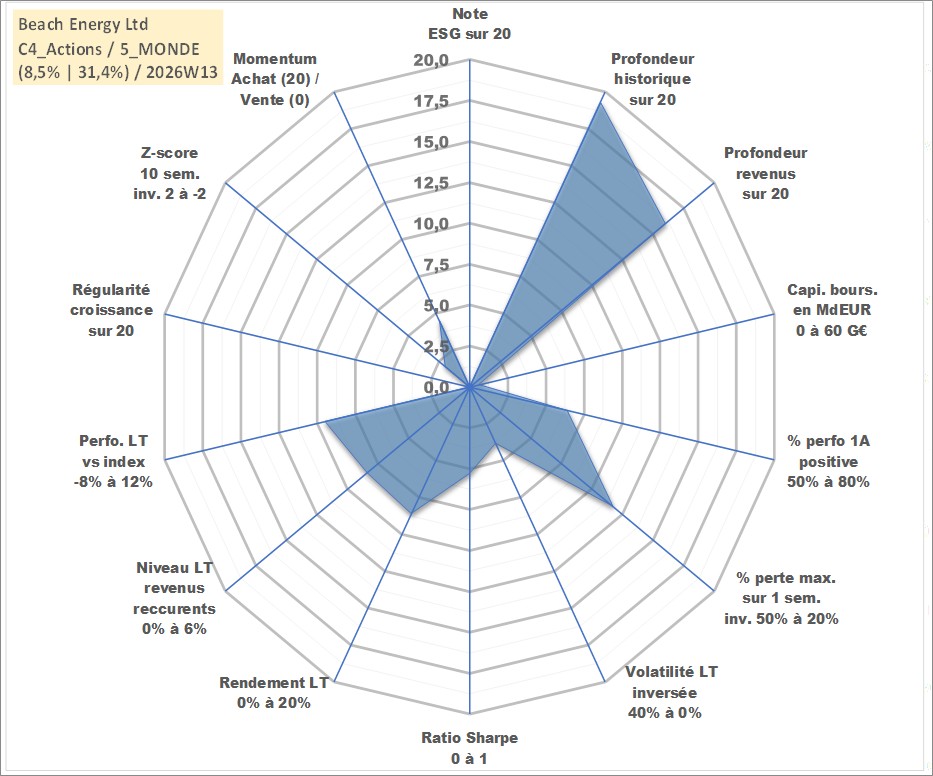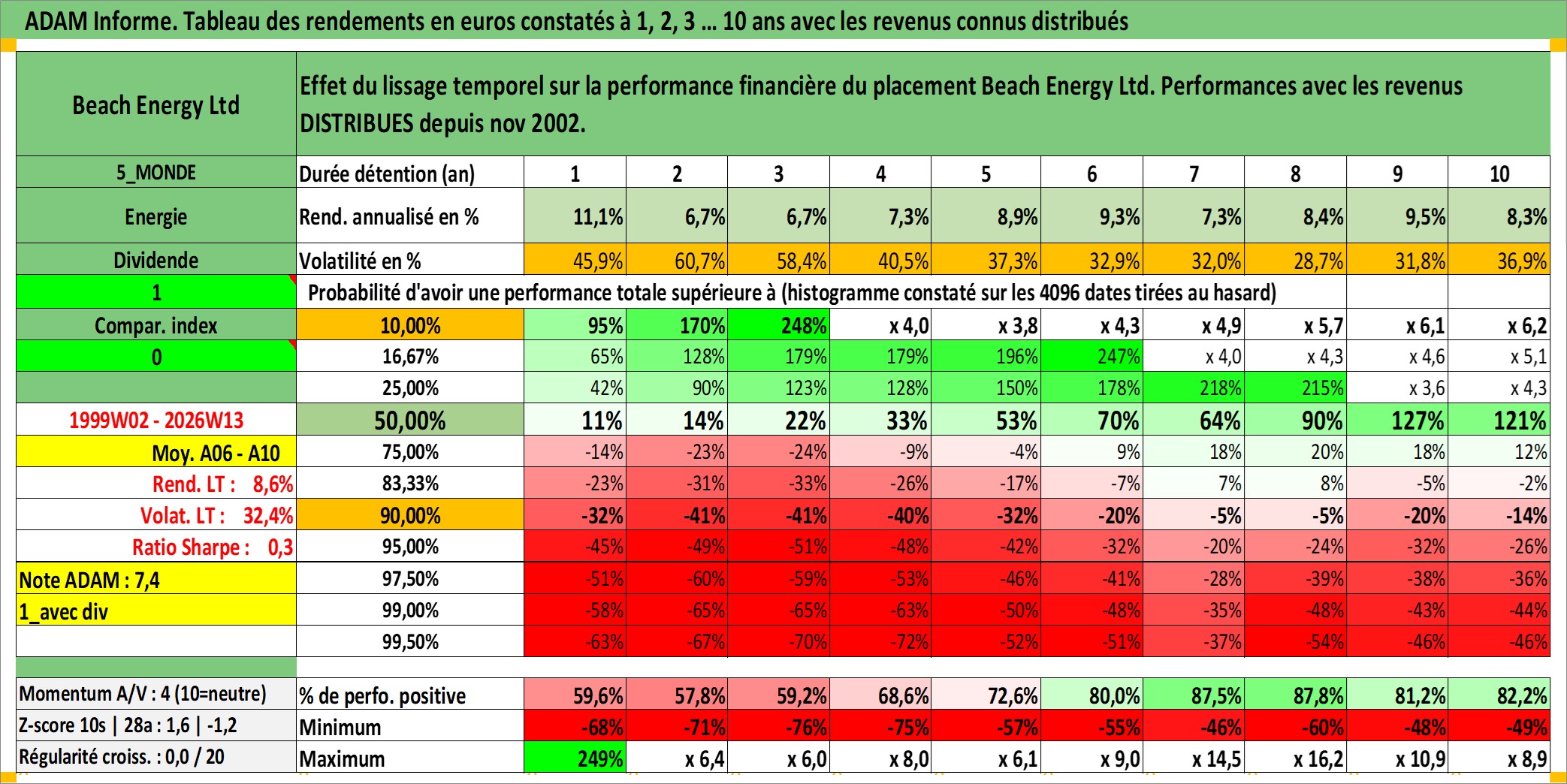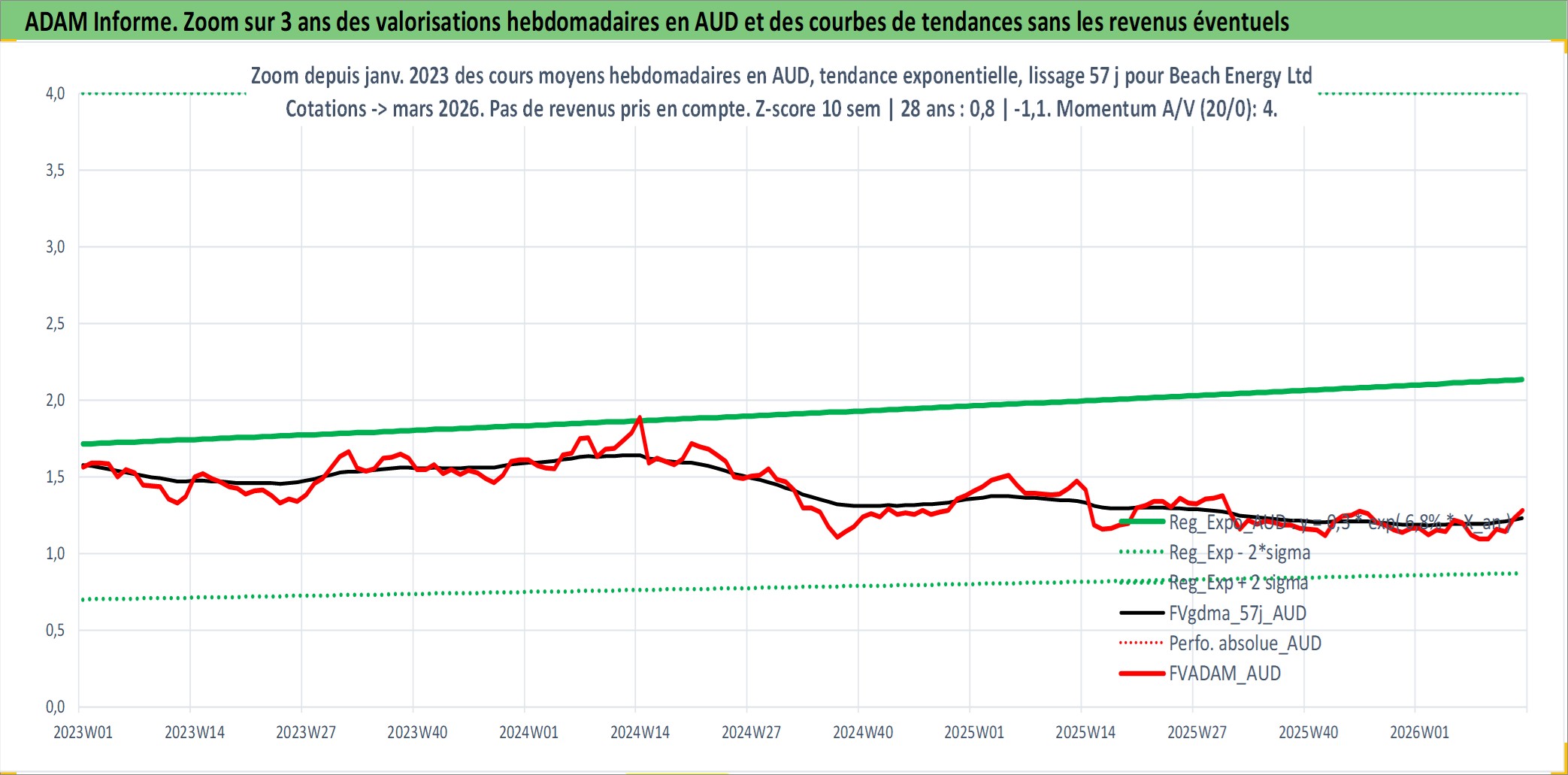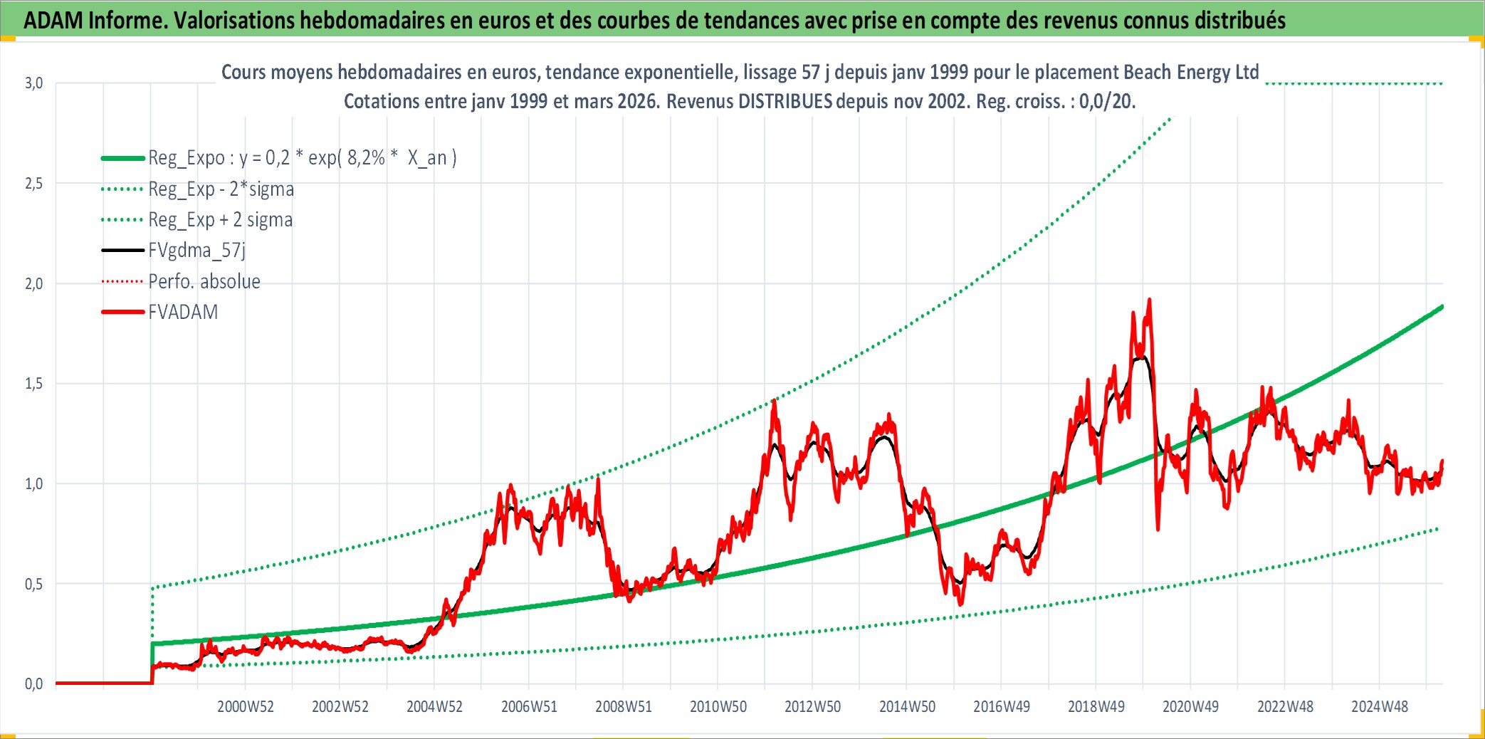Site dédié aux investisseursPage dédiée sur site financeAnalyse des valorisations hebdomadaires de l'action Beach Energy Ltd. Cet actif est cote en AUD. Les valorisations sont en contrevaleur EURO et couvrent les semaines 1999W02 a 2026W13. Les revenus de cet actif financier sont pris en compte depuis la semaine 2002W46. La note ESG de cet actif n'est pas connue.