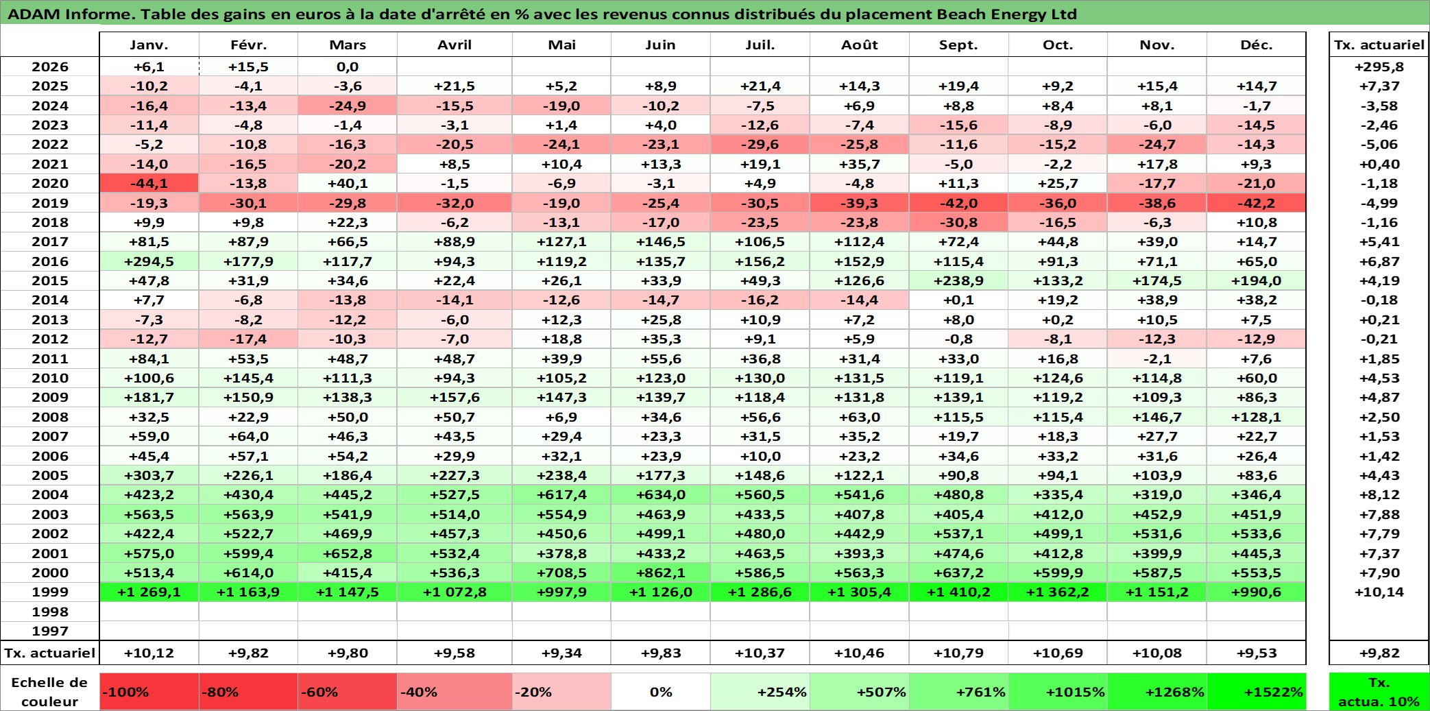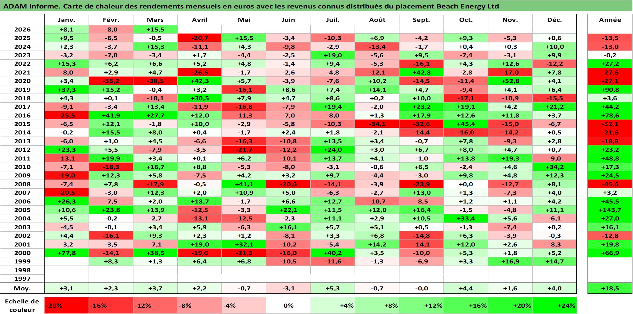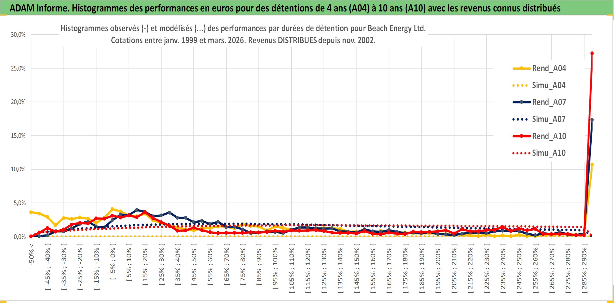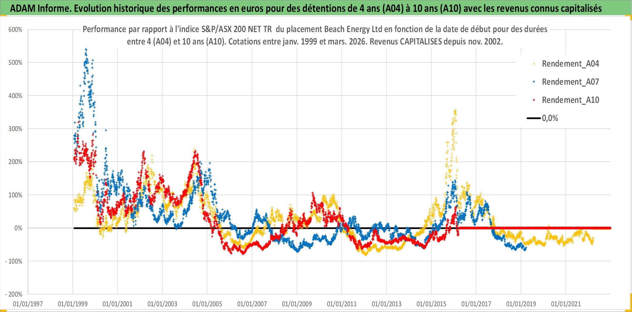 Site dédié aux investisseursPage dédiée sur site financeAnalyse des valorisations hebdomadaires de l'action Beach Energy Ltd. Cet actif est cote en AUD. Les valorisations sont en contrevaleur EURO et couvrent les semaines 1999W02 a 2026W13. Les revenus de cet actif financier sont pris en compte depuis la semaine 2002W46. La note ESG de cet actif n'est pas connue.