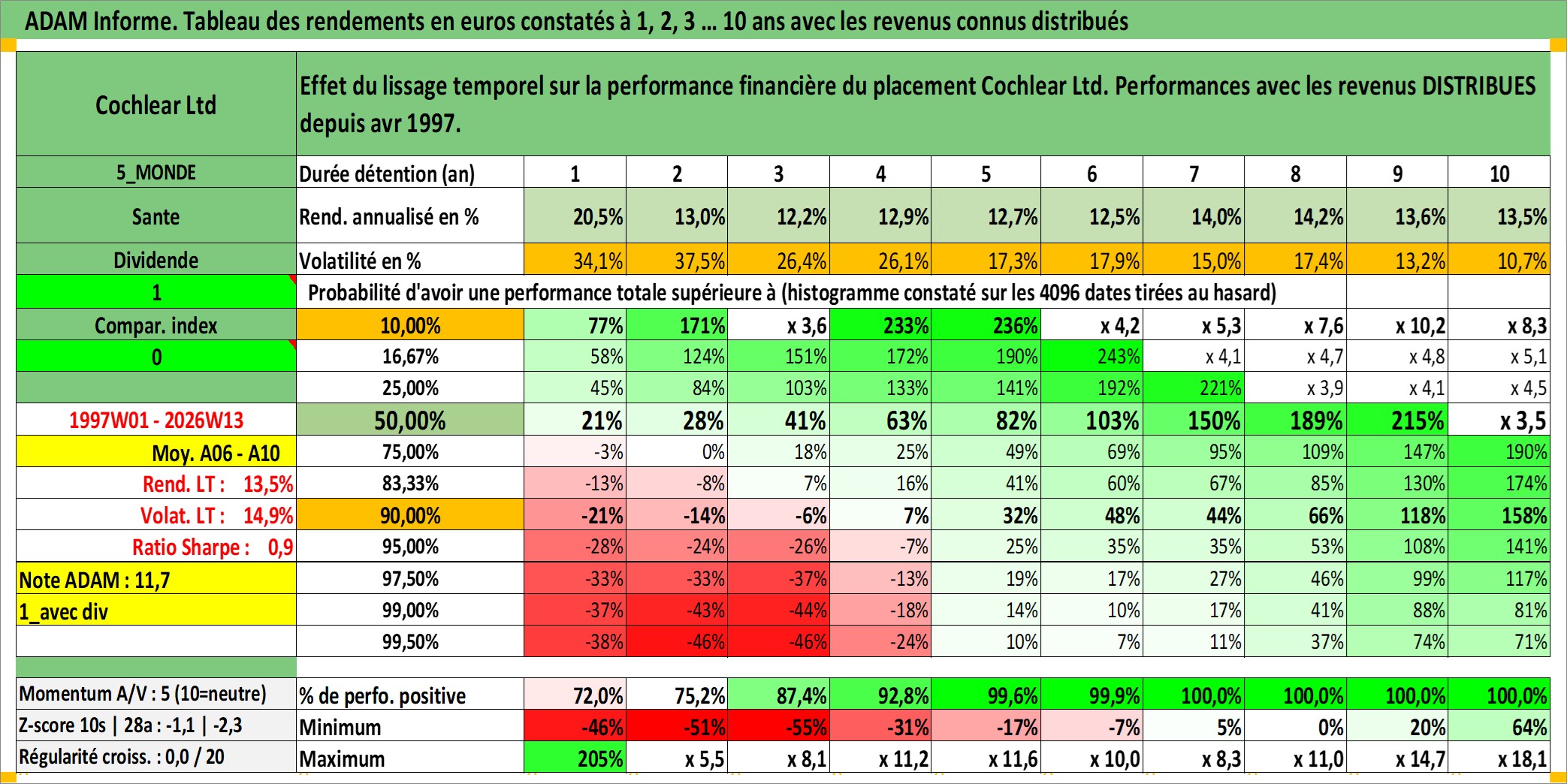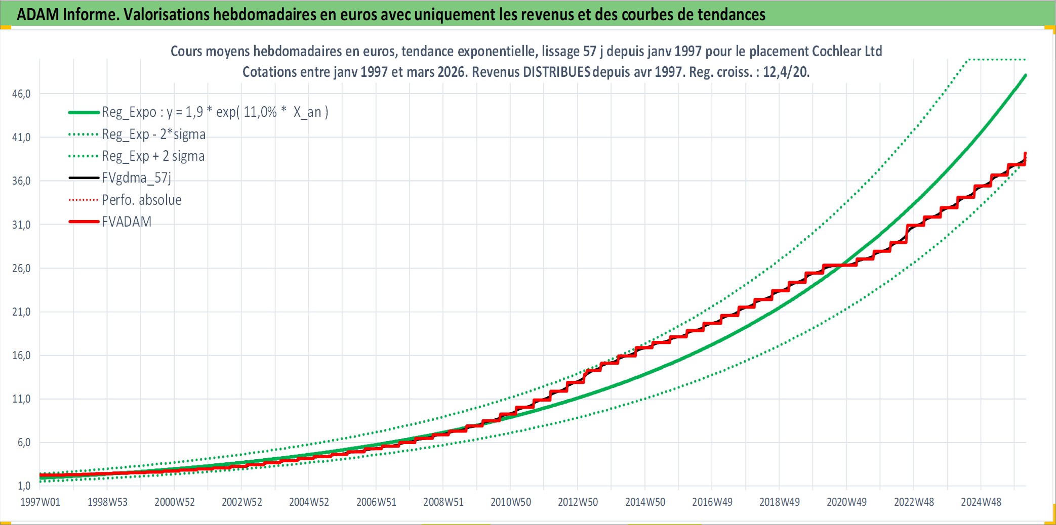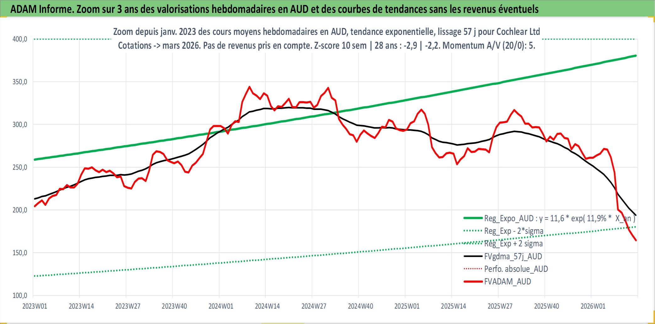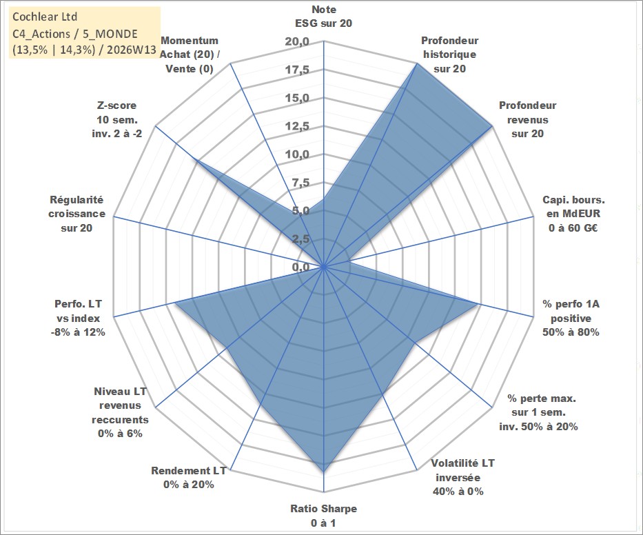 Site dédié aux investisseursPage dédiée sur site financeAnalyse des valorisations hebdomadaires de l'action Cochlear Ltd. Cet actif est cote en AUD. Les valorisations sont en contrevaleur EURO et couvrent les semaines 1997W01 a 2026W13. Les revenus de cet actif financier sont pris en compte depuis la semaine 1997W14. La note globale ESG de cet actif est estimee a 6.0 (apres rebasage entre 0 et 20).