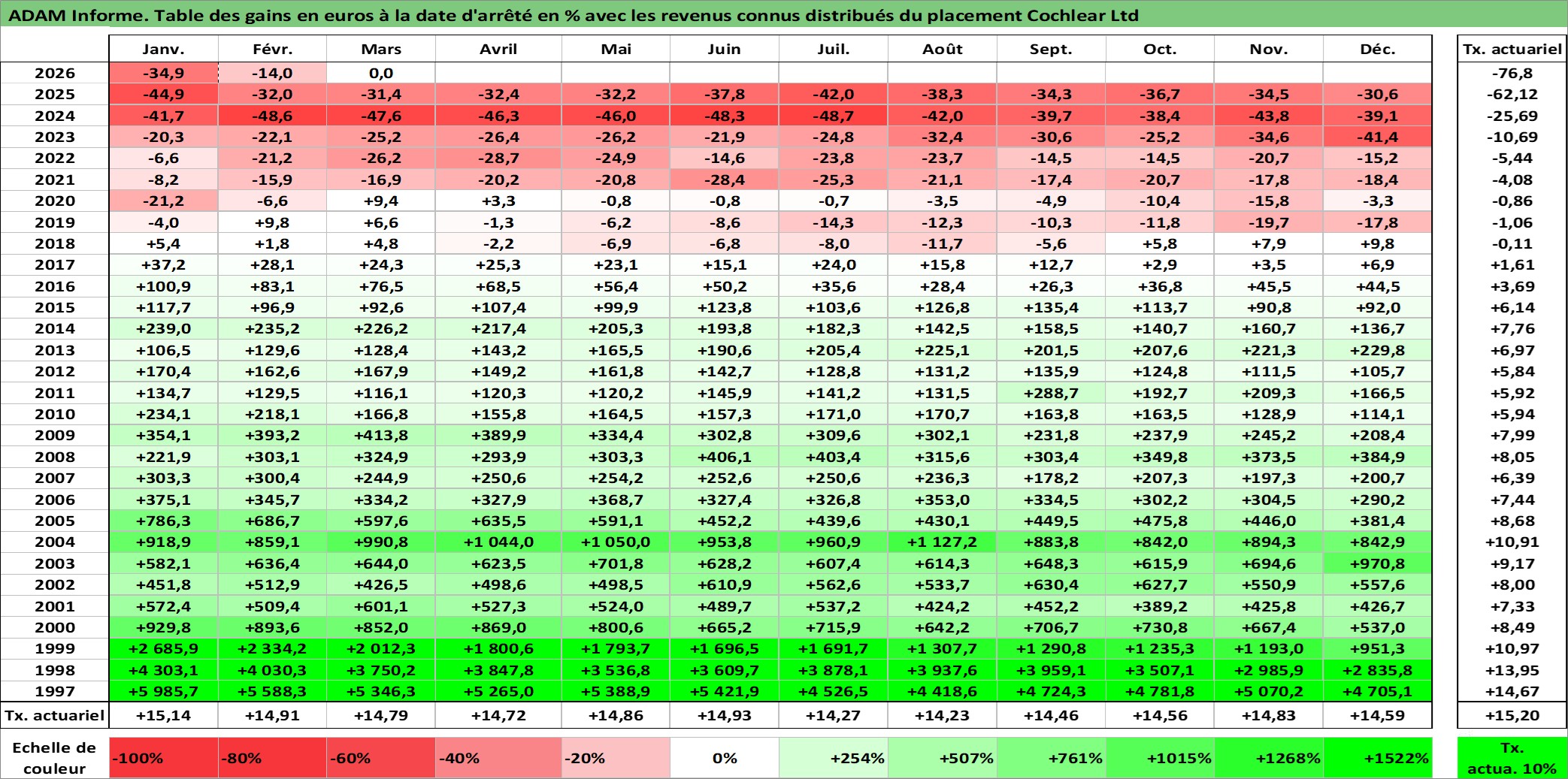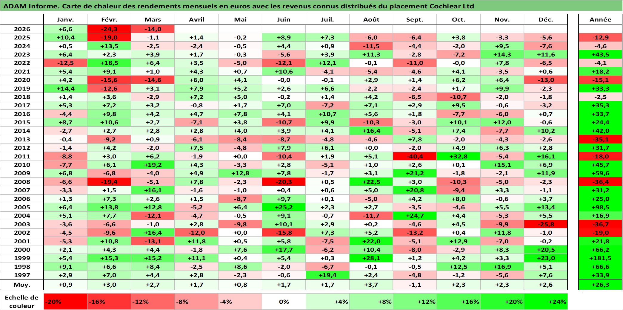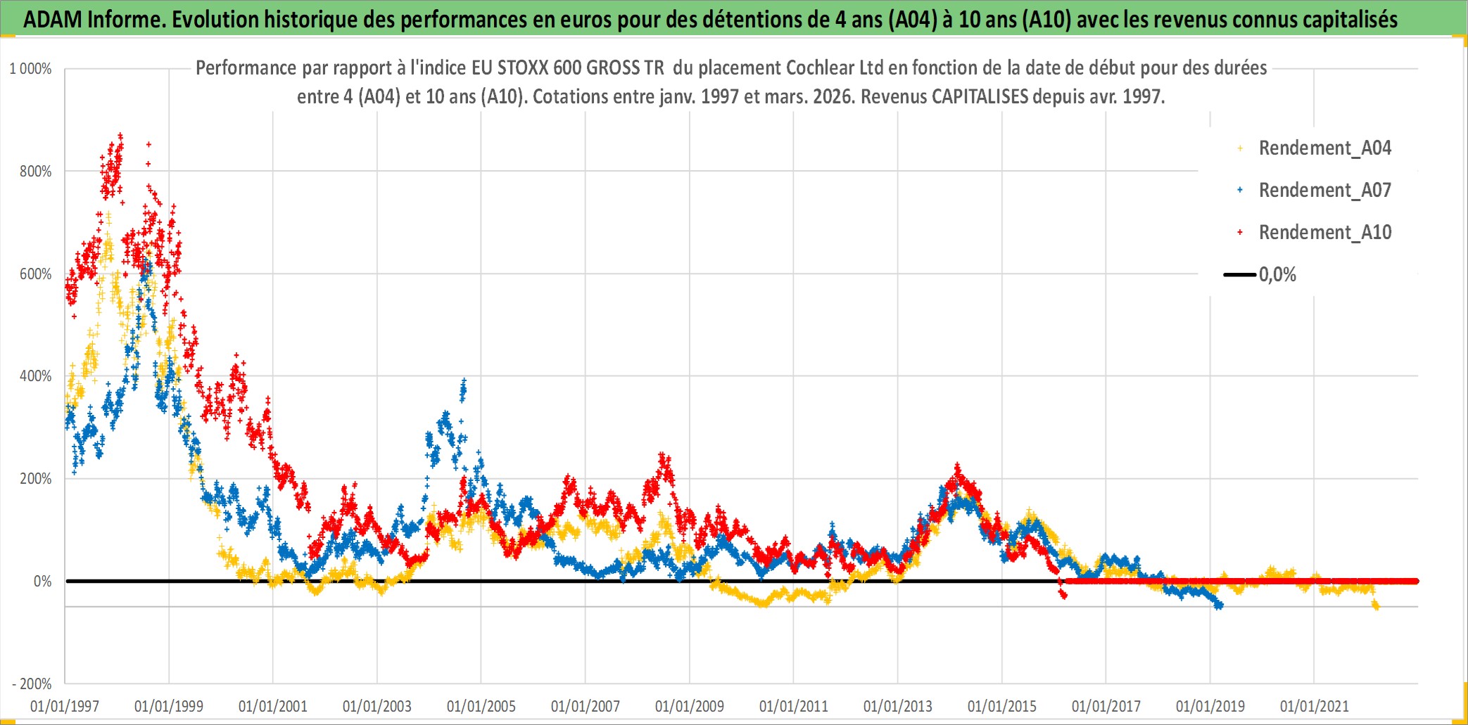 Site dédié aux investisseursPage dédiée sur site financeAnalyse des valorisations hebdomadaires de l'action Cochlear Ltd. Cet actif est cote en AUD. Les valorisations sont en contrevaleur EURO et couvrent les semaines 1997W01 a 2026W13. Les revenus de cet actif financier sont pris en compte depuis la semaine 1997W14. La note globale ESG de cet actif est estimee a 6.0 (apres rebasage entre 0 et 20).