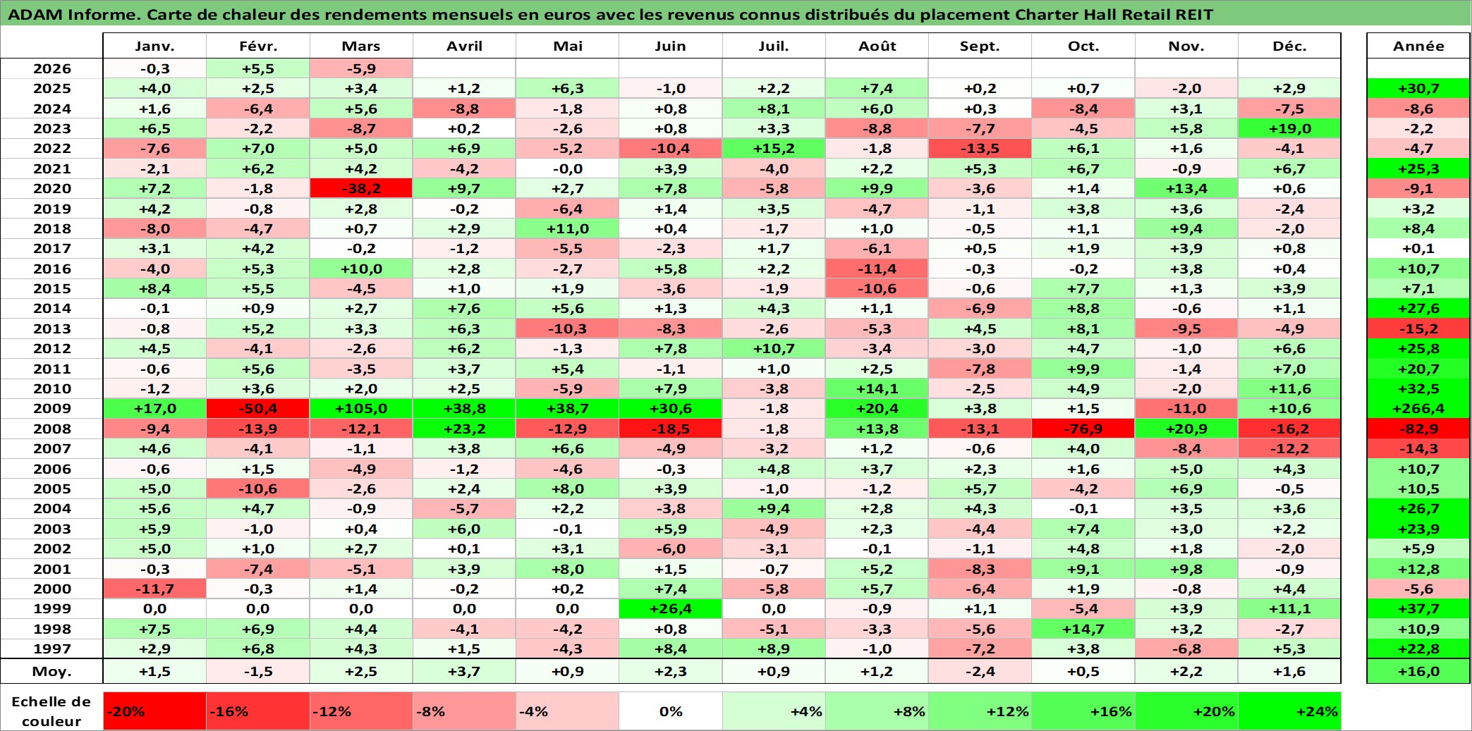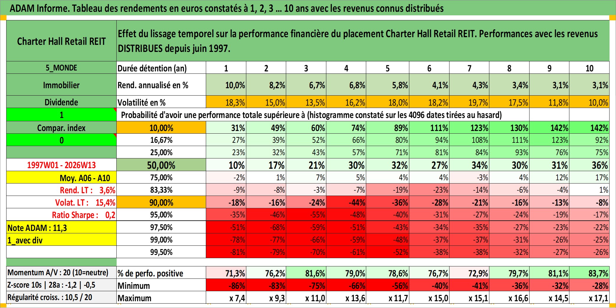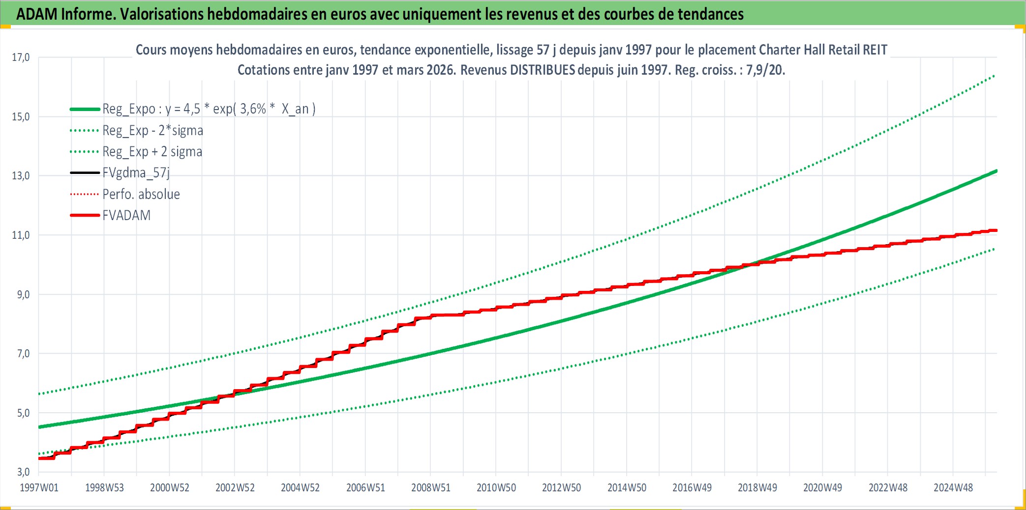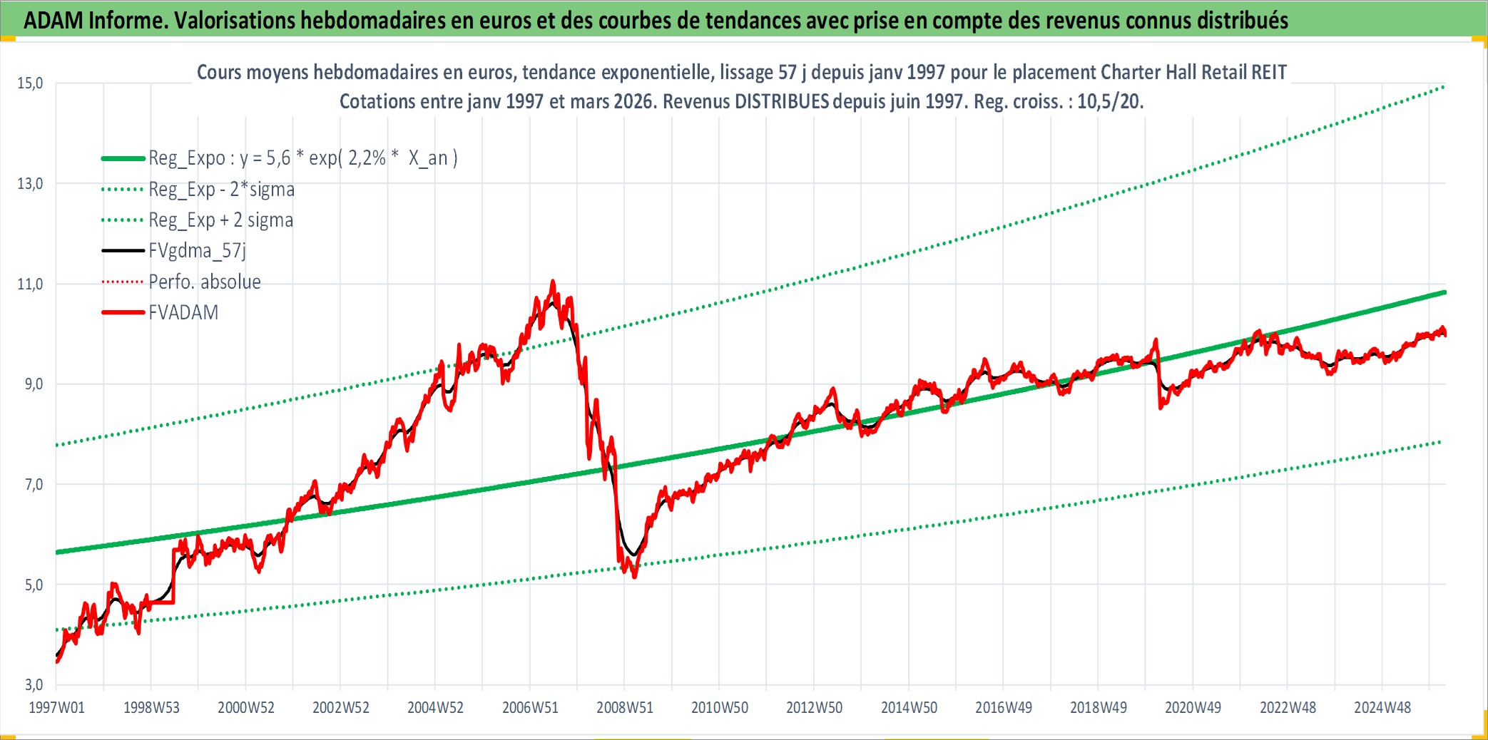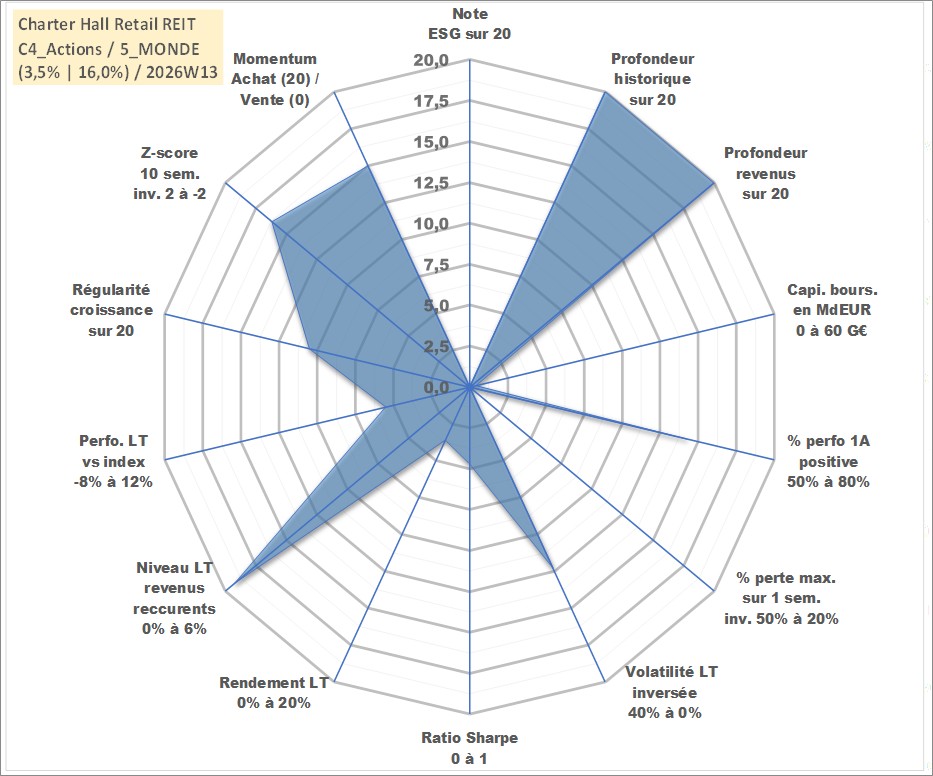 Site dédié aux investisseursPage dédiée sur site financeAnalyse des valorisations hebdomadaires de l'action Charter Hall Retail REIT. Cet actif est cote en AUD. Les valorisations sont en contrevaleur EURO et couvrent les semaines 1997W01 a 2026W13. Les revenus de cet actif financier sont pris en compte depuis la semaine 1997W26. La note ESG de cet actif n'est pas connue.