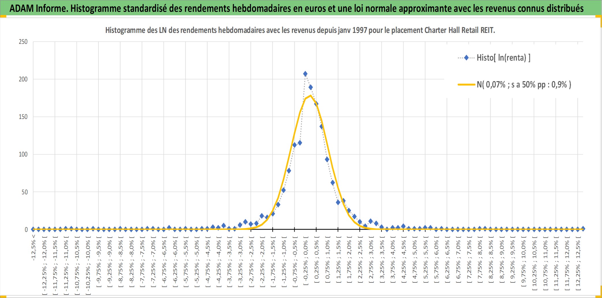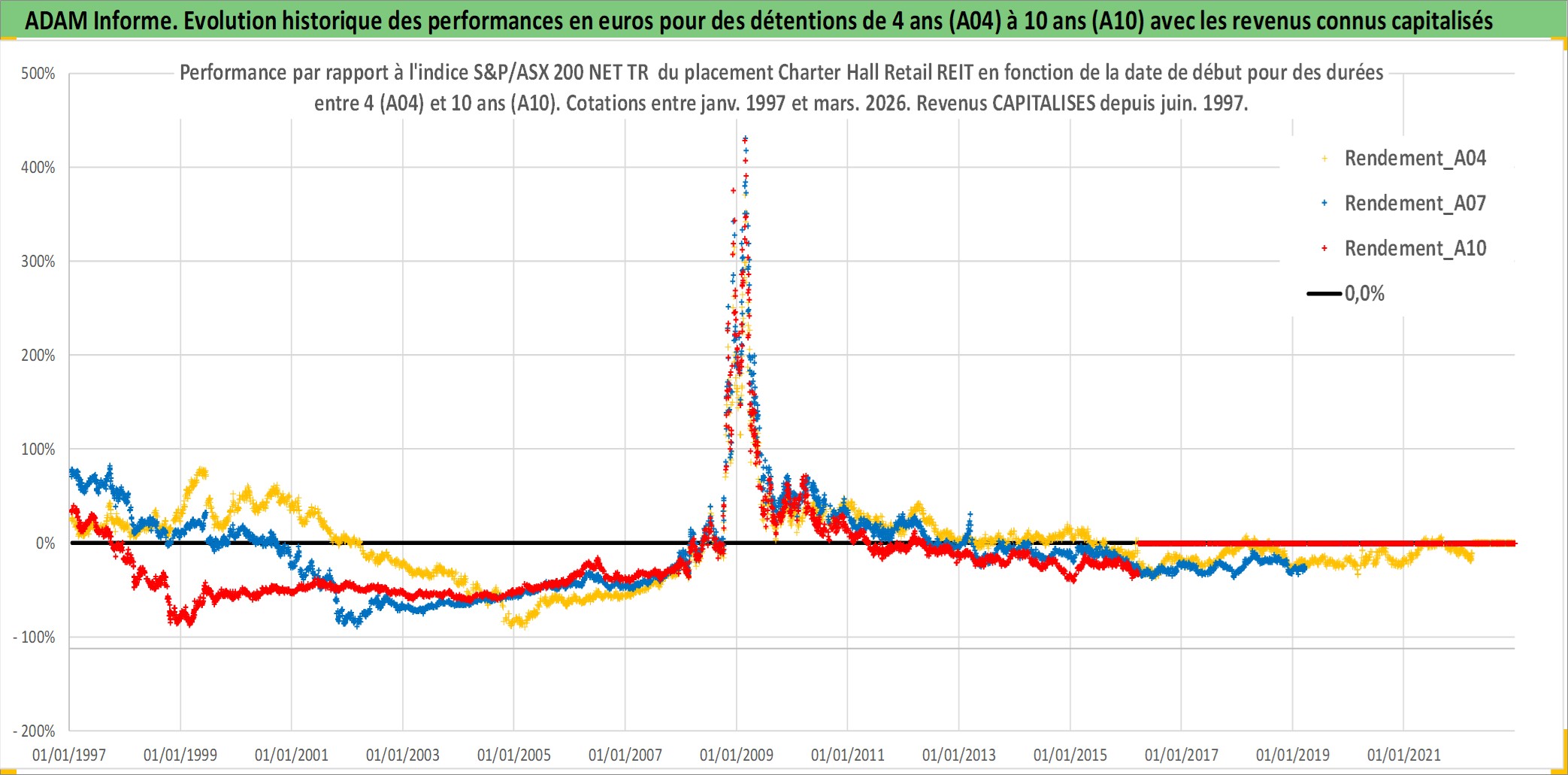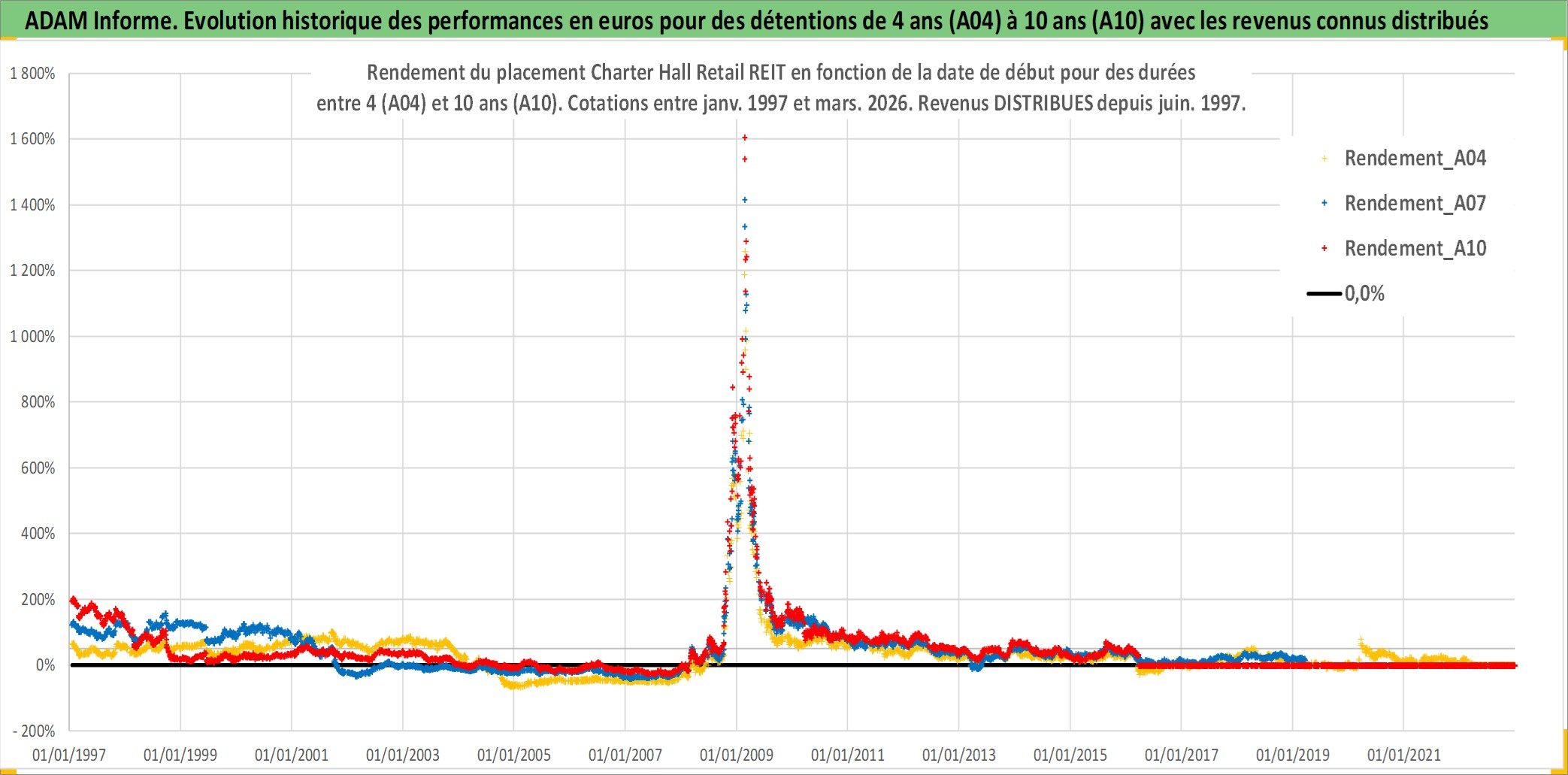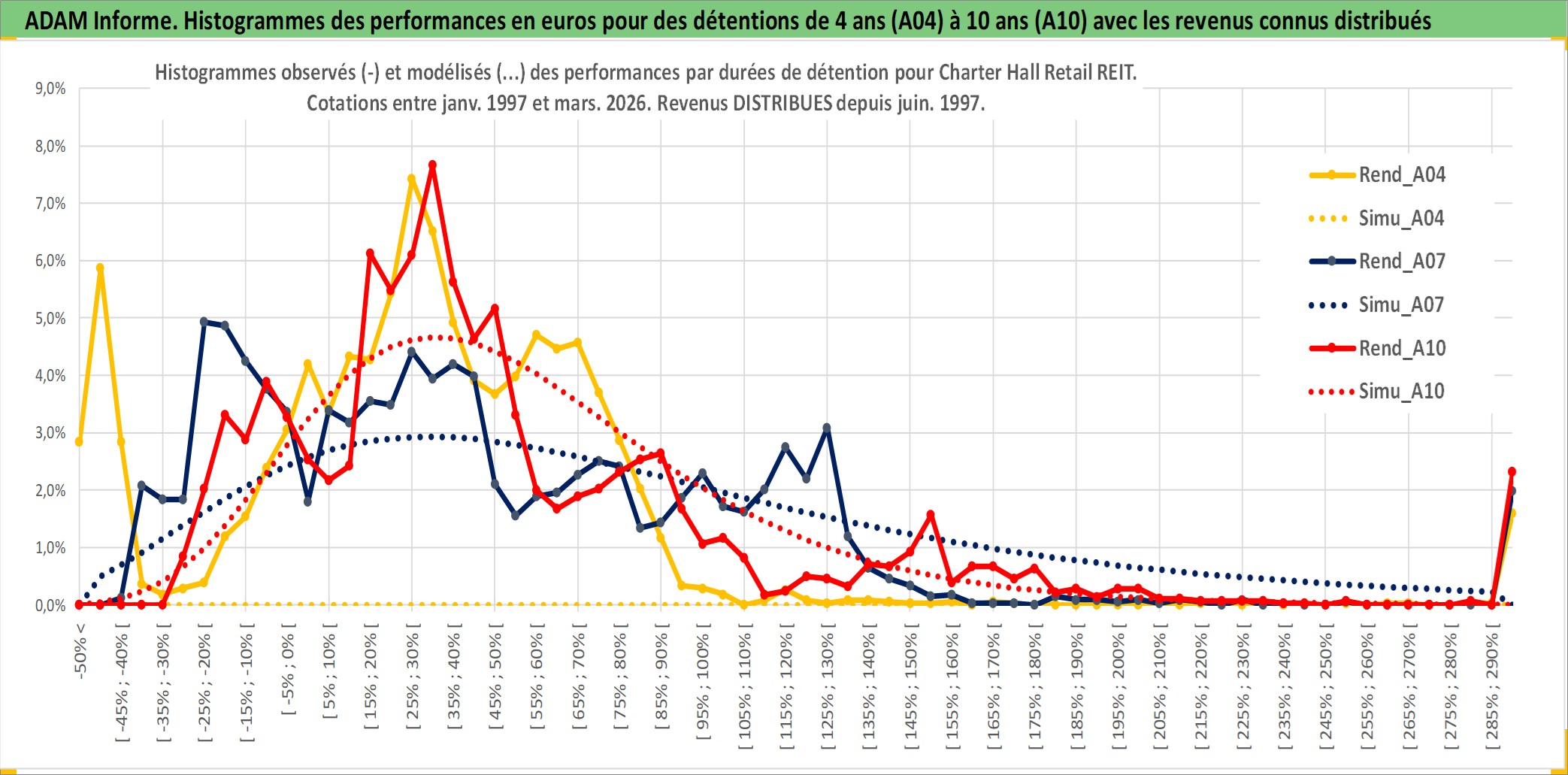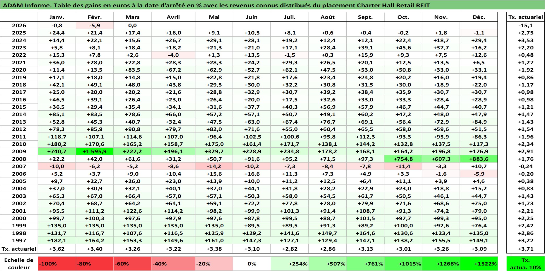 Site dédié aux investisseursPage dédiée sur site financeAnalyse des valorisations hebdomadaires de l'action Charter Hall Retail REIT. Cet actif est cote en AUD. Les valorisations sont en contrevaleur EURO et couvrent les semaines 1997W01 a 2026W13. Les revenus de cet actif financier sont pris en compte depuis la semaine 1997W26. La note ESG de cet actif n'est pas connue.