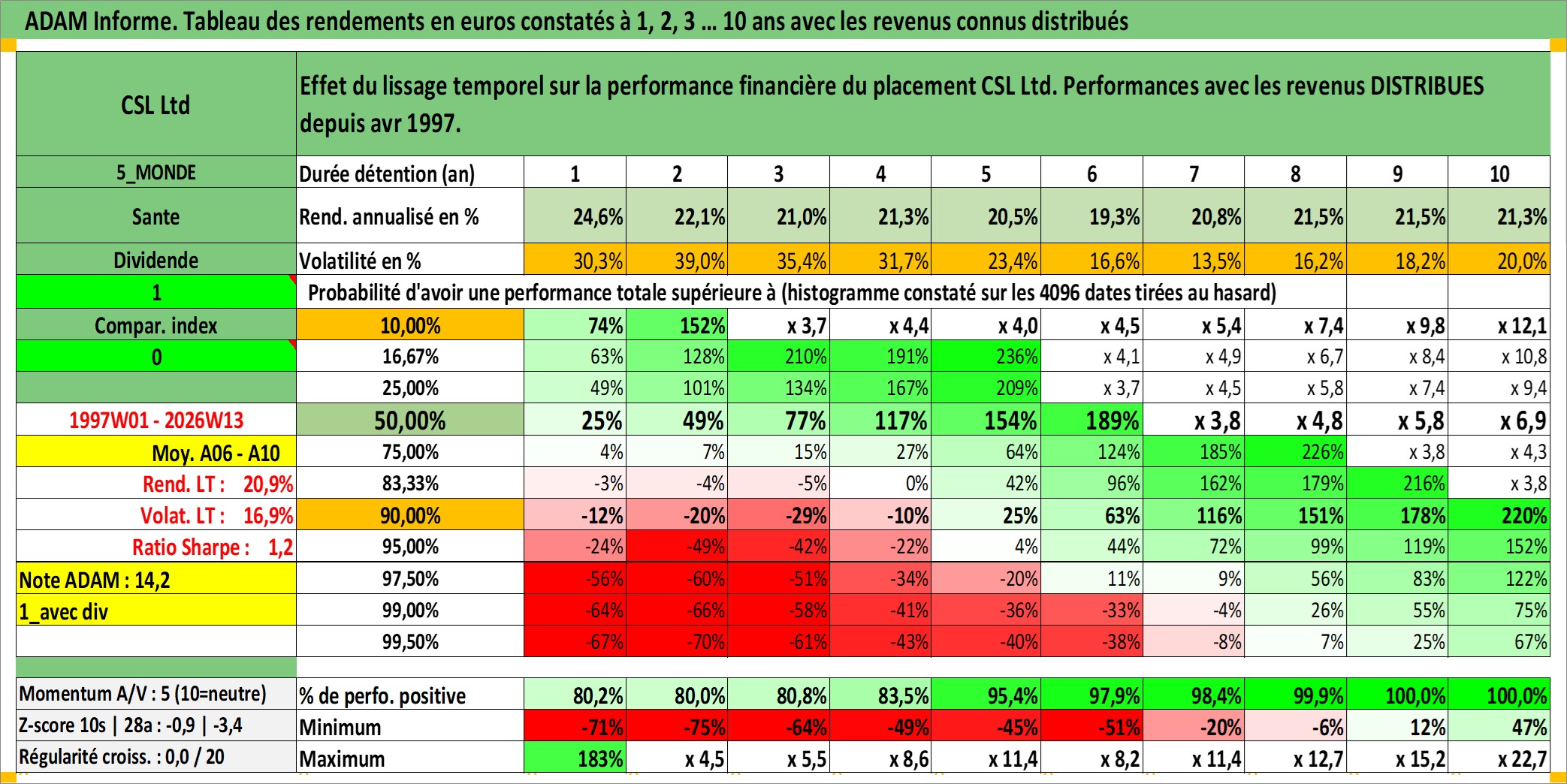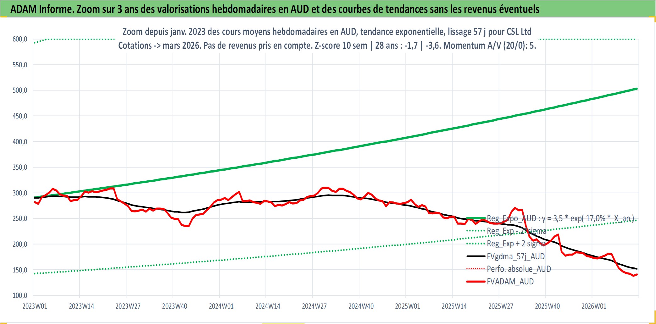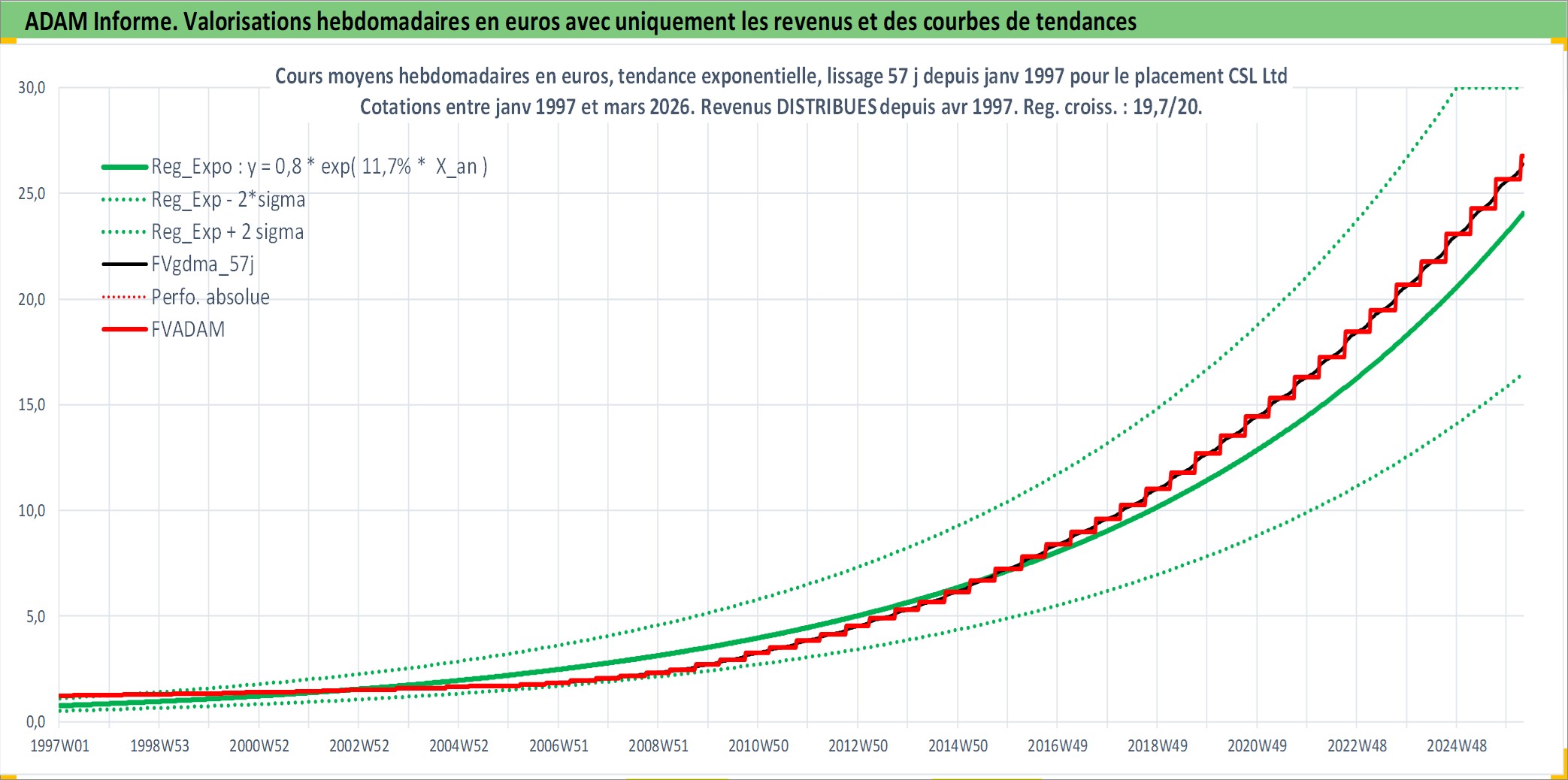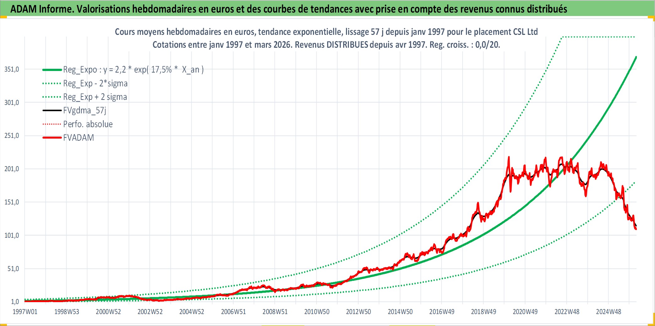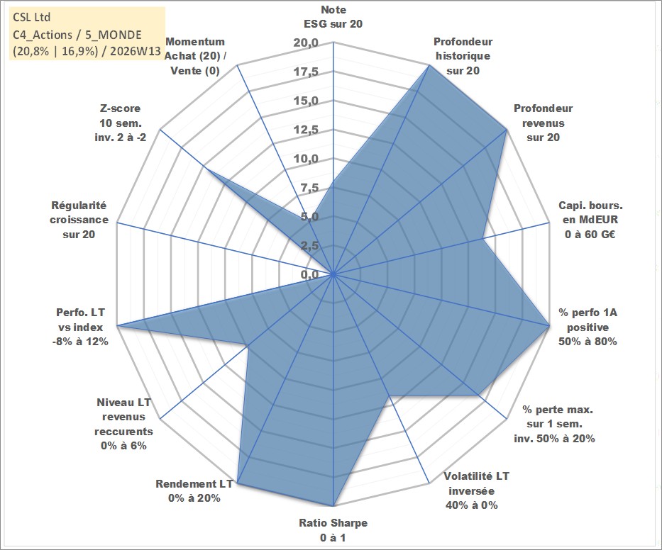 Site dédié aux investisseursPage dédiée sur site financeAnalyse des valorisations hebdomadaires de l'action CSL Ltd. Cet actif est cote en AUD. Les valorisations sont en contrevaleur EURO et couvrent les semaines 1997W01 a 2026W13. Les revenus de cet actif financier sont pris en compte depuis la semaine 1997W15. La note globale ESG de cet actif est estimee a 8.0 (apres rebasage entre 0 et 20).