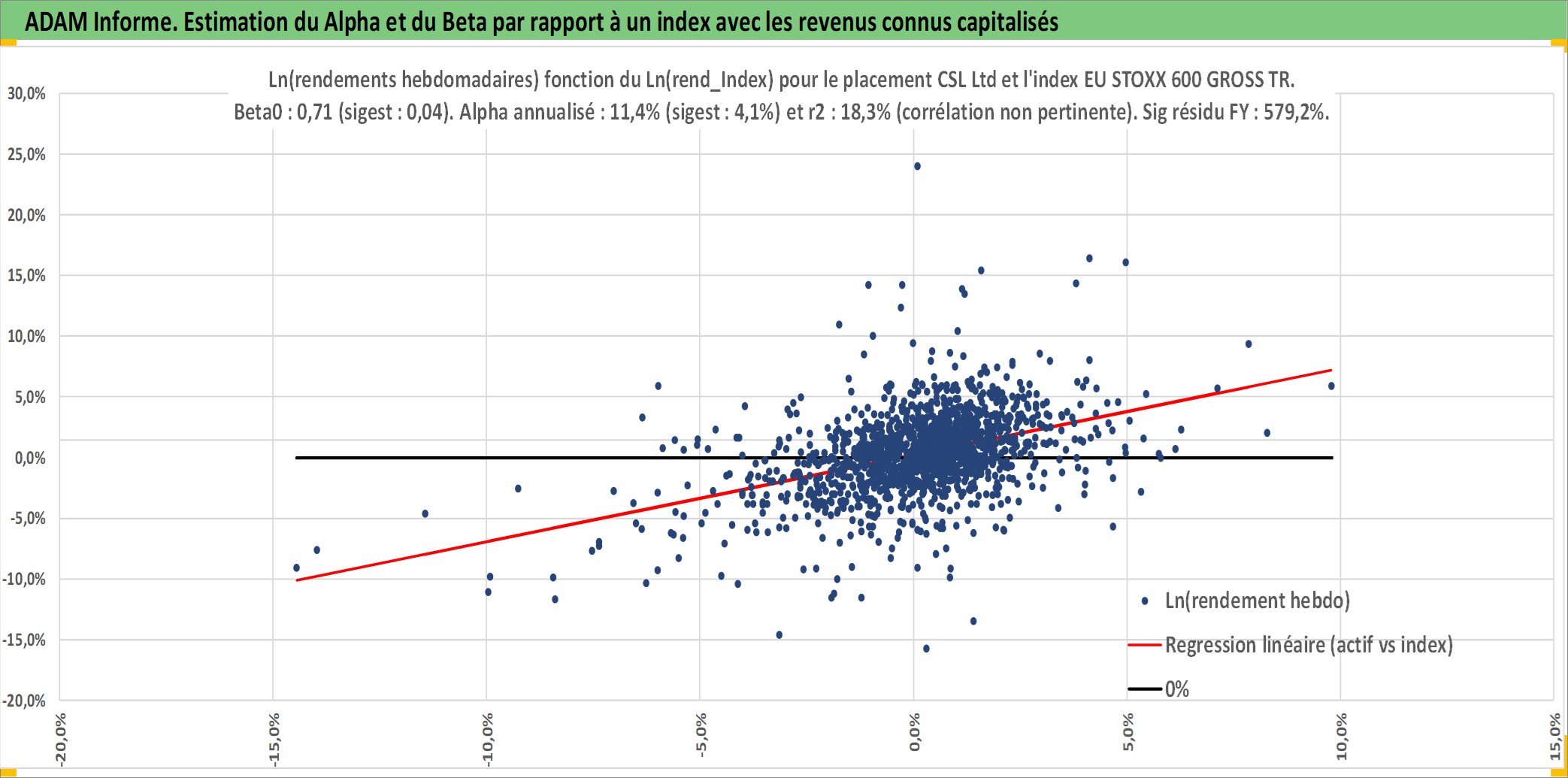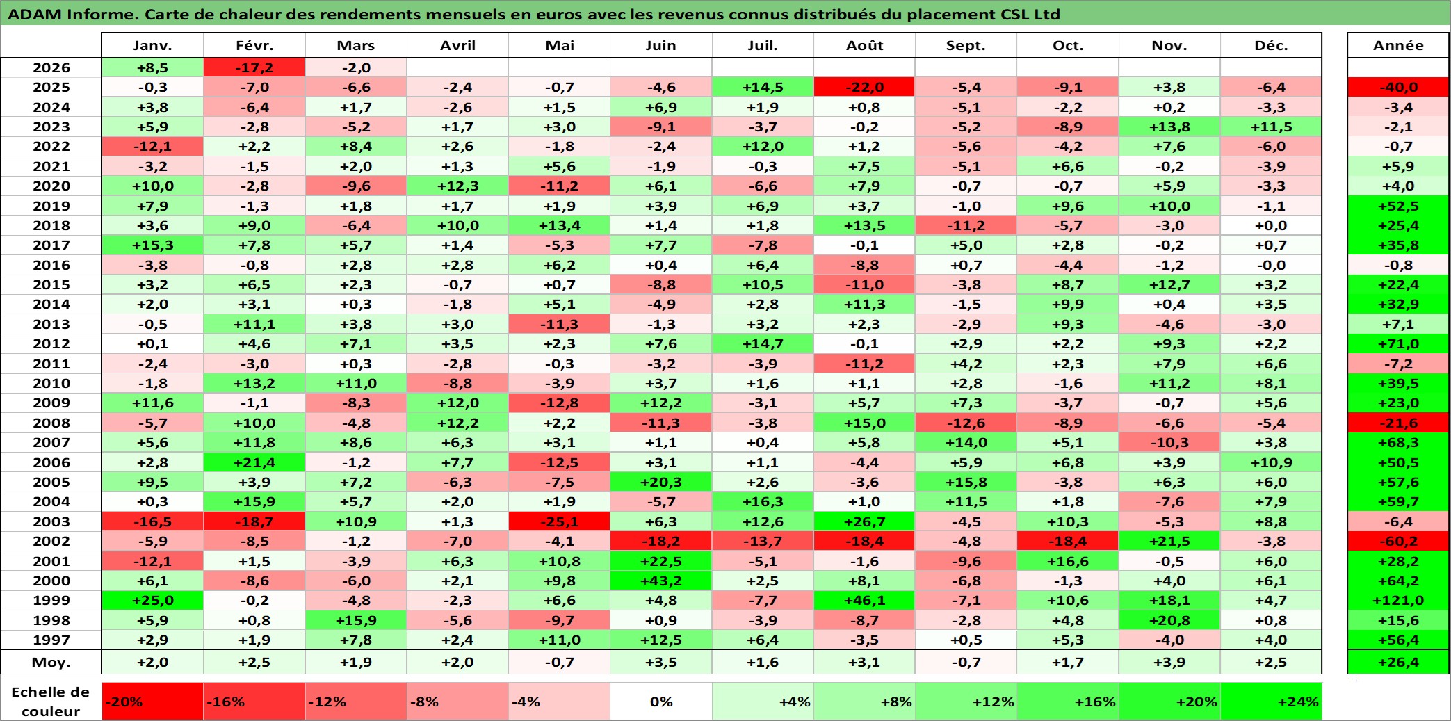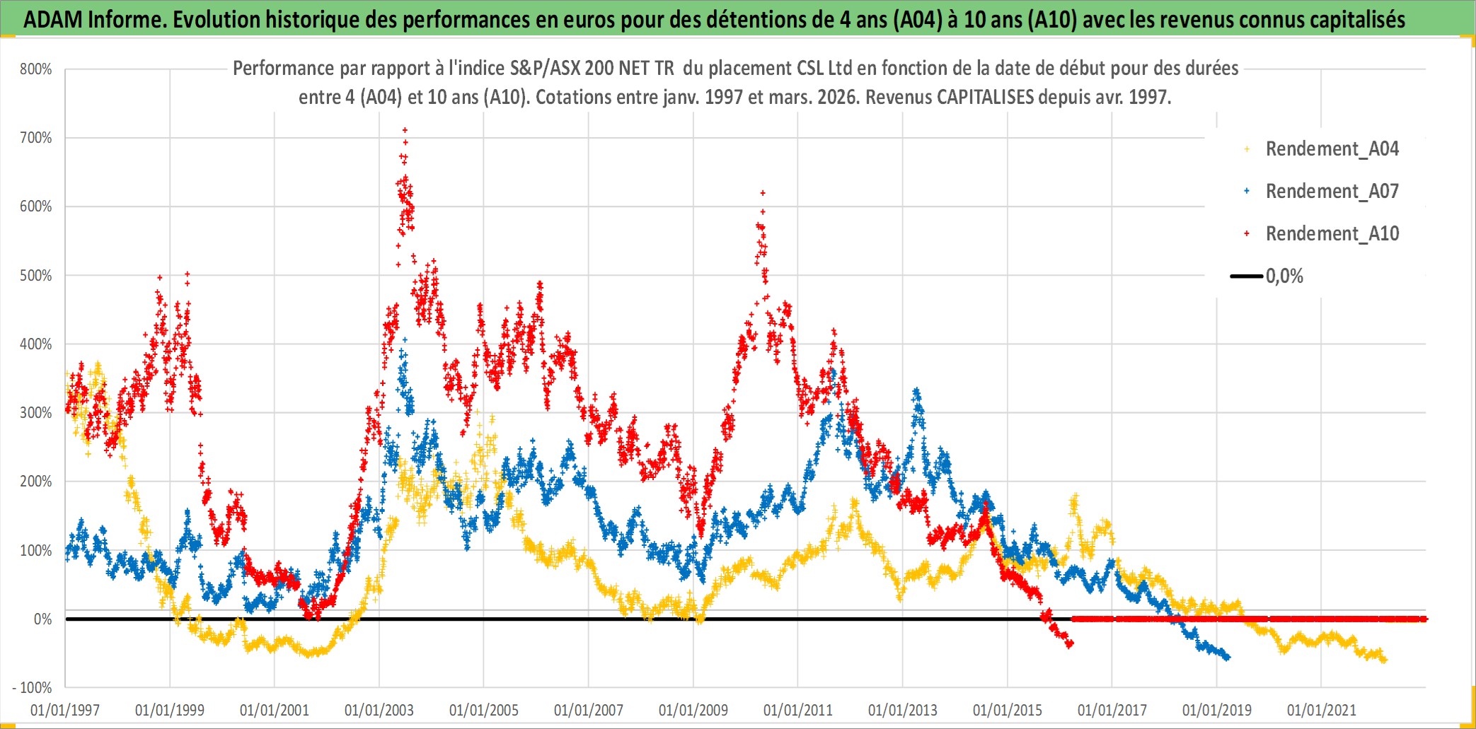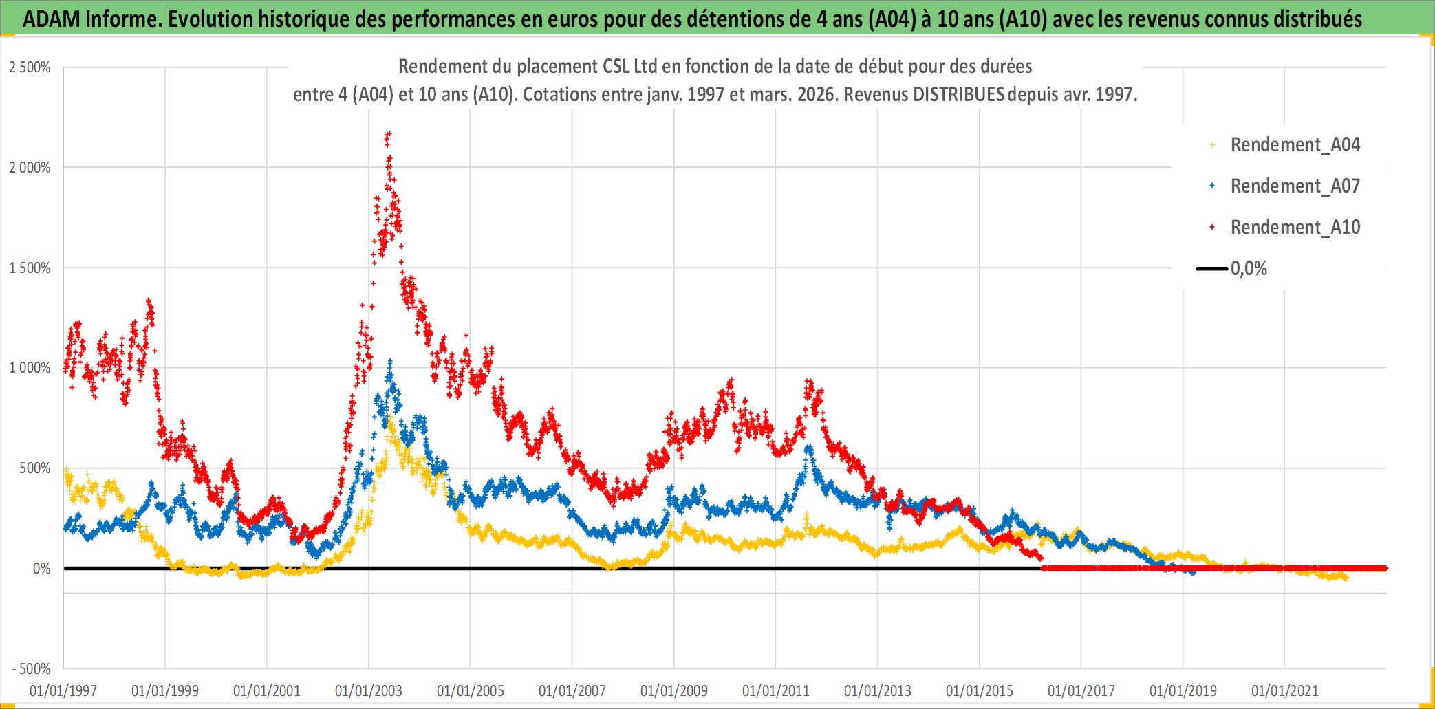 Site dédié aux investisseursPage dédiée sur site financeAnalyse des valorisations hebdomadaires de l'action CSL Ltd. Cet actif est cote en AUD. Les valorisations sont en contrevaleur EURO et couvrent les semaines 1997W01 a 2026W13. Les revenus de cet actif financier sont pris en compte depuis la semaine 1997W15. La note globale ESG de cet actif est estimee a 8.0 (apres rebasage entre 0 et 20).