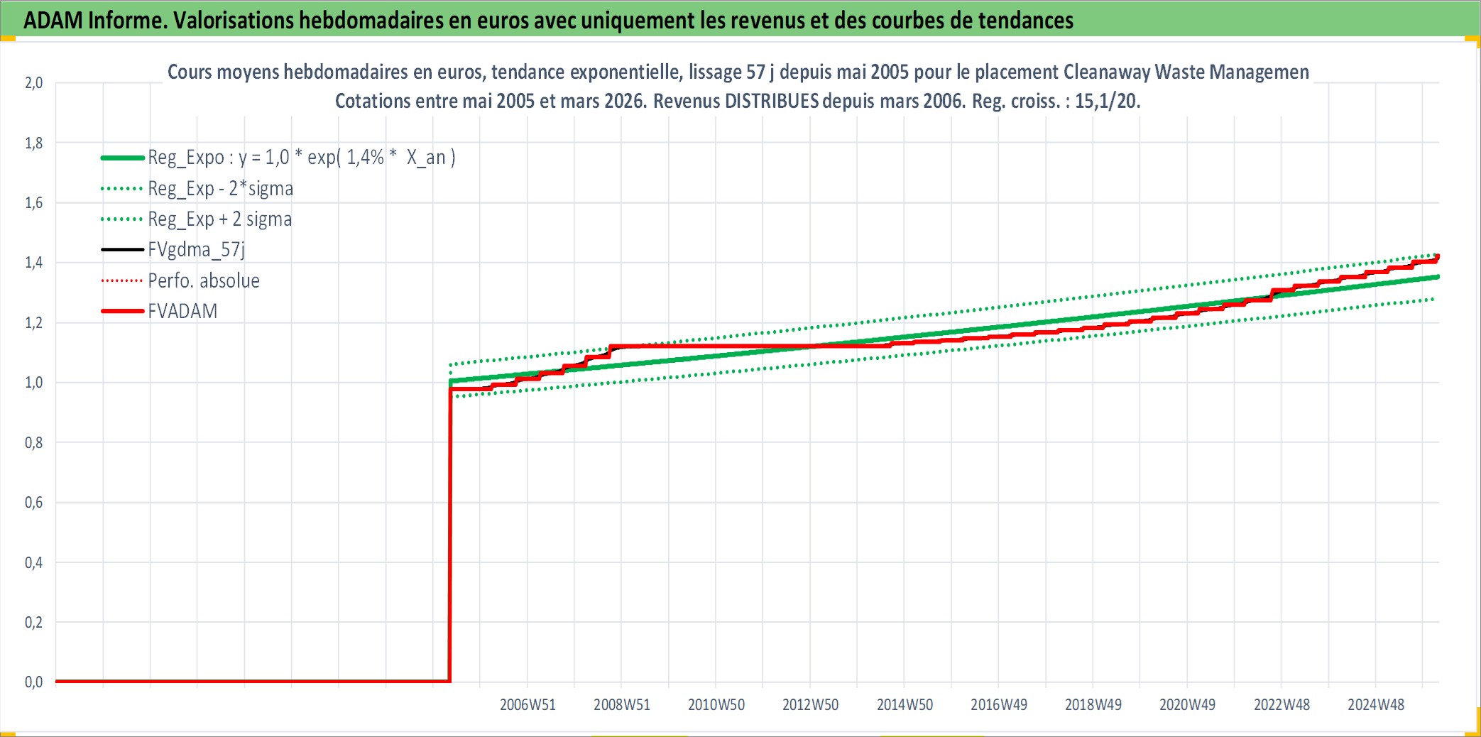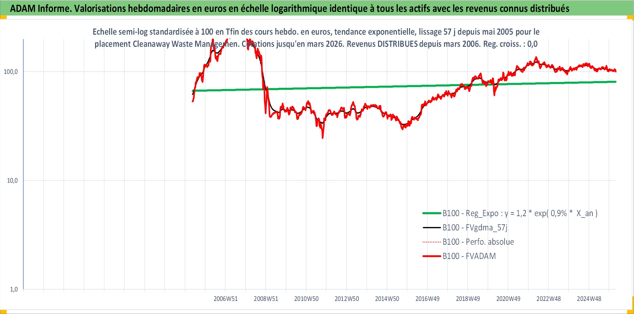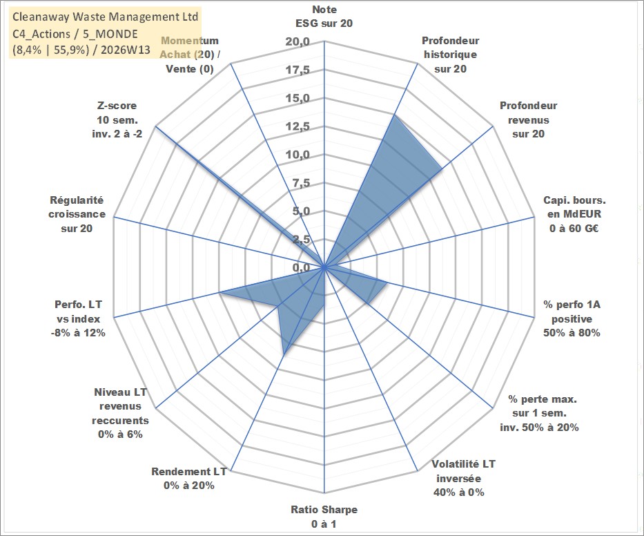 Site dédié aux investisseursPage dédiée sur site financeAnalyse des valorisations hebdomadaires de l'action Cleanaway Waste Management Ltd. Cet actif est cote en AUD. Les valorisations sont en contrevaleur EURO et couvrent les semaines 2005W18 a 2026W13. Les revenus de cet actif financier sont pris en compte depuis la semaine 2006W12. La note ESG de cet actif n'est pas connue.