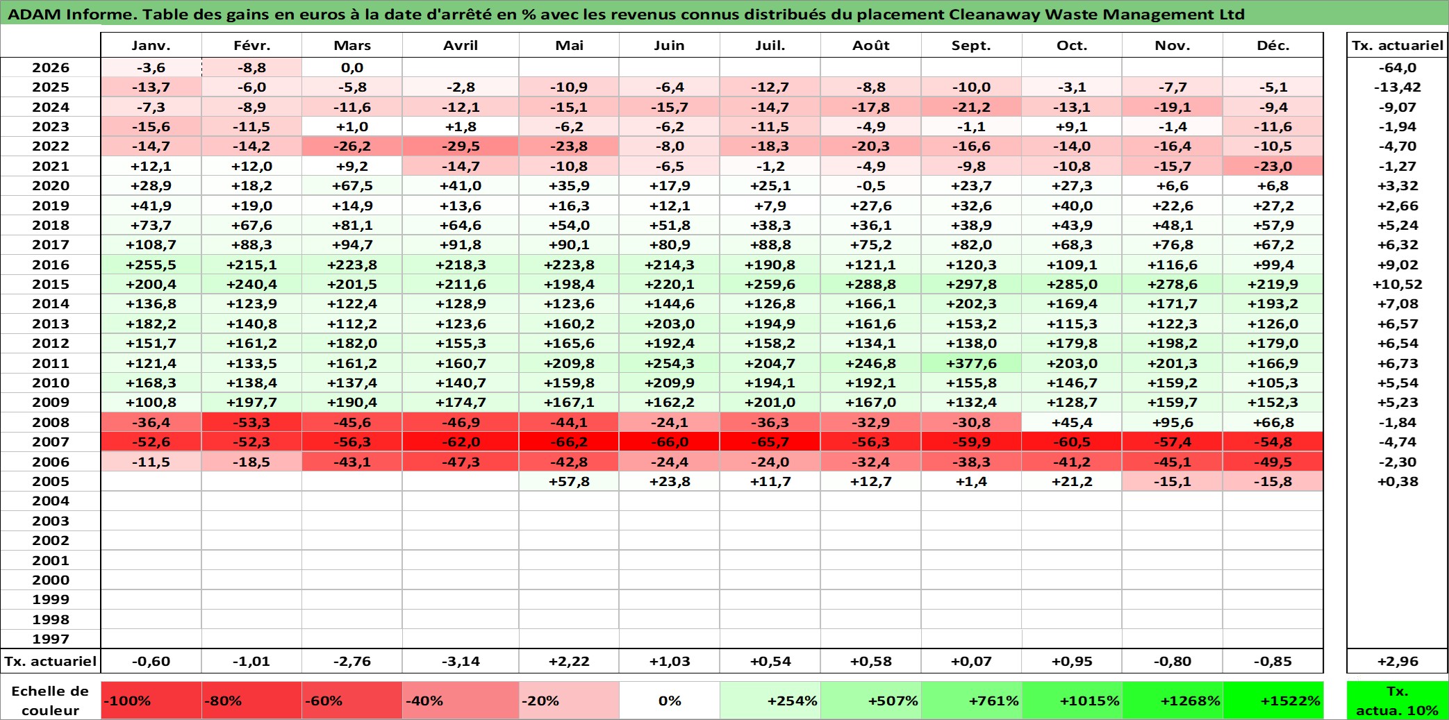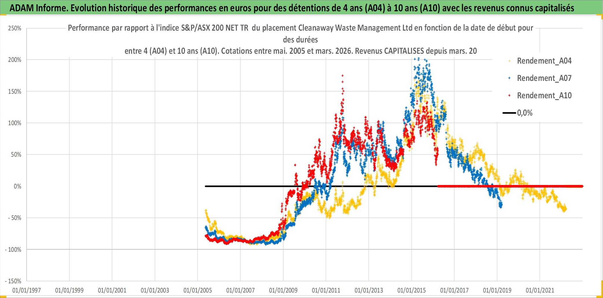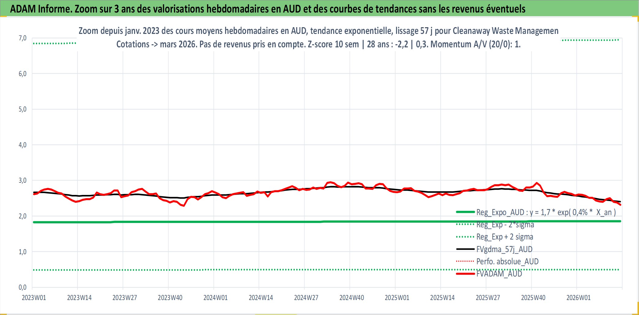 Site dédié aux investisseursPage dédiée sur site financeAnalyse des valorisations hebdomadaires de l'action Cleanaway Waste Management Ltd. Cet actif est cote en AUD. Les valorisations sont en contrevaleur EURO et couvrent les semaines 2005W18 a 2026W13. Les revenus de cet actif financier sont pris en compte depuis la semaine 2006W12. La note ESG de cet actif n'est pas connue.