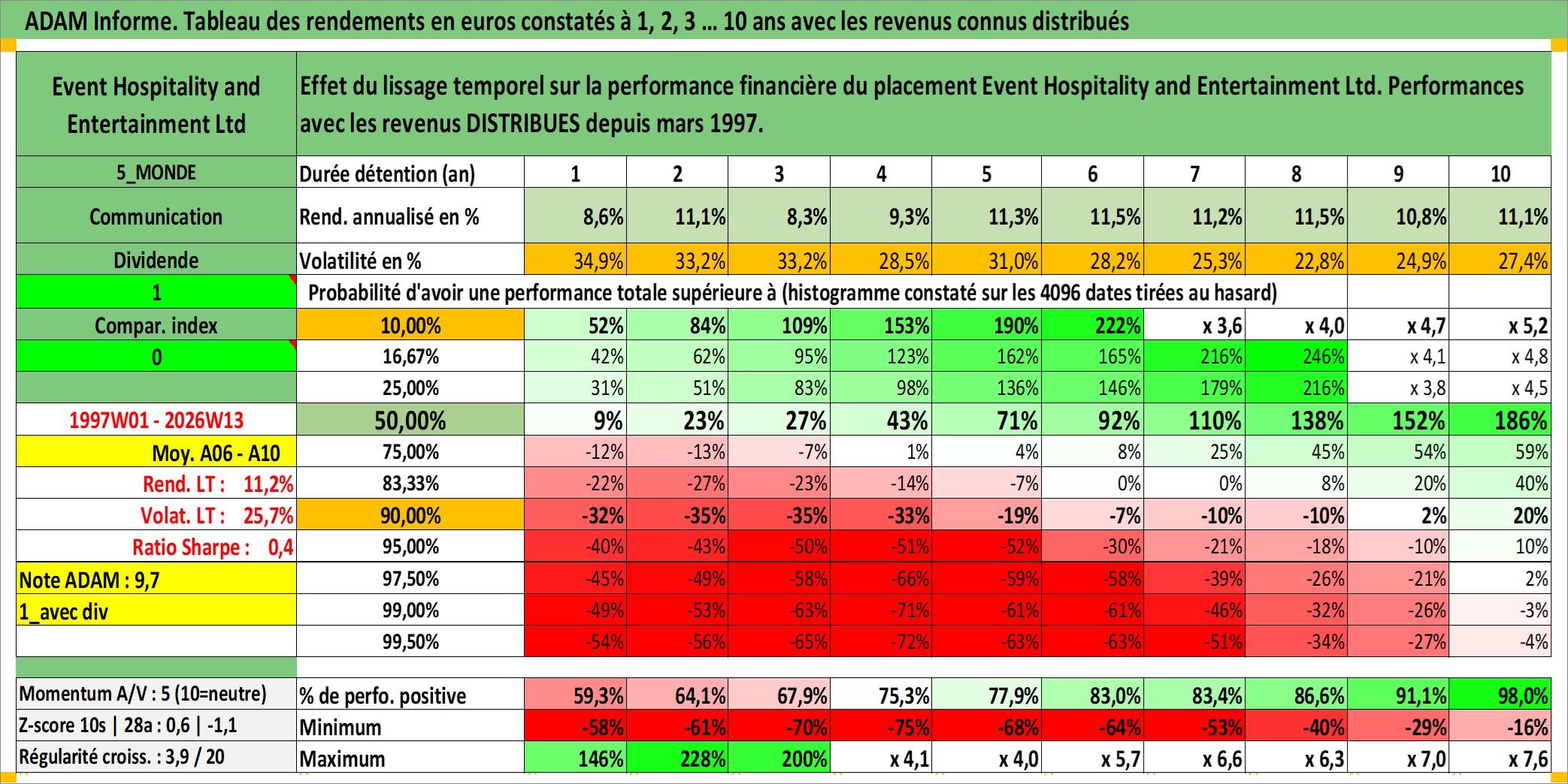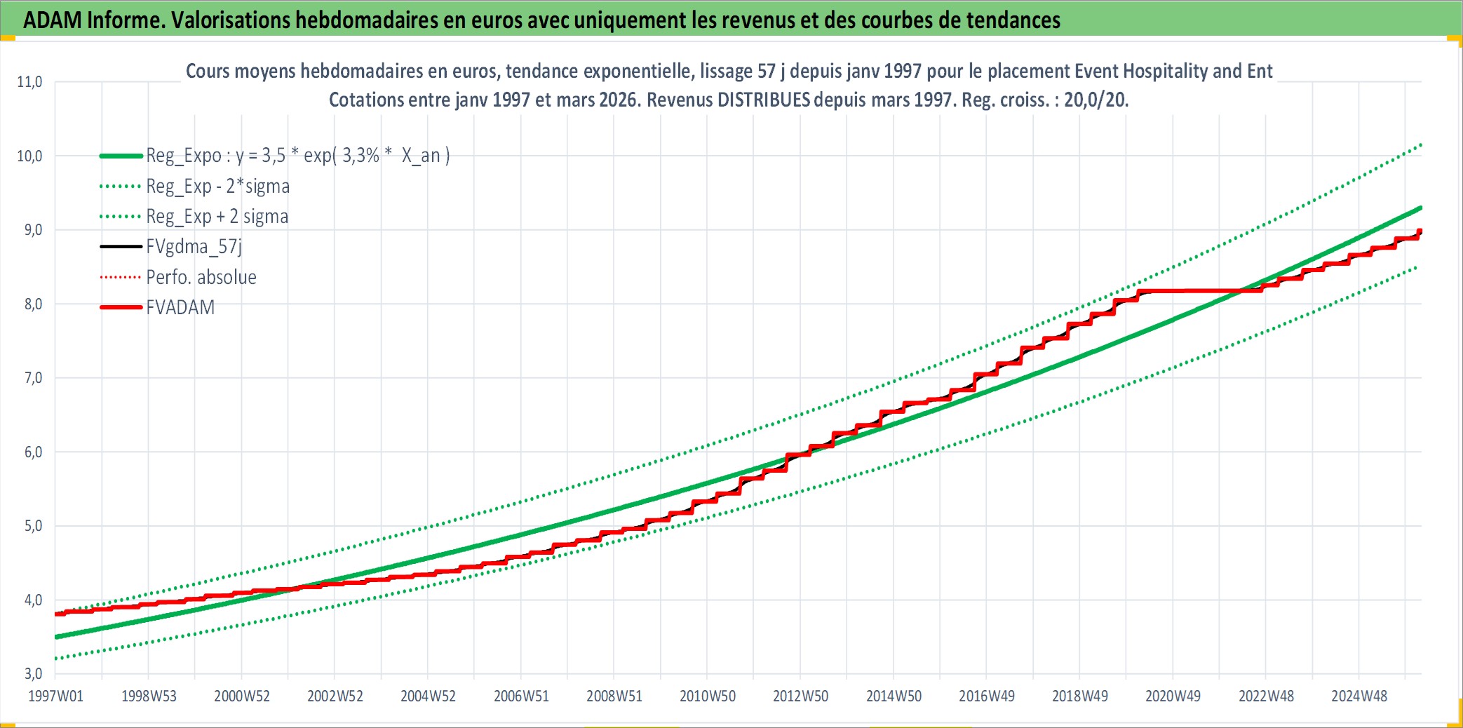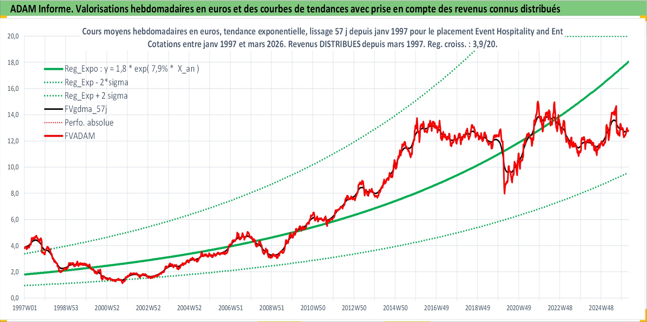 Site dédié aux investisseursPage dédiée sur site financeAnalyse des valorisations hebdomadaires de l'action Event Hospitality and Entertainment Ltd. Cet actif est cote en AUD. Les valorisations sont en contrevaleur EURO et couvrent les semaines 1997W01 a 2026W13. Les revenus de cet actif financier sont pris en compte depuis la semaine 1997W12. La note ESG de cet actif n'est pas connue.