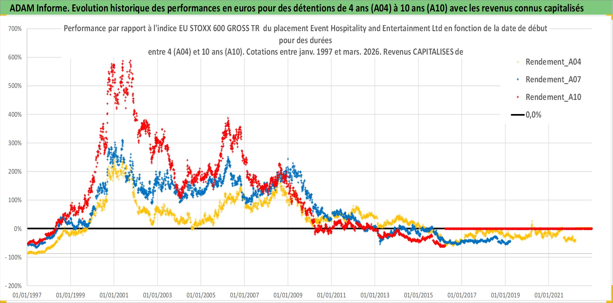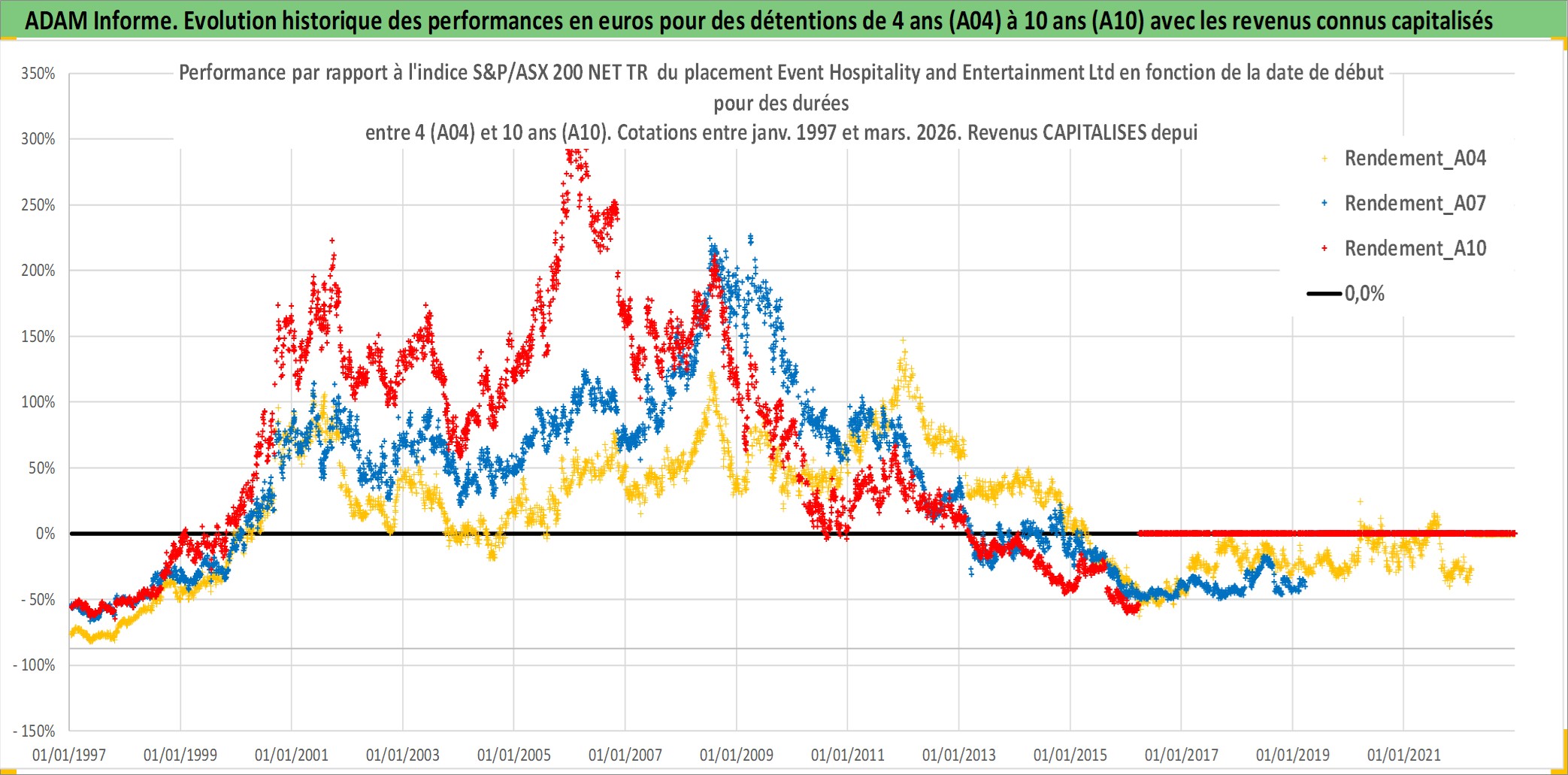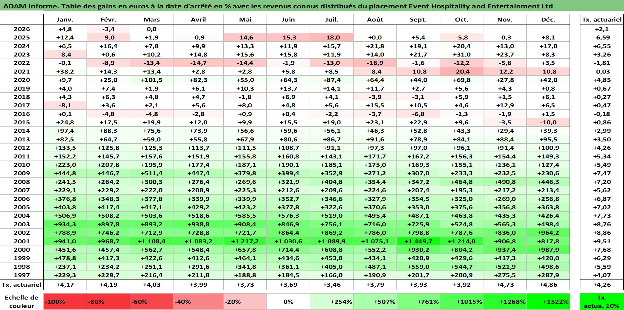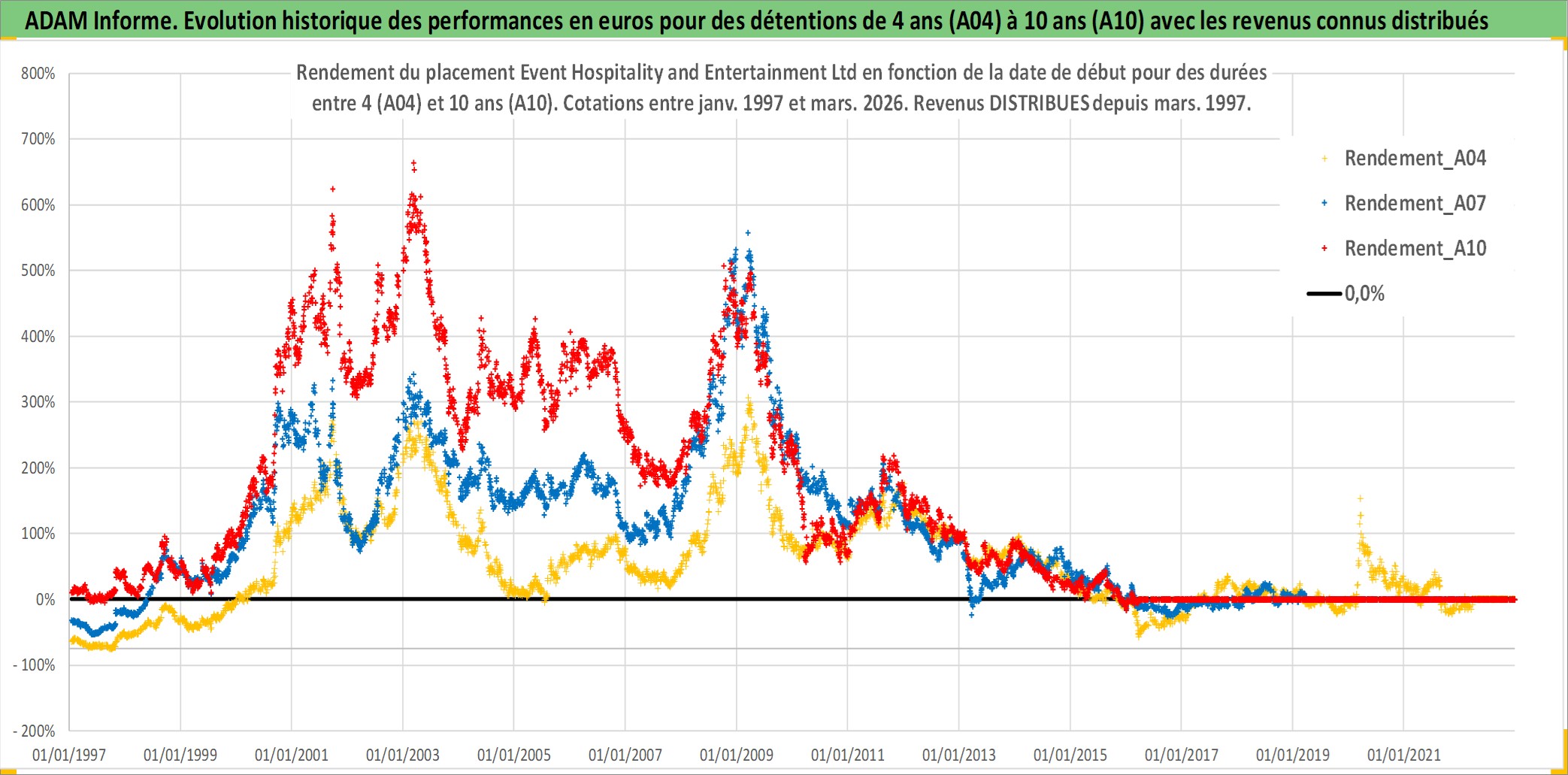 Site dédié aux investisseursPage dédiée sur site financeAnalyse des valorisations hebdomadaires de l'action Event Hospitality and Entertainment Ltd. Cet actif est cote en AUD. Les valorisations sont en contrevaleur EURO et couvrent les semaines 1997W01 a 2026W13. Les revenus de cet actif financier sont pris en compte depuis la semaine 1997W12. La note ESG de cet actif n'est pas connue.