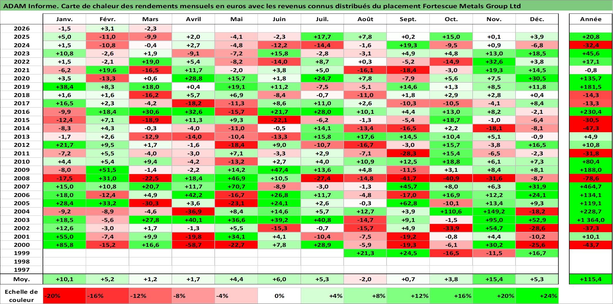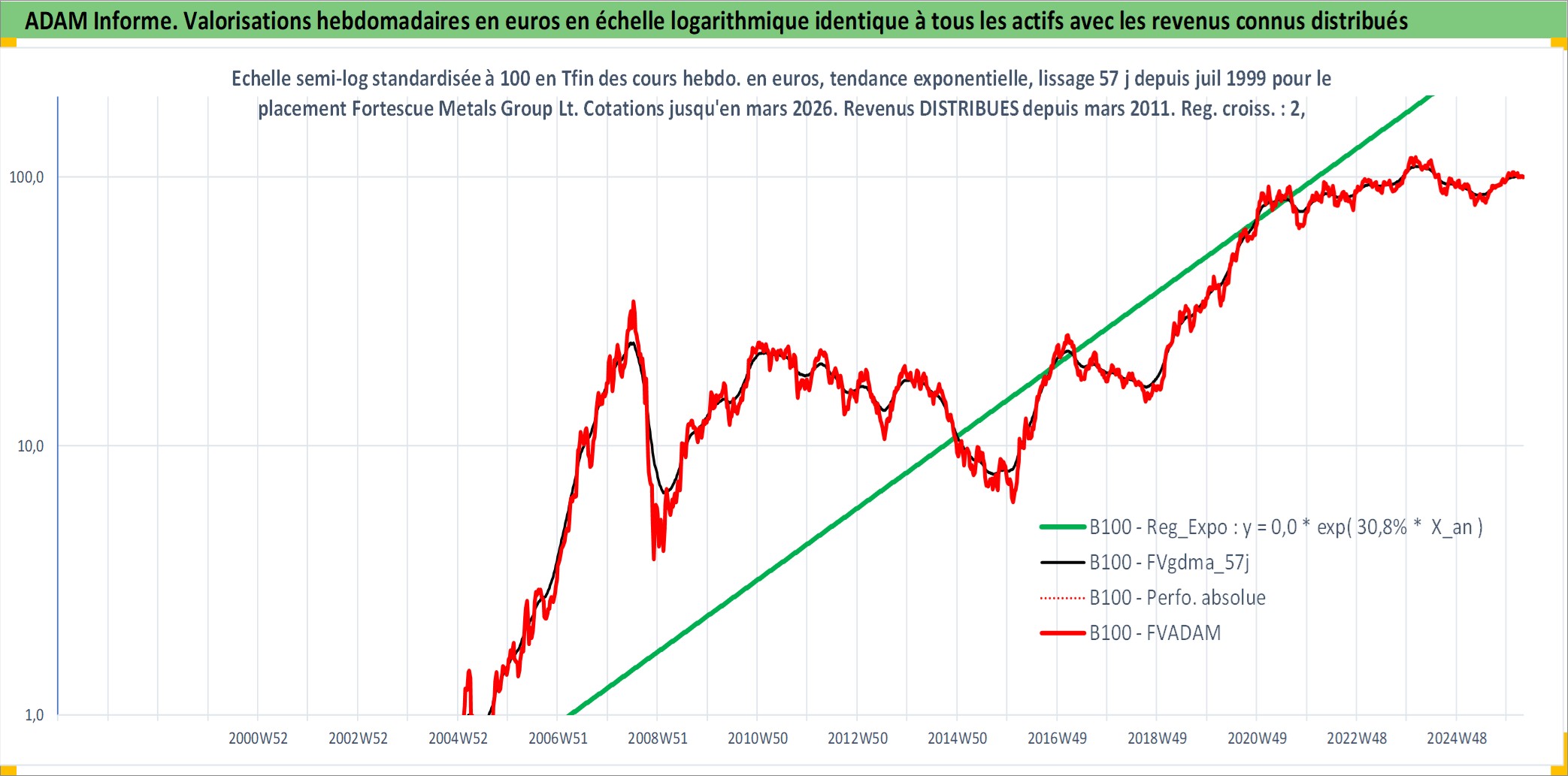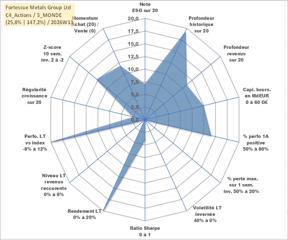 Site dédié aux investisseursPage dédiée sur site financeAnalyse des valorisations hebdomadaires de l'action Fortescue Metals Group Ltd. Cet actif est cote en AUD. Les valorisations sont en contrevaleur EURO et couvrent les semaines 1999W30 a 2026W13. Les revenus de cet actif financier sont pris en compte depuis la semaine 2011W10. La note globale ESG de cet actif est estimee a 7.0 (apres rebasage entre 0 et 20).