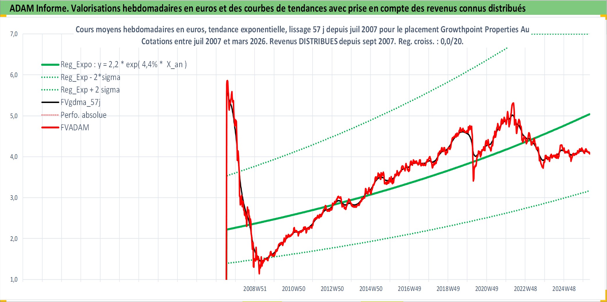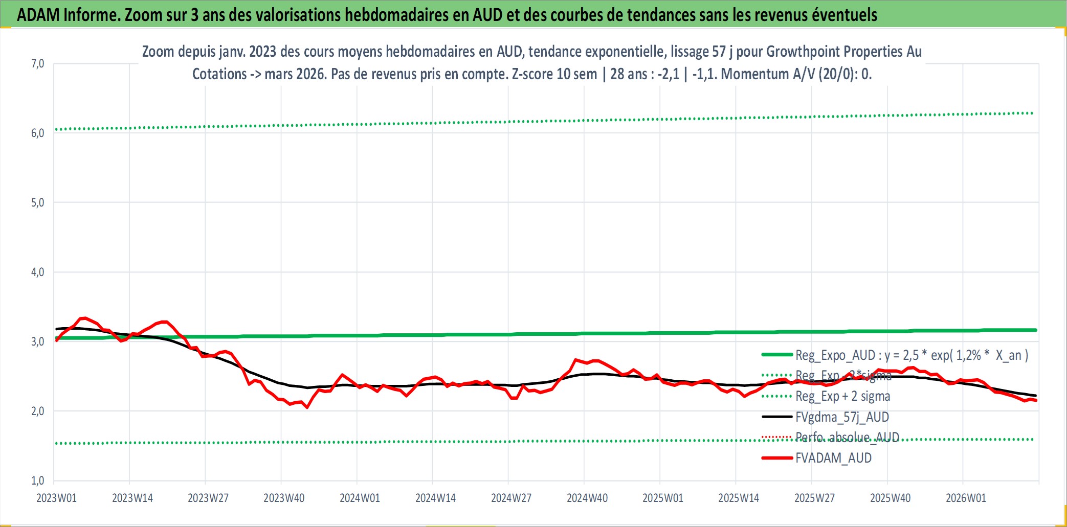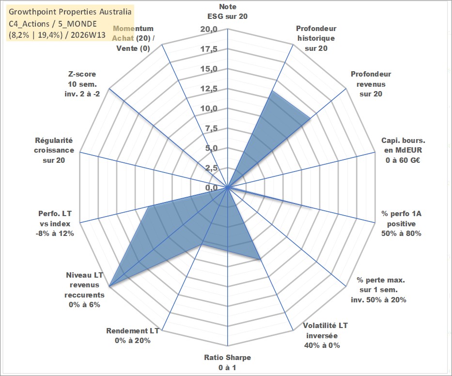 Site dédié aux investisseursPage dédiée sur site financeAnalyse des valorisations hebdomadaires de l'action Growthpoint Properties Australia. Cet actif est cote en AUD. Les valorisations sont en contrevaleur EURO et couvrent les semaines 2007W27 a 2026W13. Les revenus de cet actif financier sont pris en compte depuis la semaine 2007W39. La note ESG de cet actif n'est pas connue.