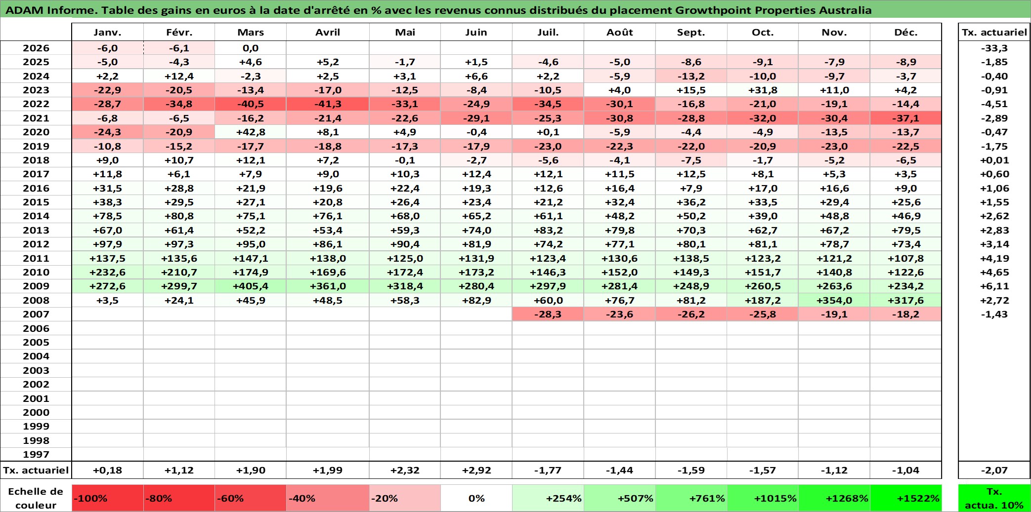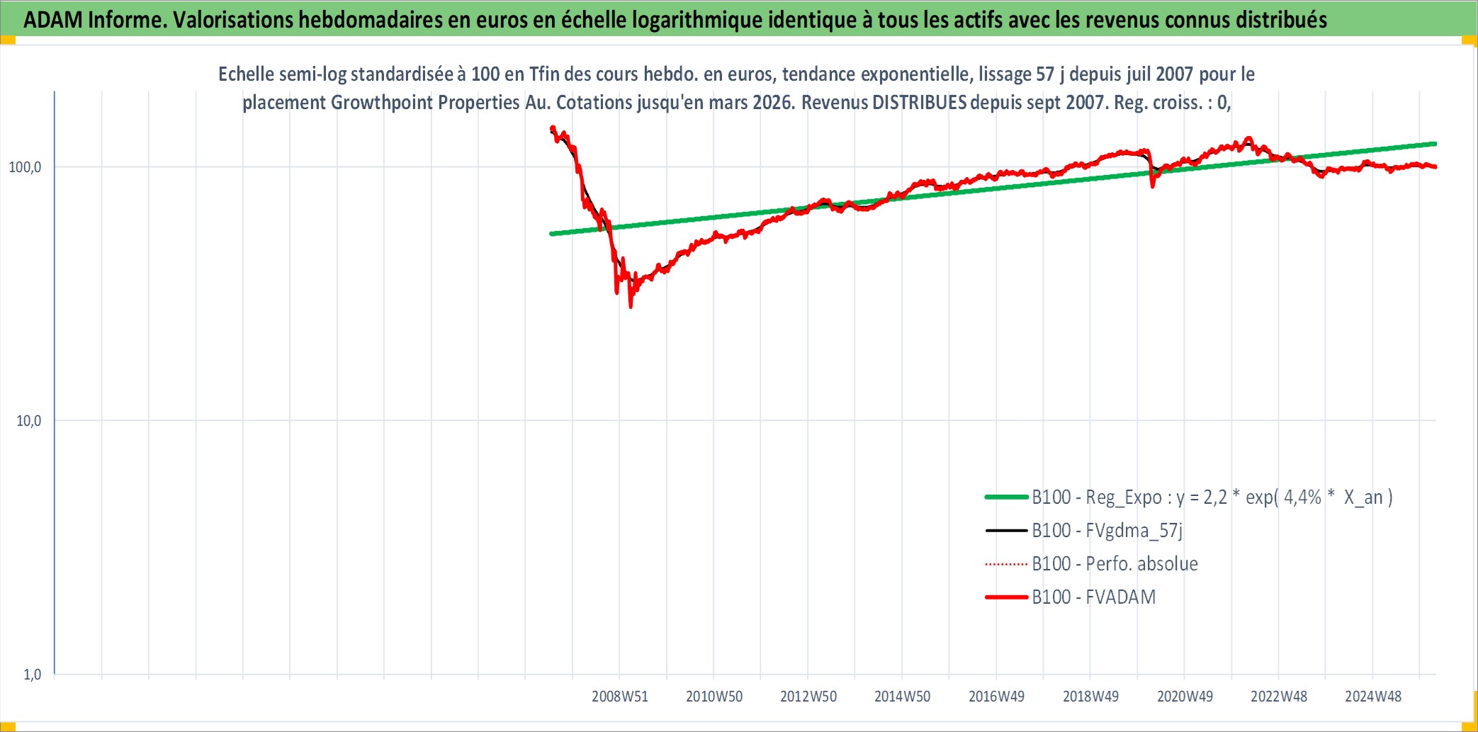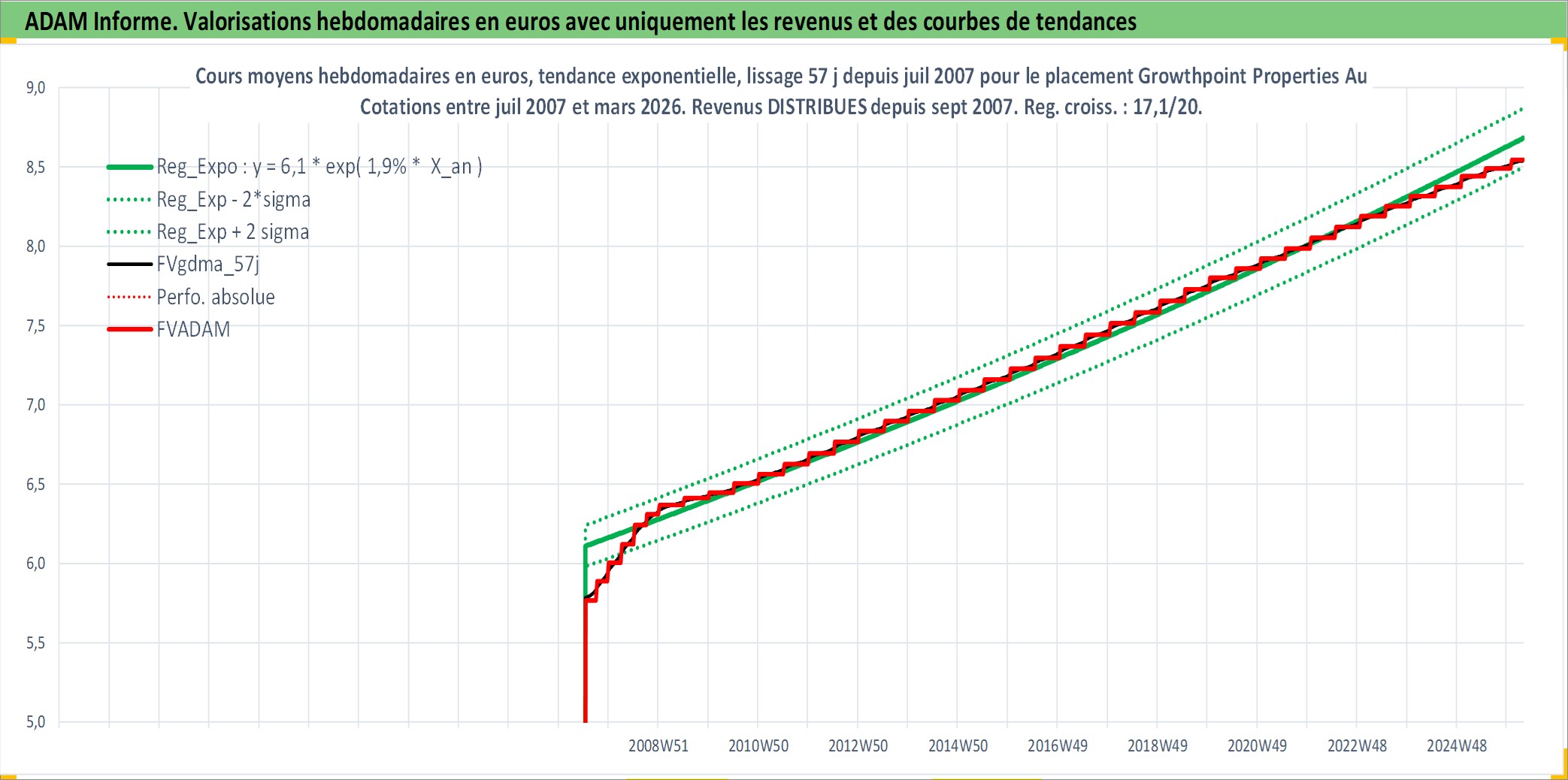 Site dédié aux investisseursPage dédiée sur site financeAnalyse des valorisations hebdomadaires de l'action Growthpoint Properties Australia. Cet actif est cote en AUD. Les valorisations sont en contrevaleur EURO et couvrent les semaines 2007W27 a 2026W13. Les revenus de cet actif financier sont pris en compte depuis la semaine 2007W39. La note ESG de cet actif n'est pas connue.