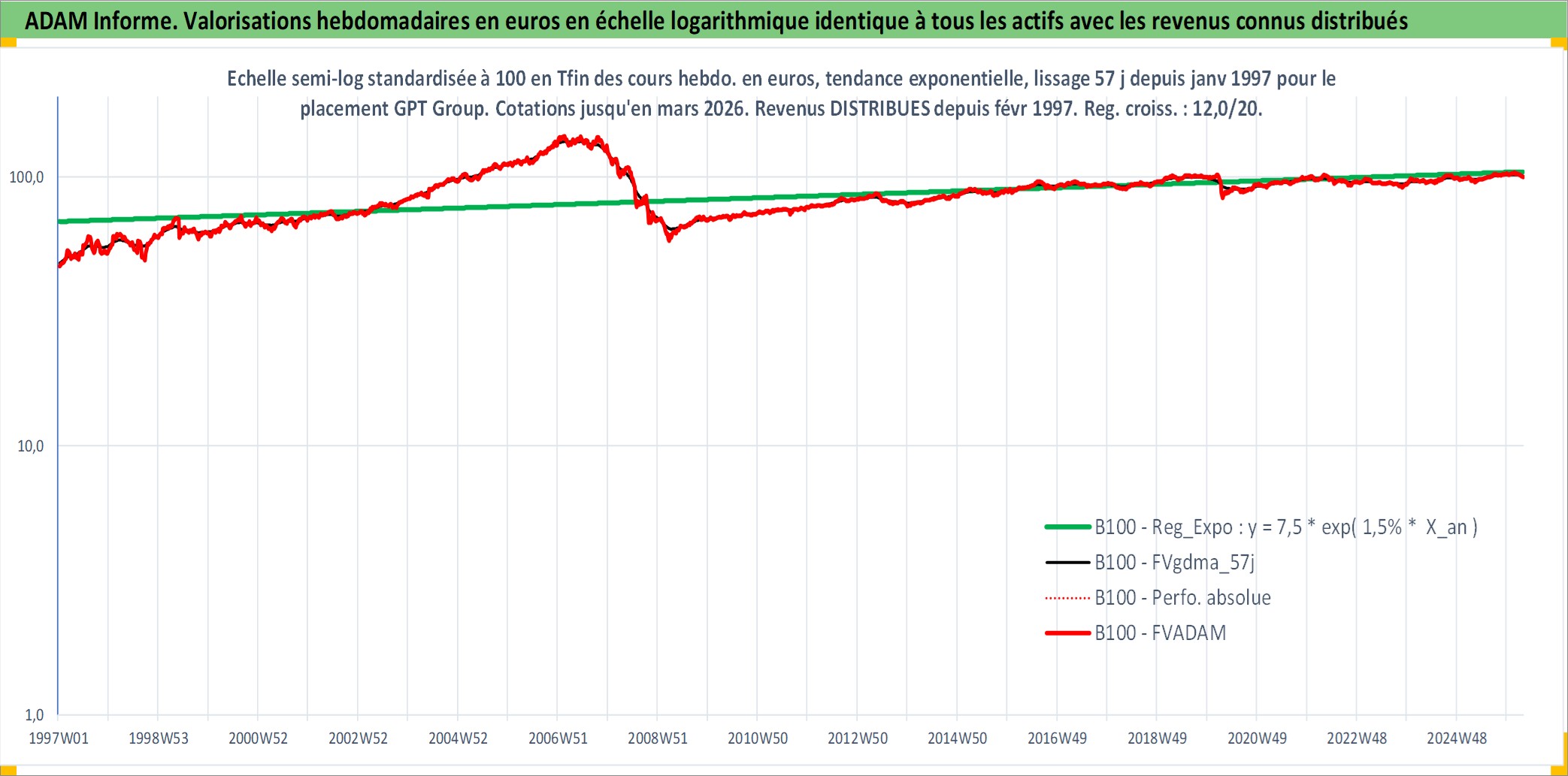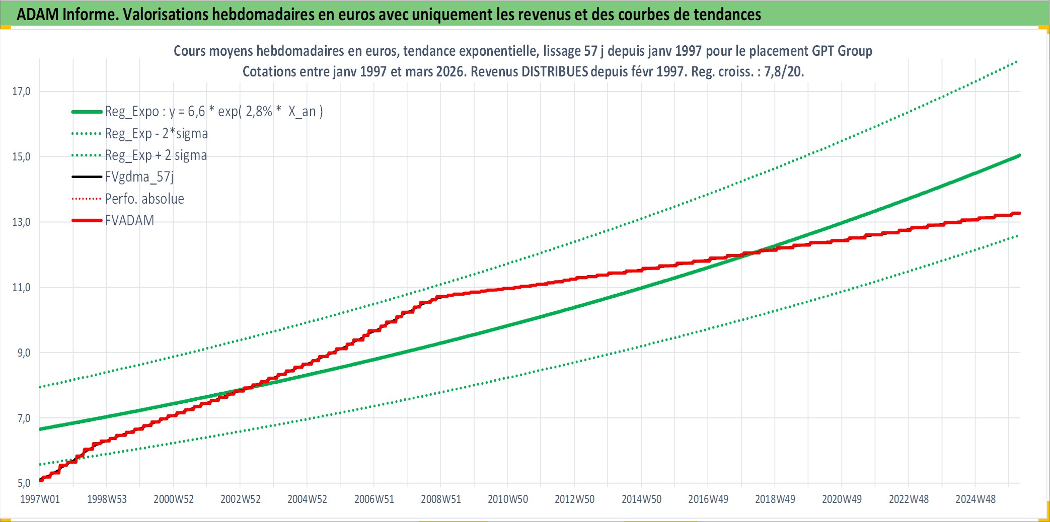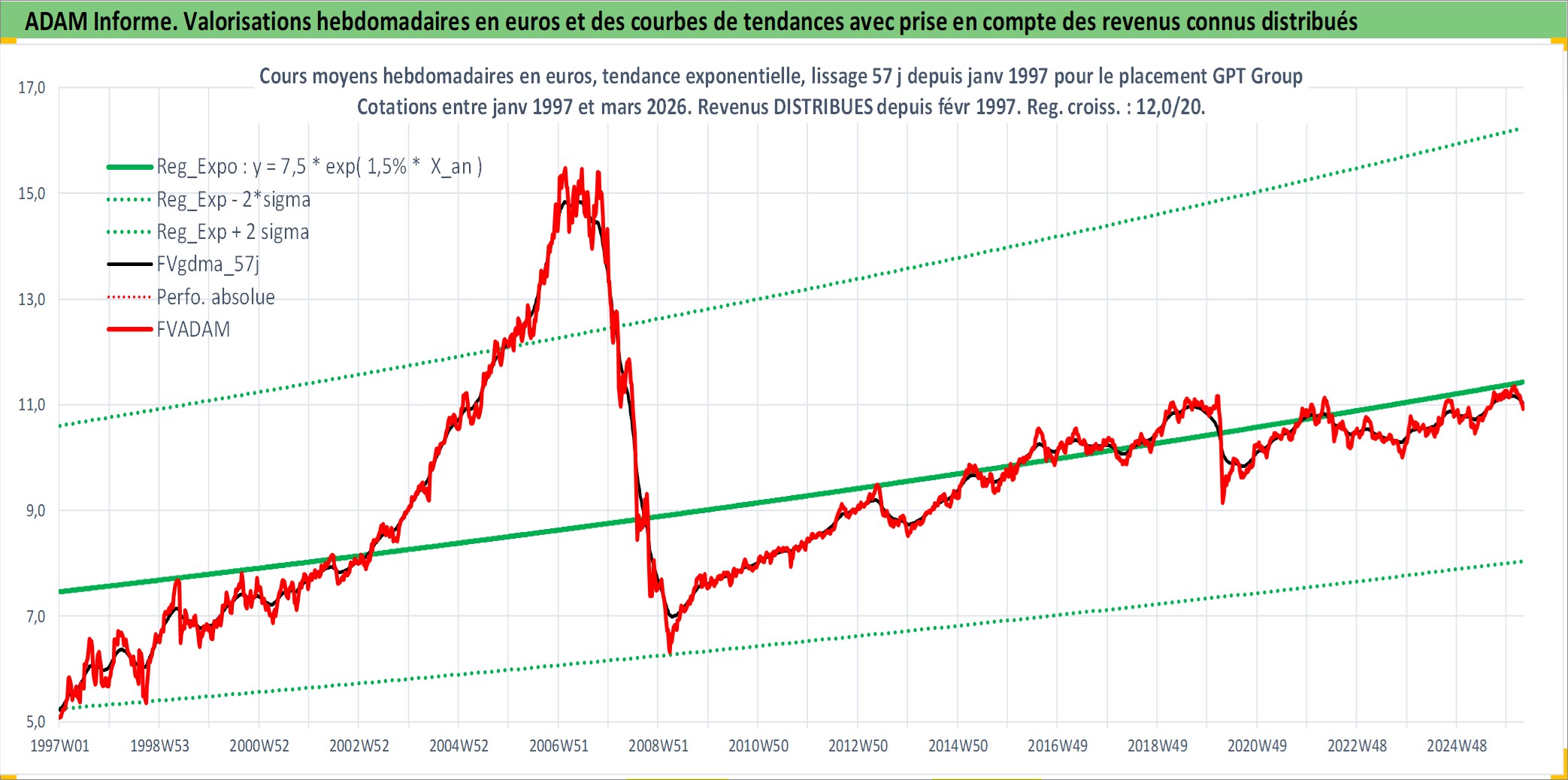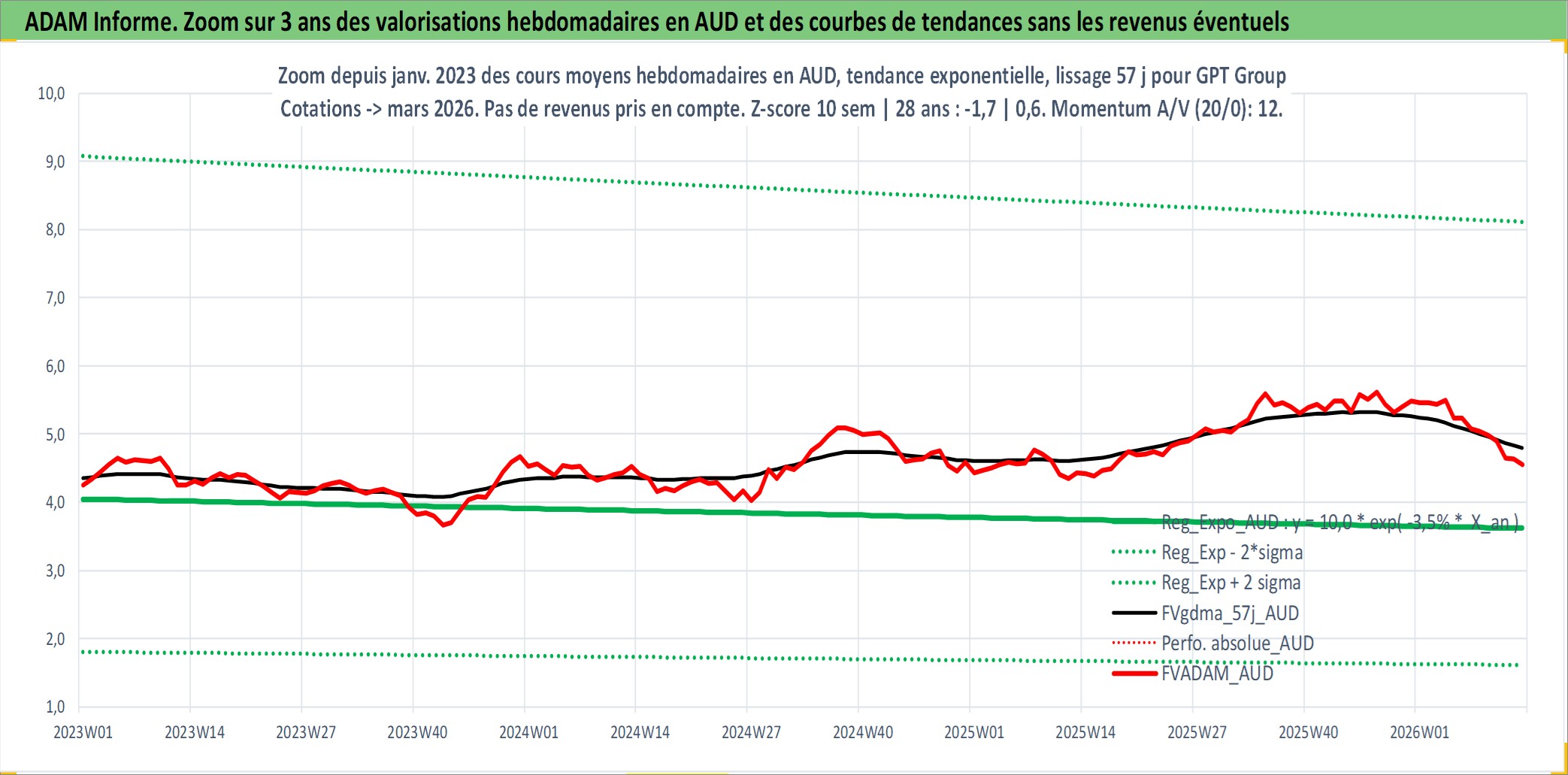 Site dédié aux investisseursPage dédiée sur site financeAnalyse des valorisations hebdomadaires de l'action GPT Group. Cet actif est cote en AUD. Les valorisations sont en contrevaleur EURO et couvrent les semaines 1997W01 a 2026W13. Les revenus de cet actif financier sont pris en compte depuis la semaine 1997W06. La note globale ESG de cet actif est estimee a 17.0 (apres rebasage entre 0 et 20).