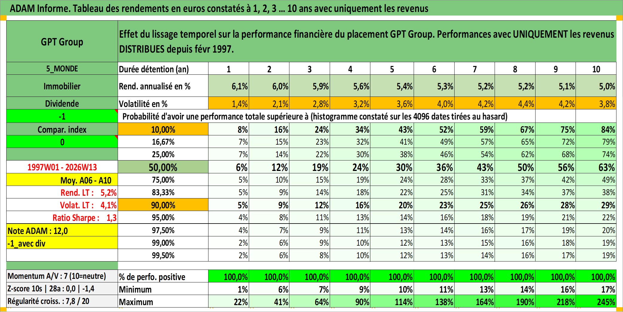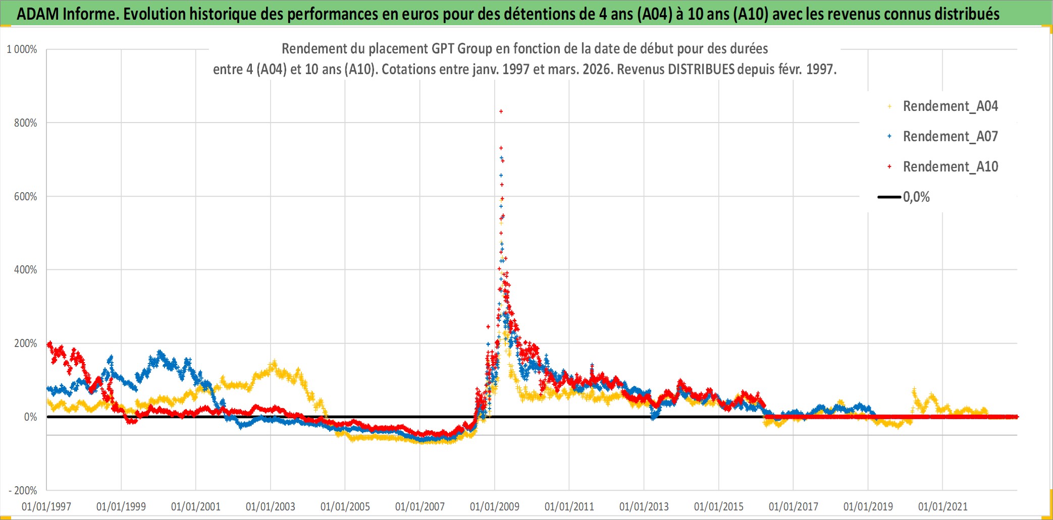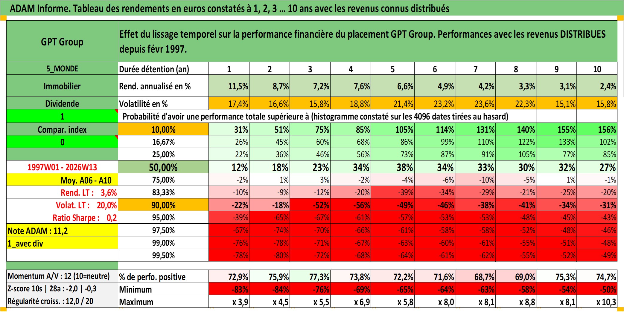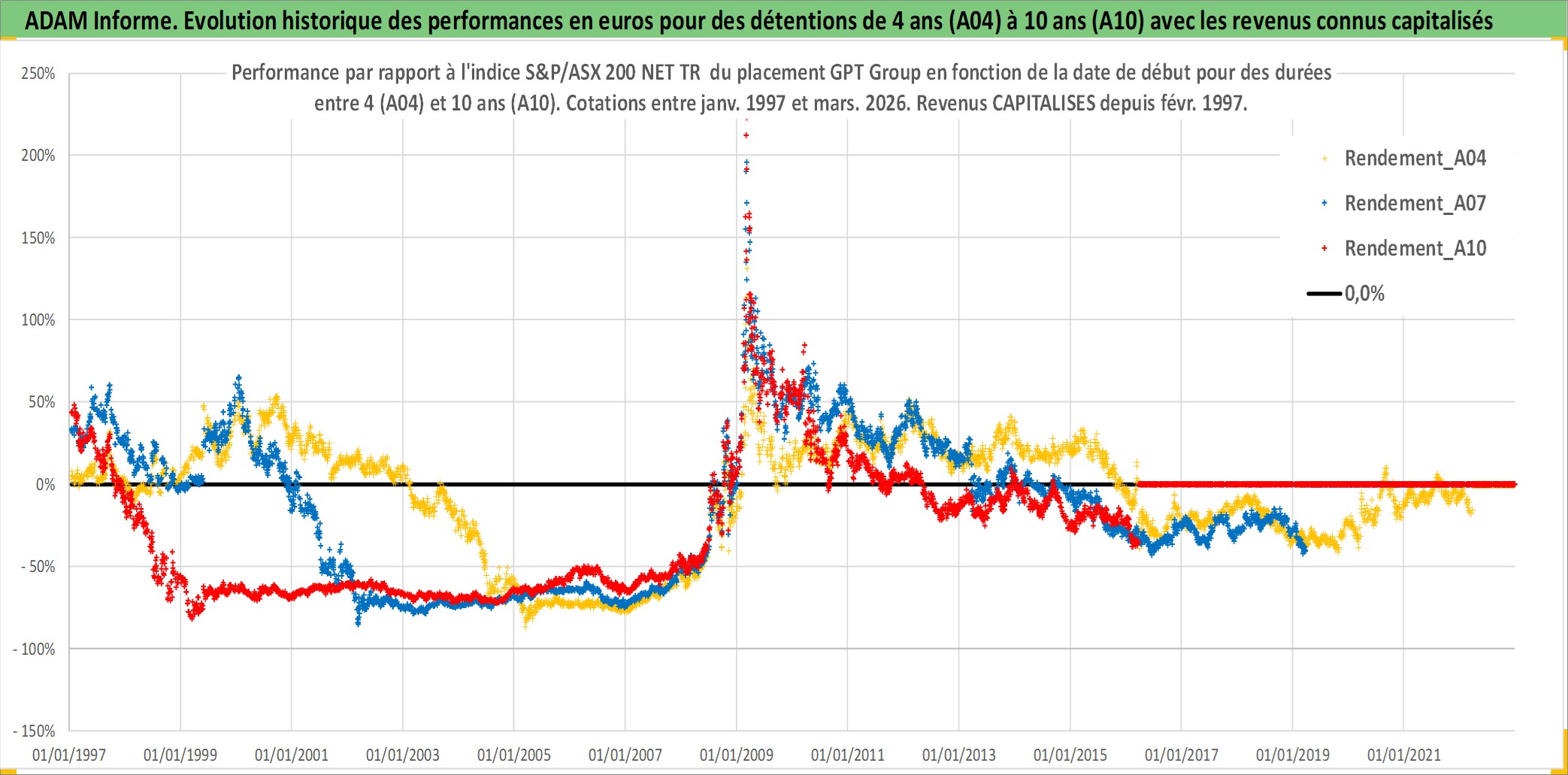 Site dédié aux investisseursPage dédiée sur site financeAnalyse des valorisations hebdomadaires de l'action GPT Group. Cet actif est cote en AUD. Les valorisations sont en contrevaleur EURO et couvrent les semaines 1997W01 a 2026W13. Les revenus de cet actif financier sont pris en compte depuis la semaine 1997W06. La note globale ESG de cet actif est estimee a 17.0 (apres rebasage entre 0 et 20).