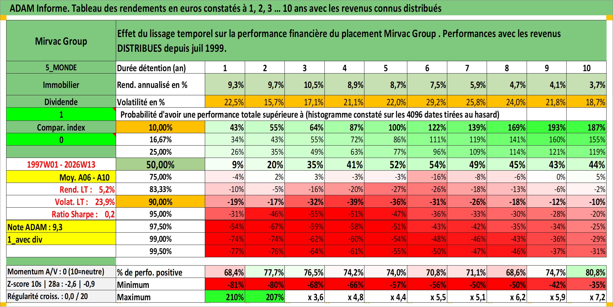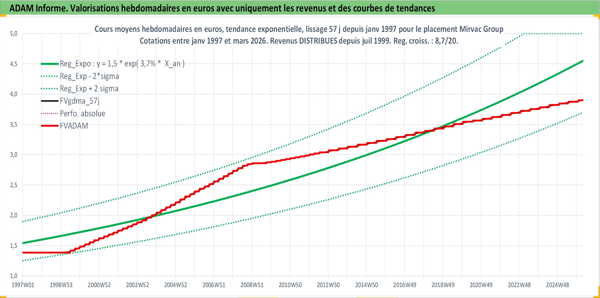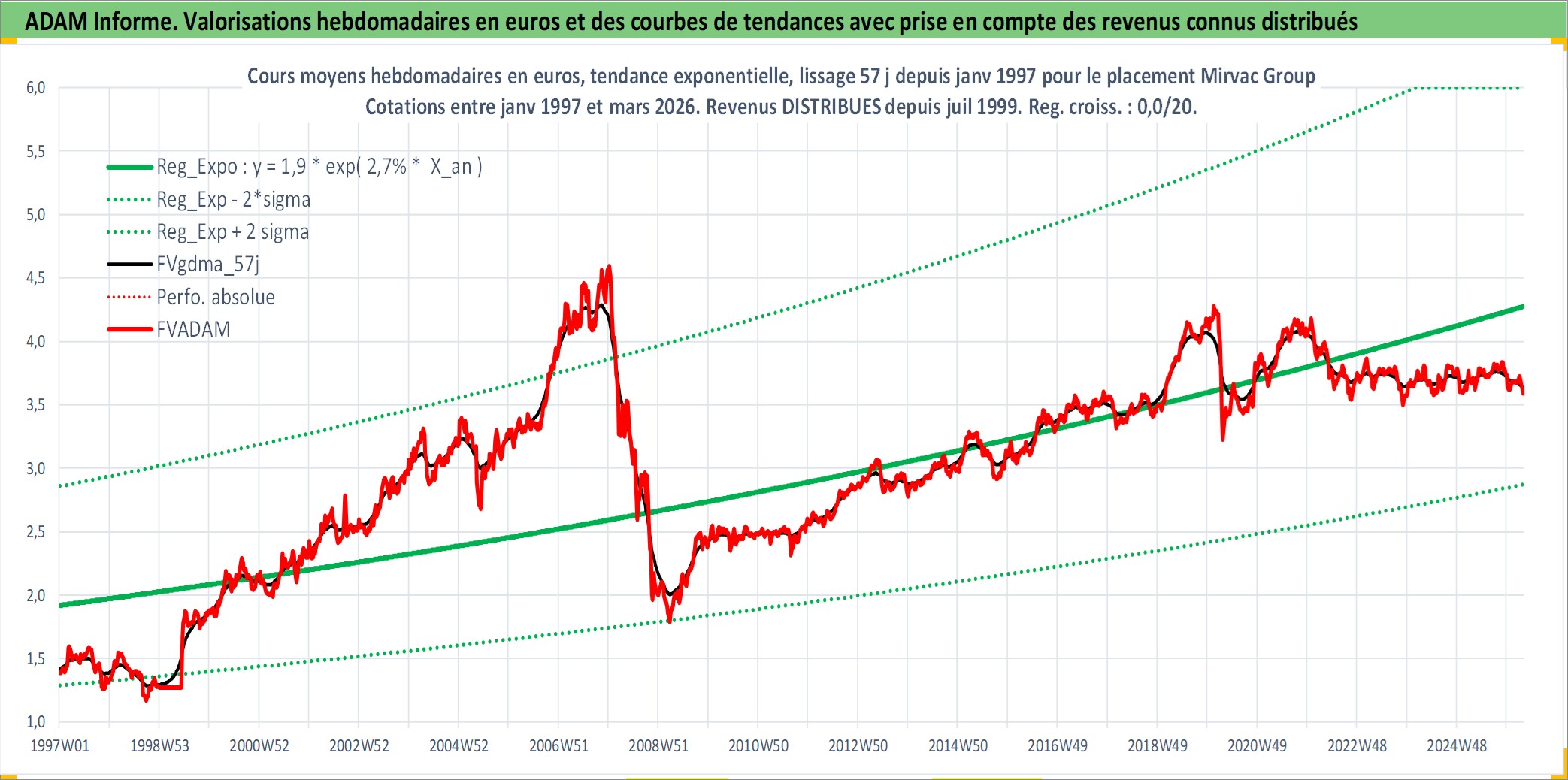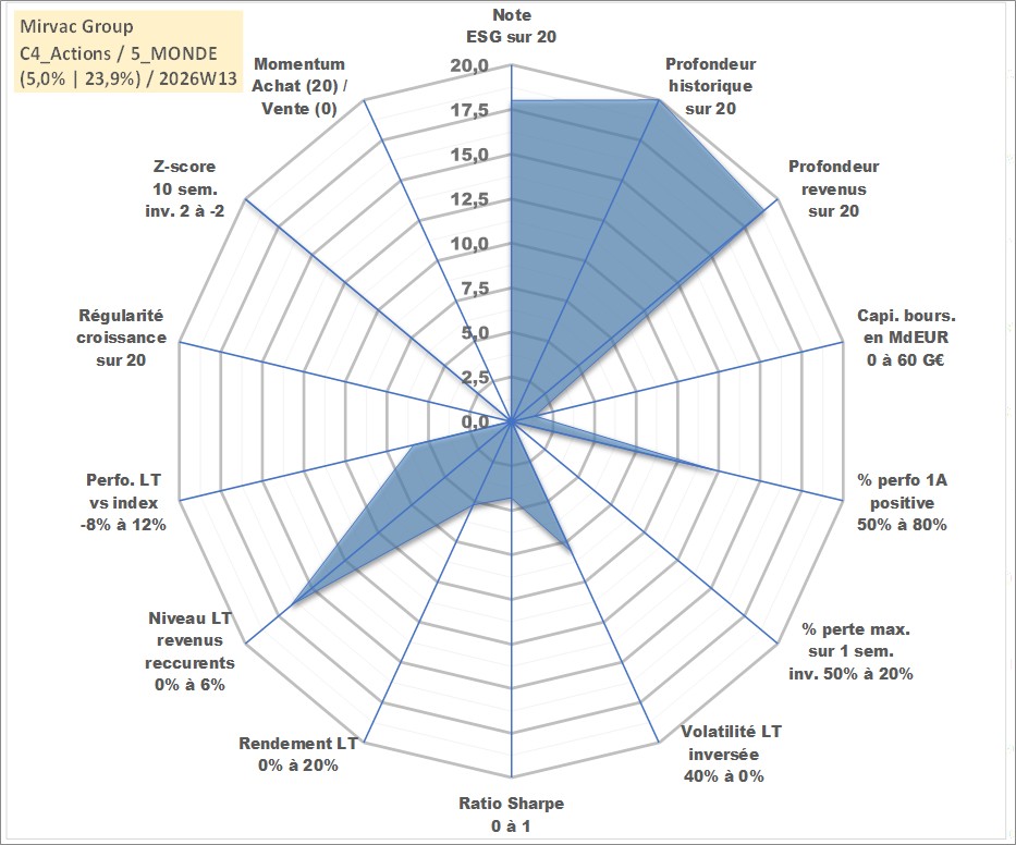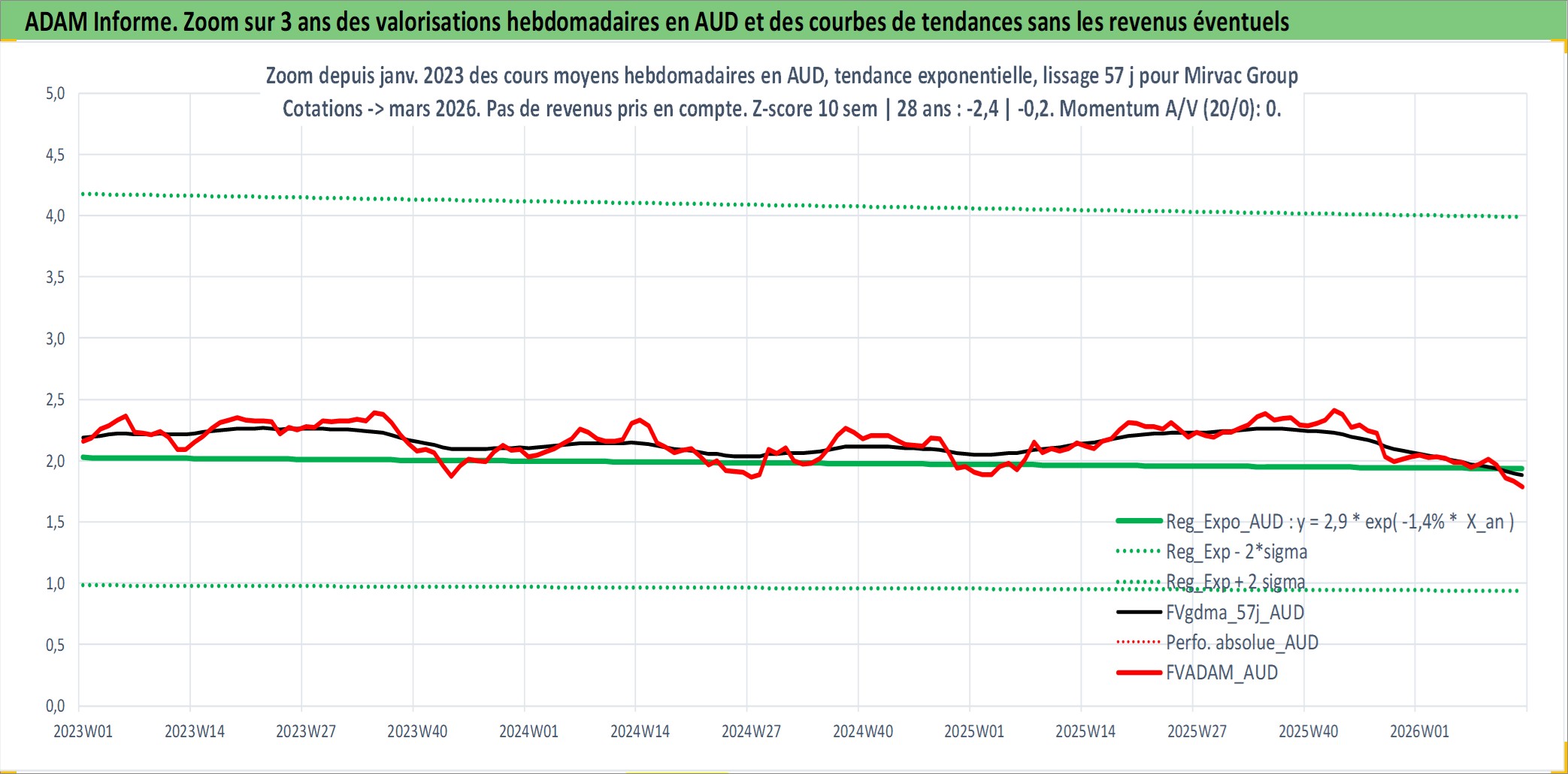 Site dédié aux investisseursPage dédiée sur site financeAnalyse des valorisations hebdomadaires de l'action Mirvac Group . Cet actif est cote en AUD. Les valorisations sont en contrevaleur EURO et couvrent les semaines 1997W01 a 2026W13. Les revenus de cet actif financier sont pris en compte depuis la semaine 1999W26. La note globale ESG de cet actif est estimee a 18.0 (apres rebasage entre 0 et 20).