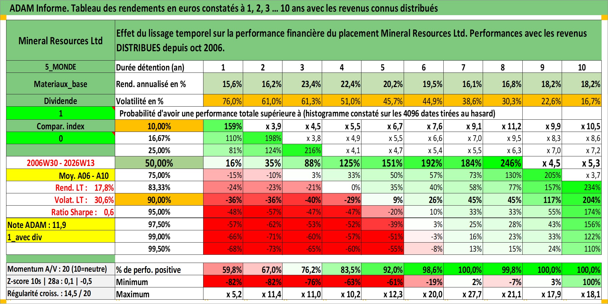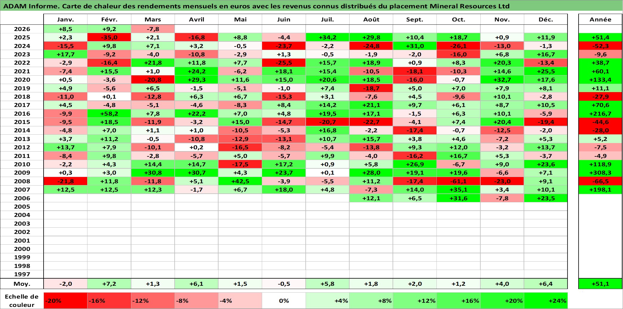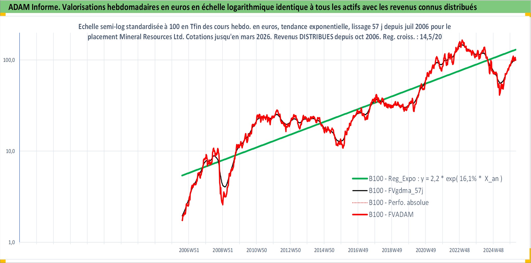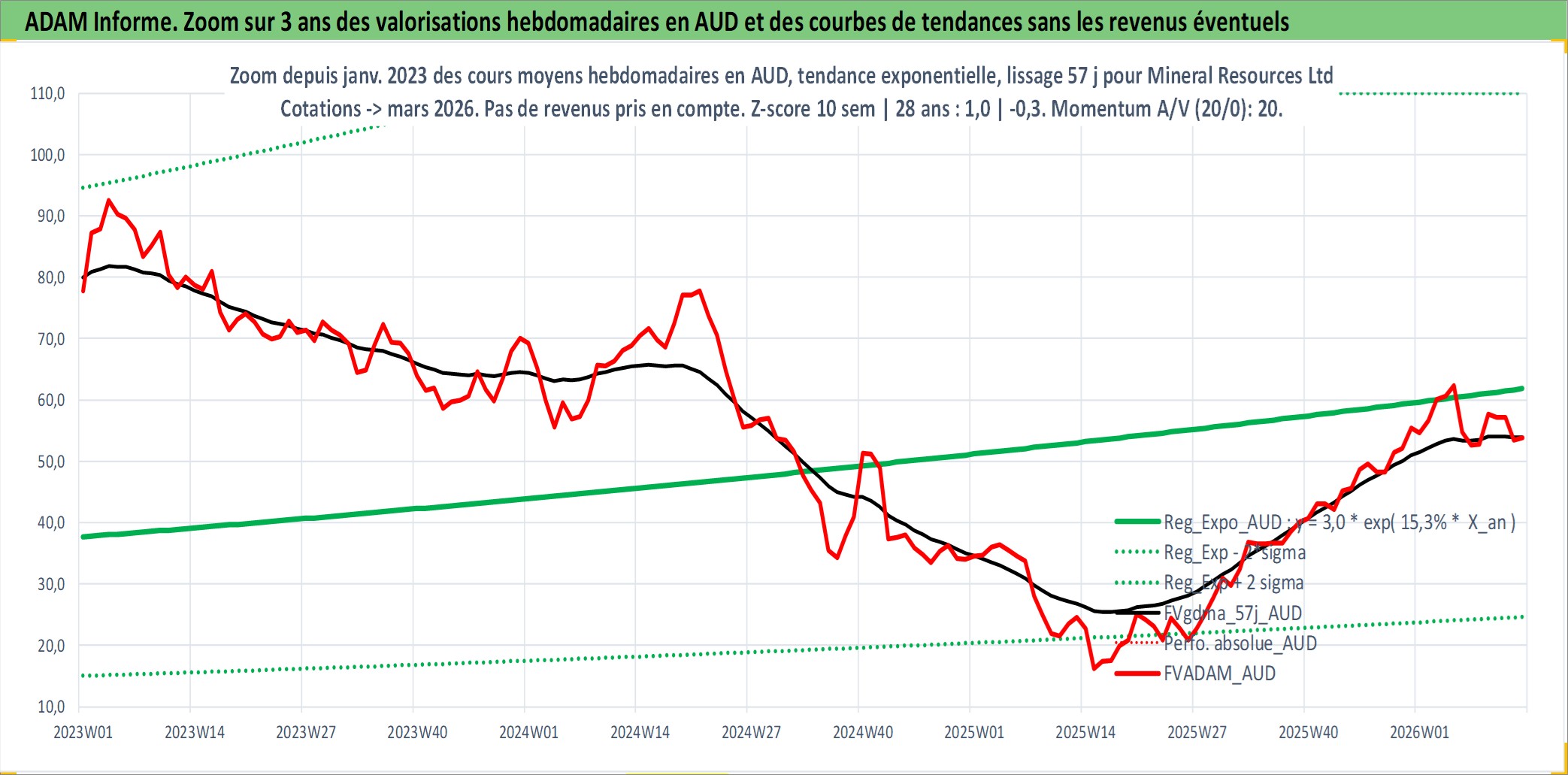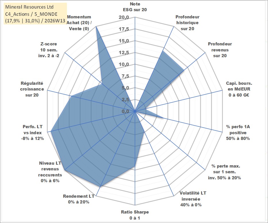 Site dédié aux investisseursPage dédiée sur site financeAnalyse des valorisations hebdomadaires de l'action Mineral Resources Ltd. Cet actif est cote en AUD. Les valorisations sont en contrevaleur EURO et couvrent les semaines 2006W30 a 2026W13. Les revenus de cet actif financier sont pris en compte depuis la semaine 2006W41. La note ESG de cet actif n'est pas connue.