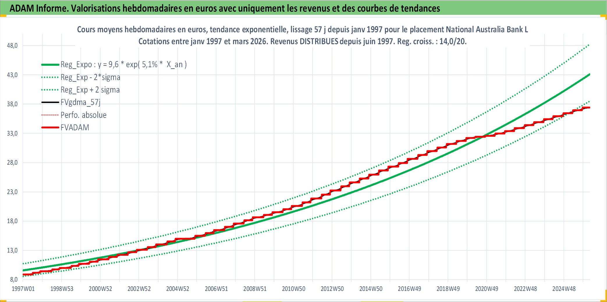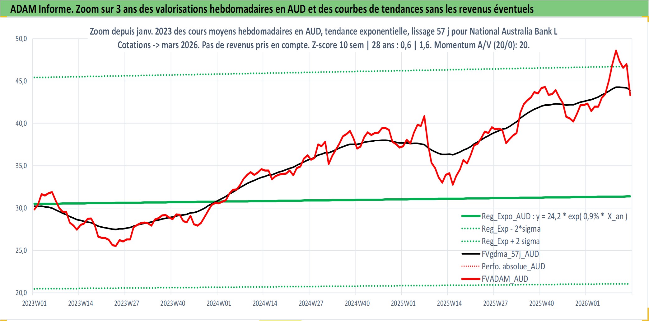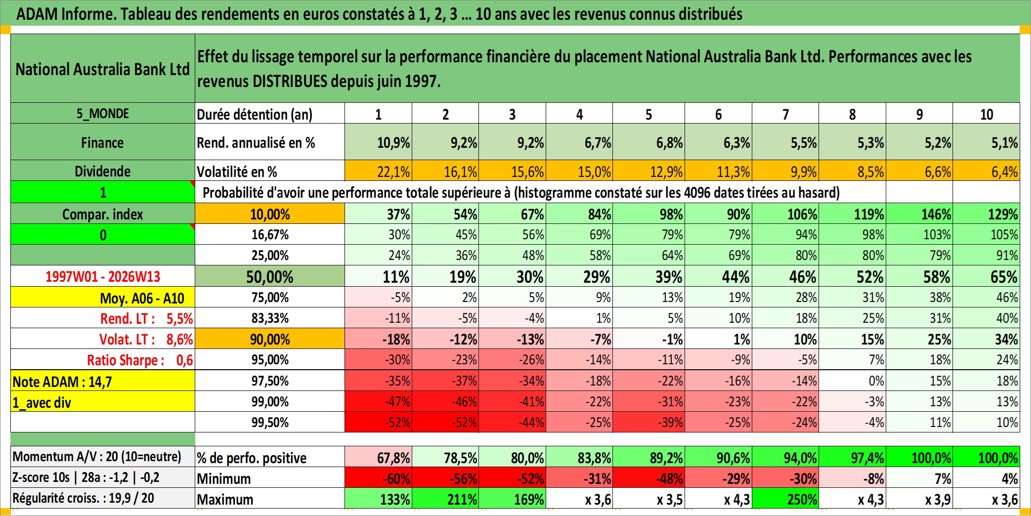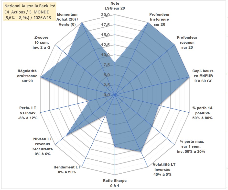 Site dédié aux investisseursPage dédiée sur site financeAnalyse des valorisations hebdomadaires de l'action National Australia Bank Ltd. Cet actif est cote en AUD. Les valorisations sont en contrevaleur EURO et couvrent les semaines 1997W01 a 2026W13. Les revenus de cet actif financier sont pris en compte depuis la semaine 1997W27. La note globale ESG de cet actif est estimee a 8.0 (apres rebasage entre 0 et 20).