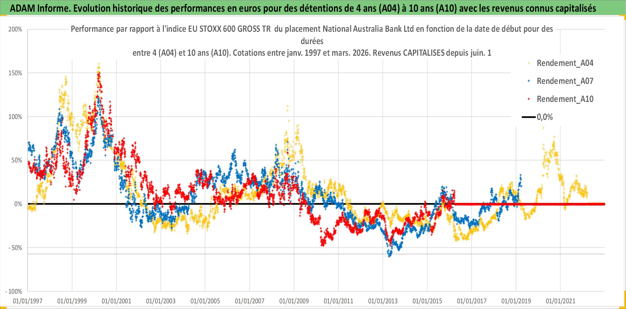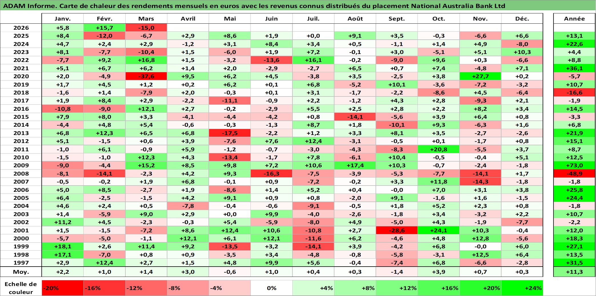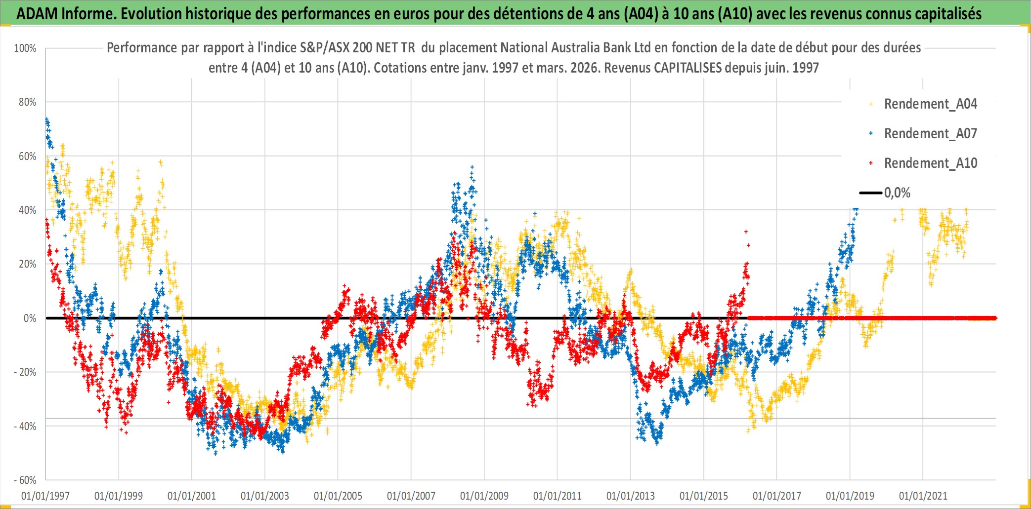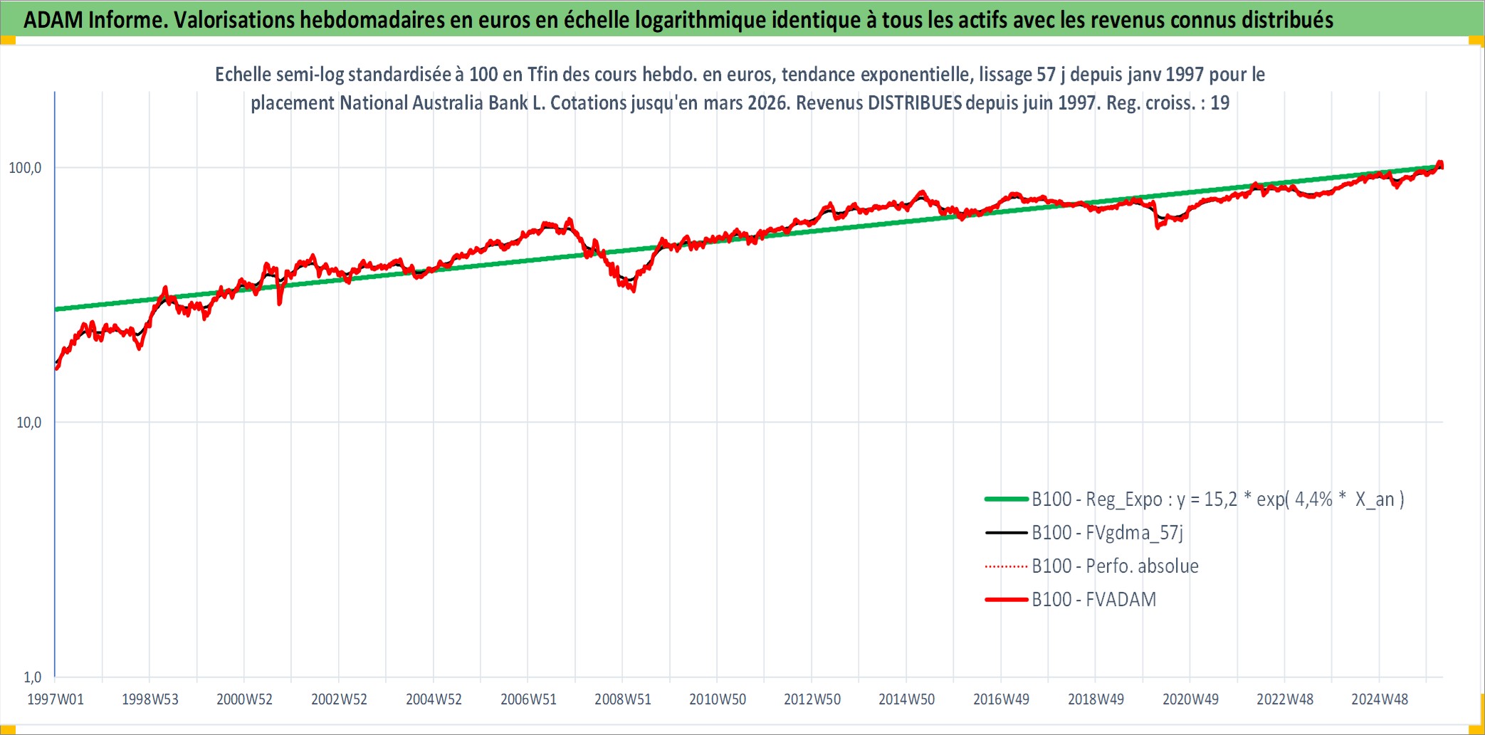 Site dédié aux investisseursPage dédiée sur site financeAnalyse des valorisations hebdomadaires de l'action National Australia Bank Ltd. Cet actif est cote en AUD. Les valorisations sont en contrevaleur EURO et couvrent les semaines 1997W01 a 2026W13. Les revenus de cet actif financier sont pris en compte depuis la semaine 1997W27. La note globale ESG de cet actif est estimee a 8.0 (apres rebasage entre 0 et 20).
