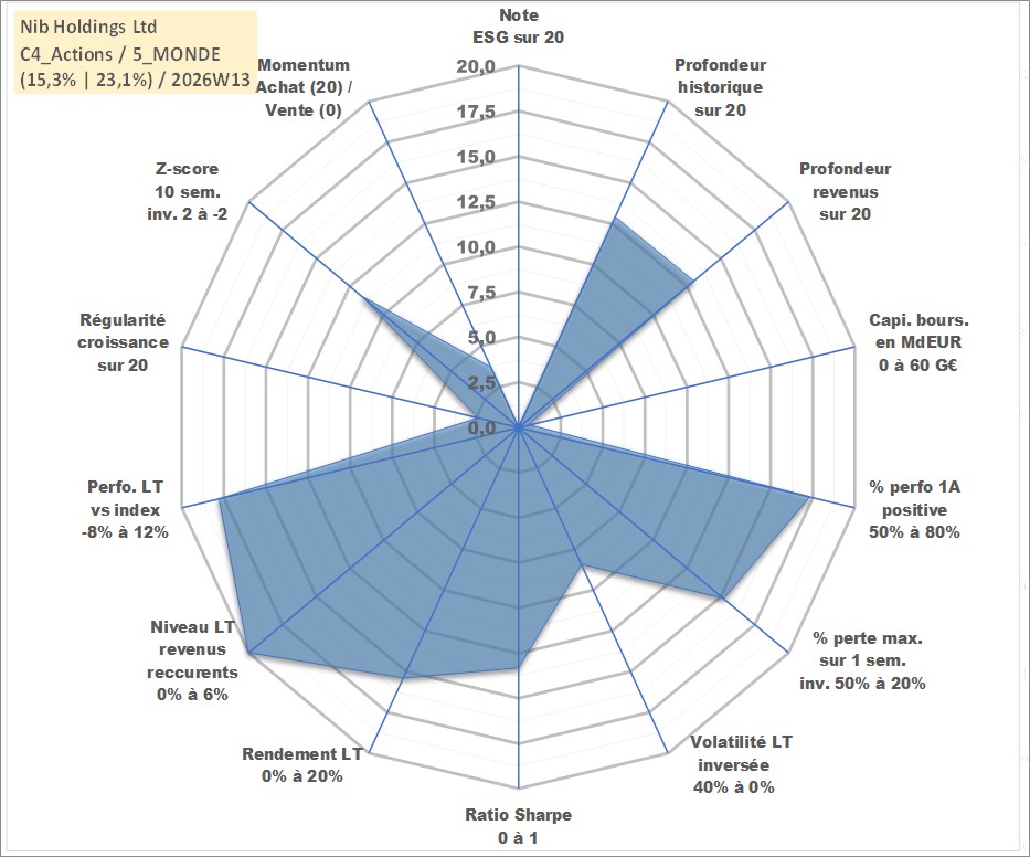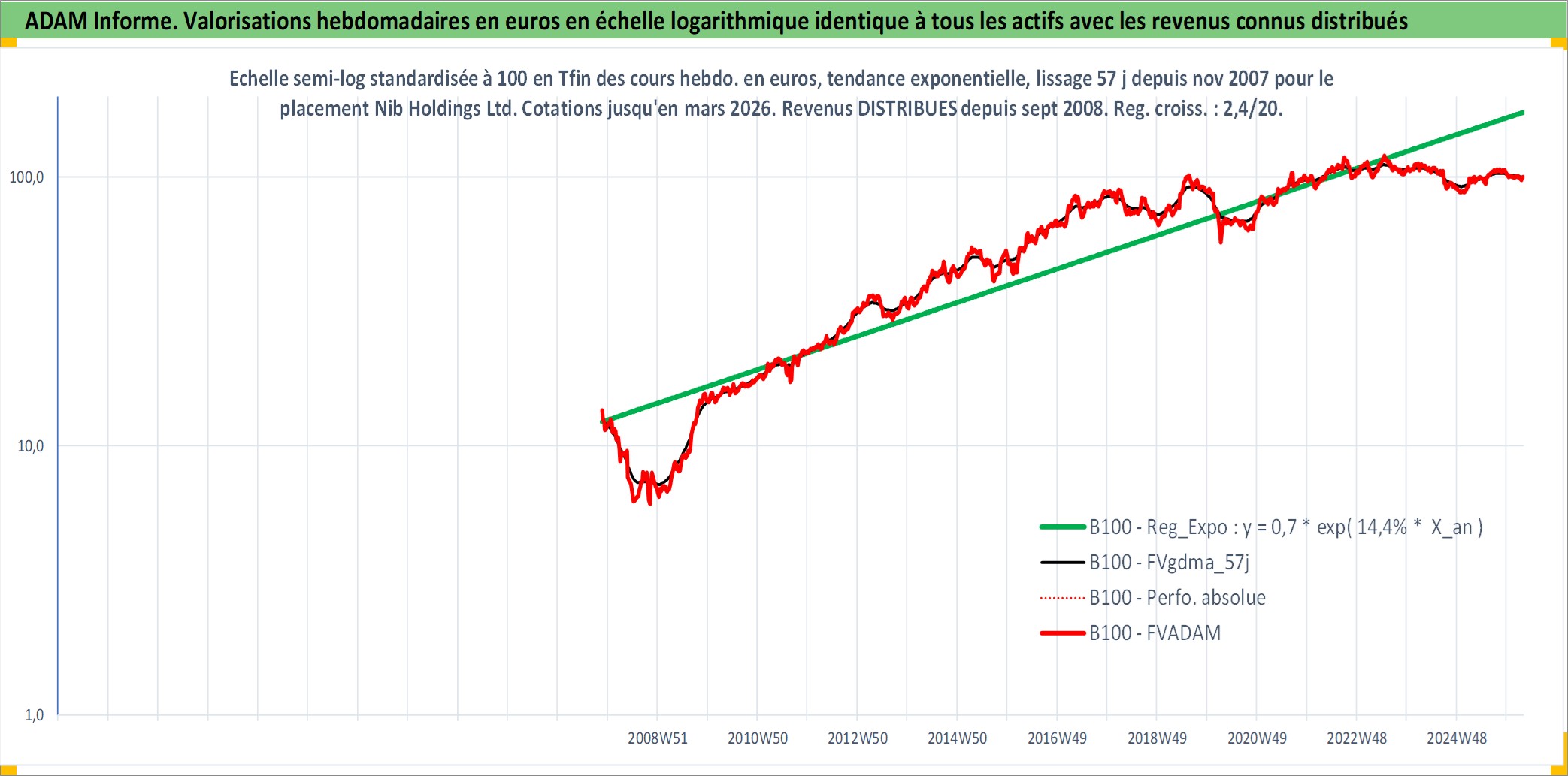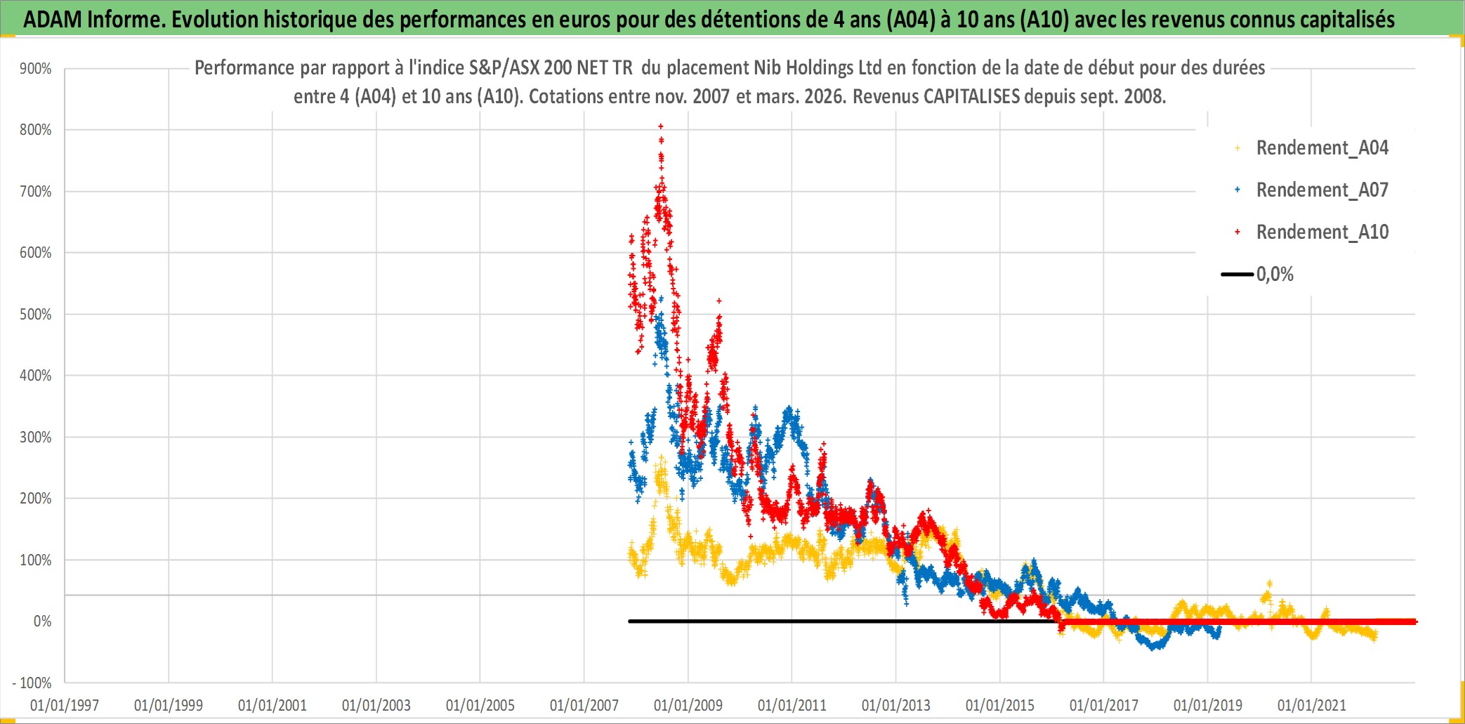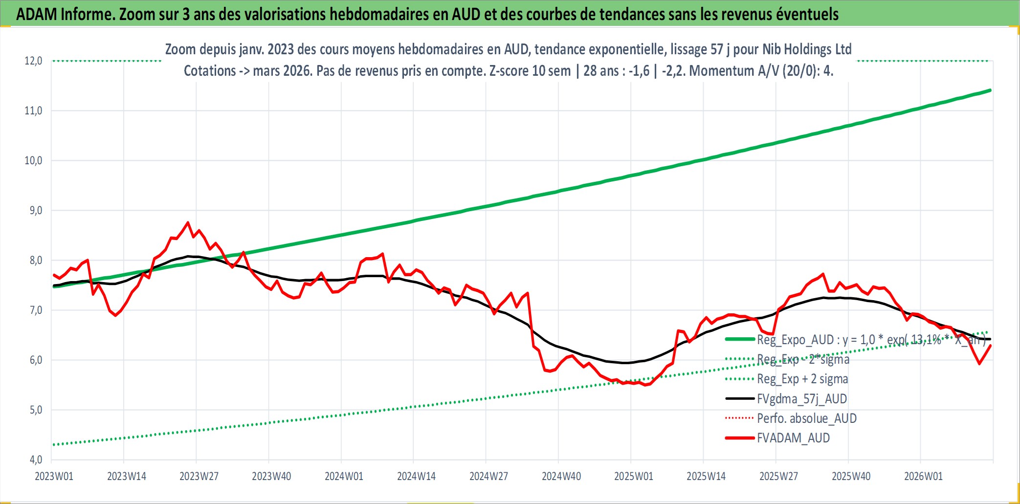 Site dédié aux investisseursPage dédiée sur site financeAnalyse des valorisations hebdomadaires de l'action Nib Holdings Ltd. Cet actif est cote en AUD. Les valorisations sont en contrevaleur EURO et couvrent les semaines 2007W45 a 2026W13. Les revenus de cet actif financier sont pris en compte depuis la semaine 2008W38. La note ESG de cet actif n'est pas connue.