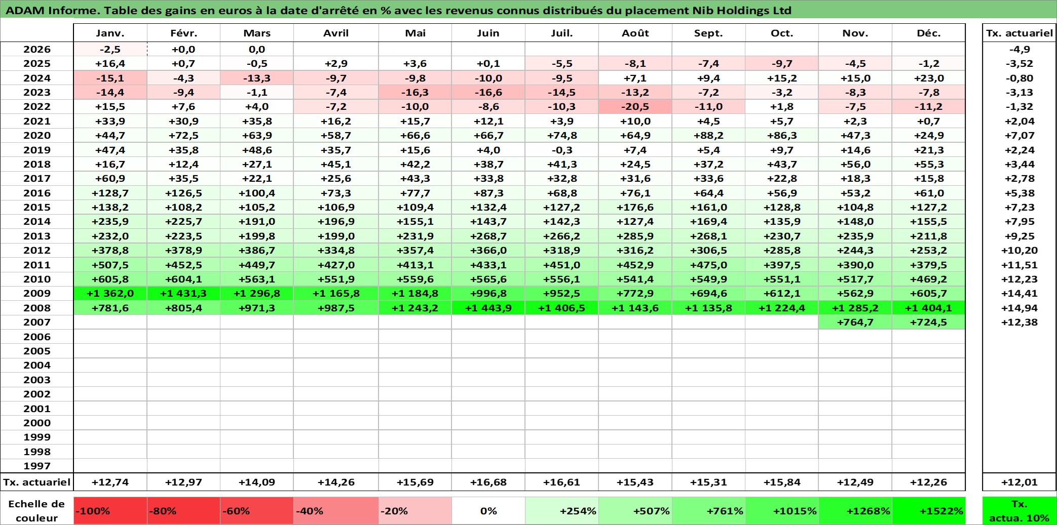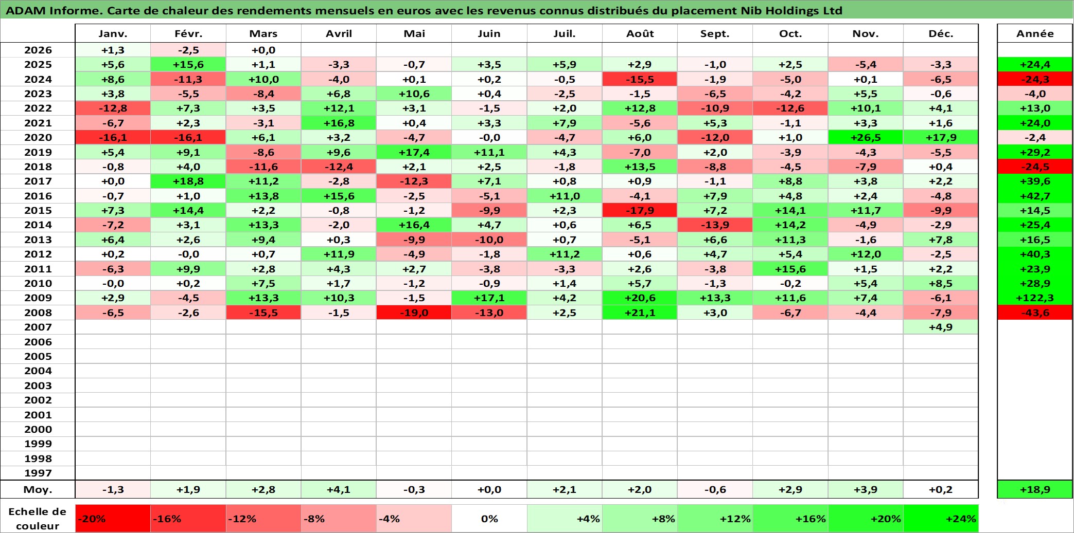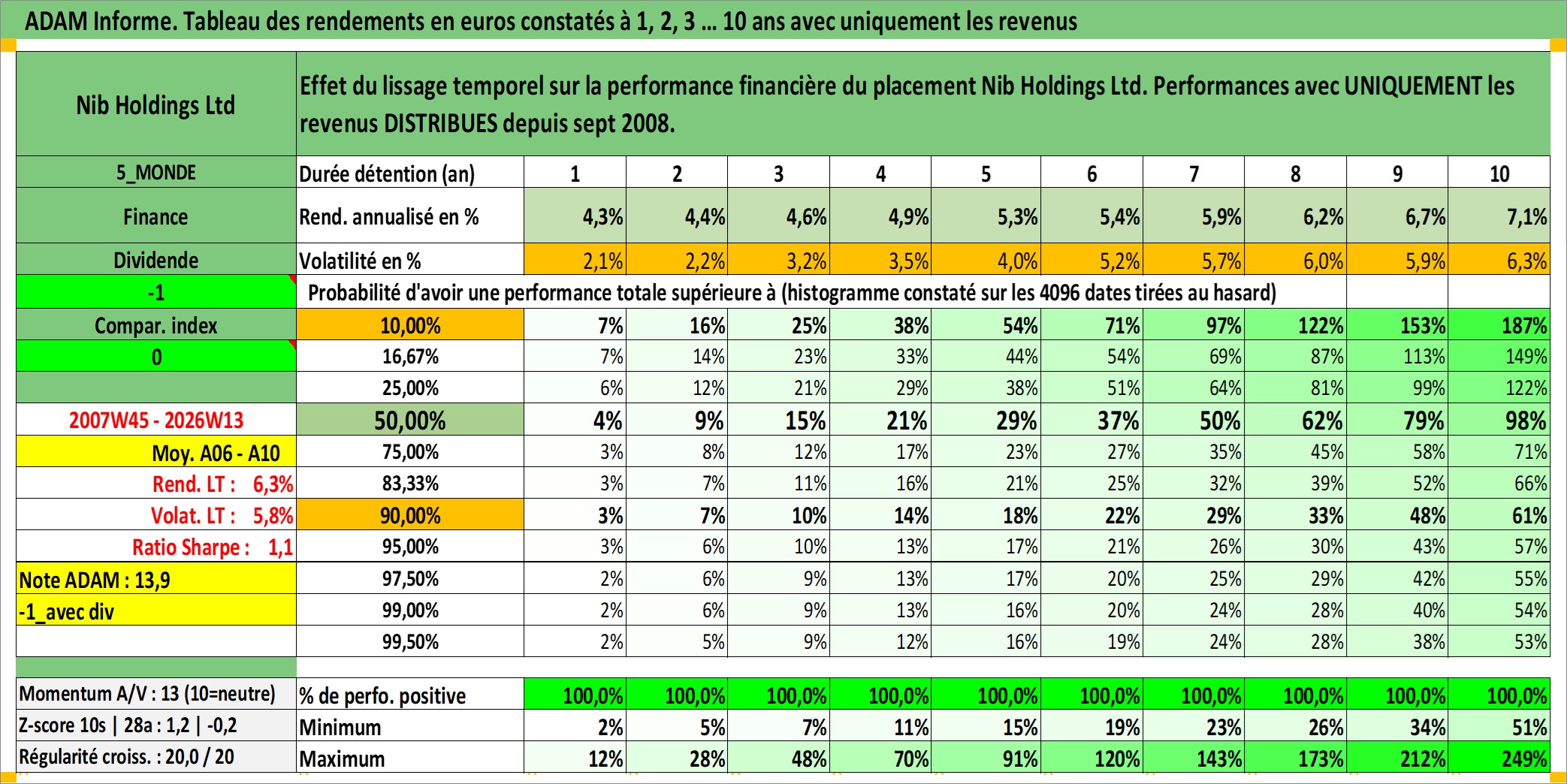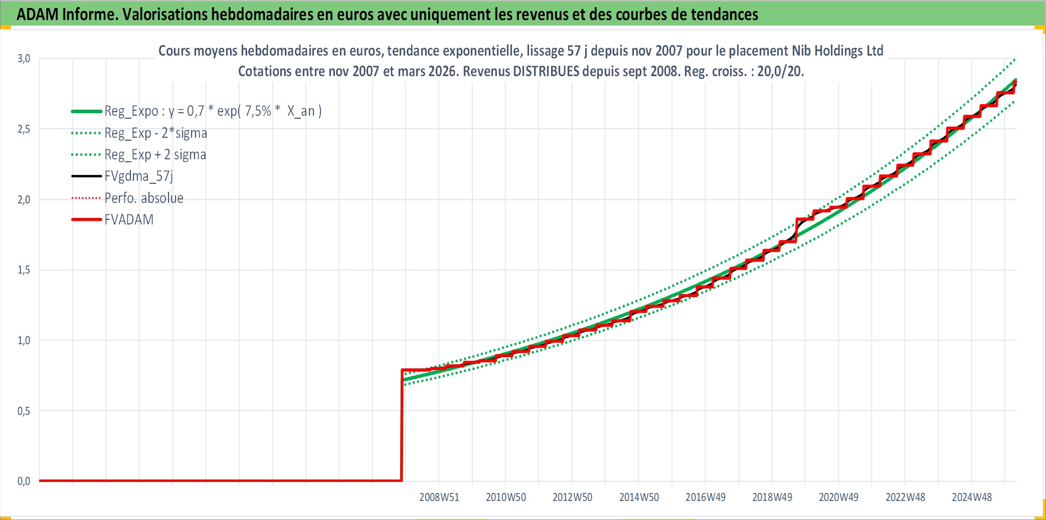 Site dédié aux investisseursPage dédiée sur site financeAnalyse des valorisations hebdomadaires de l'action Nib Holdings Ltd. Cet actif est cote en AUD. Les valorisations sont en contrevaleur EURO et couvrent les semaines 2007W45 a 2026W13. Les revenus de cet actif financier sont pris en compte depuis la semaine 2008W38. La note ESG de cet actif n'est pas connue.