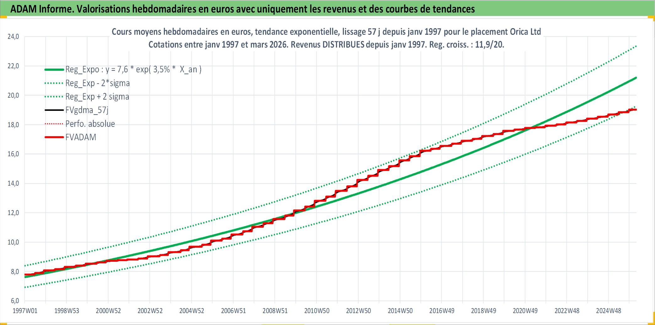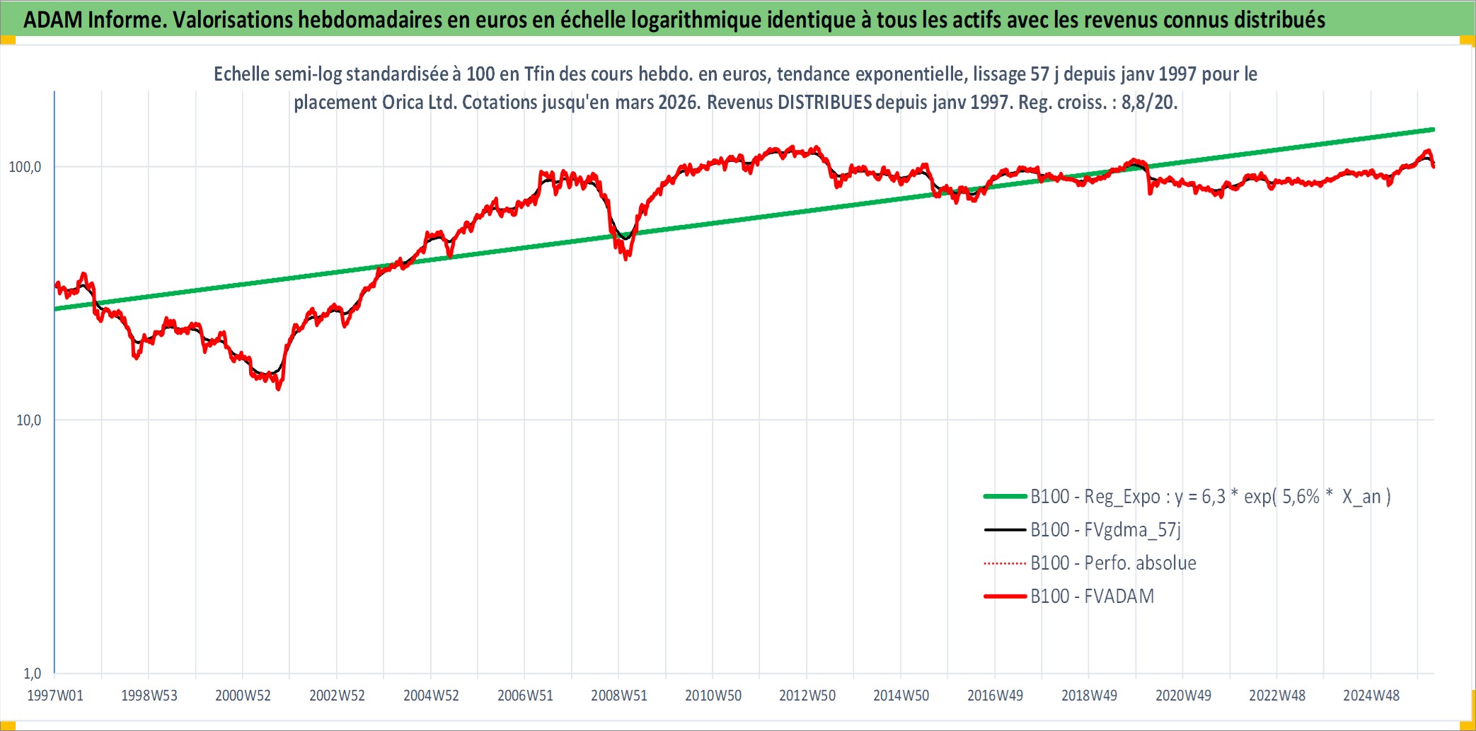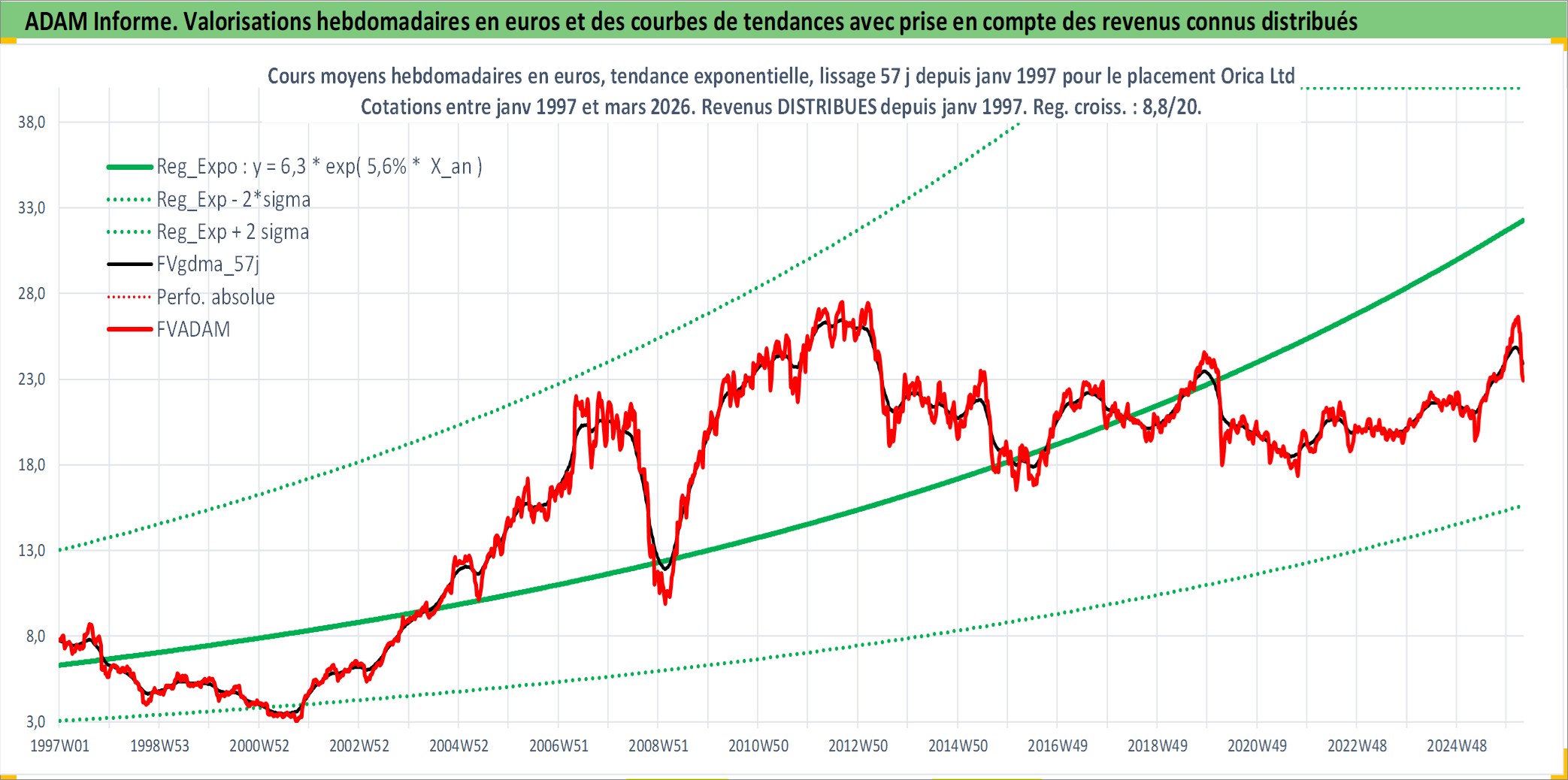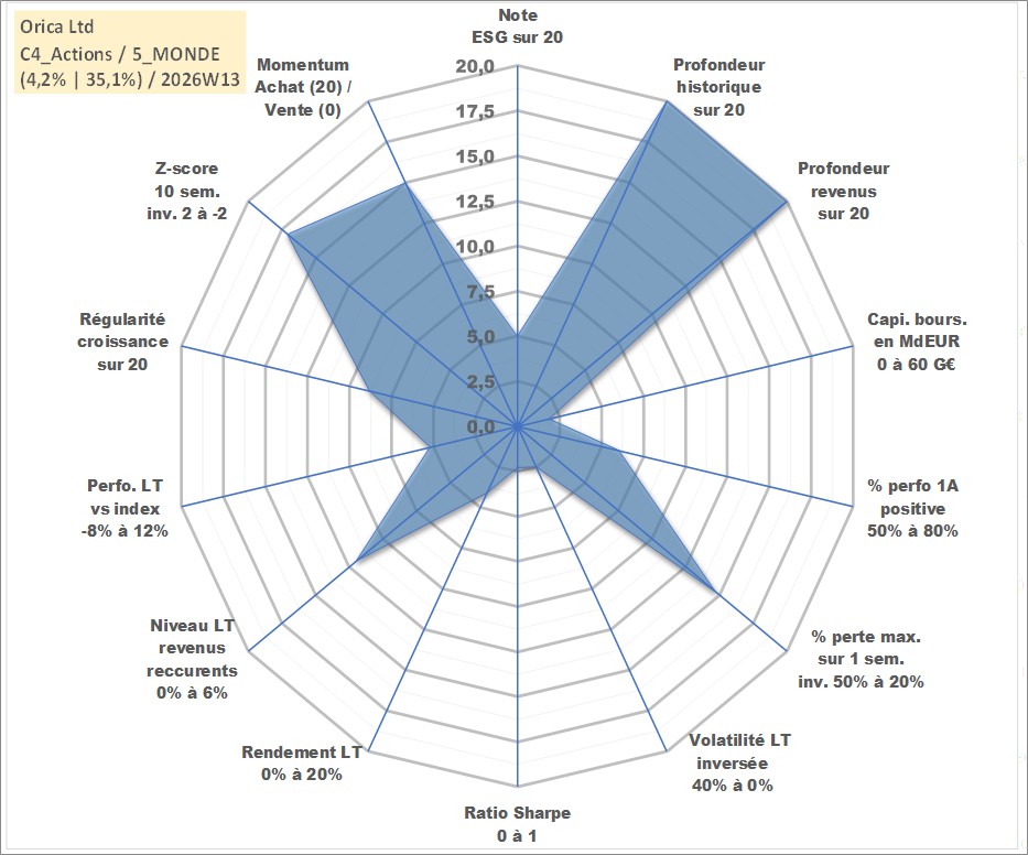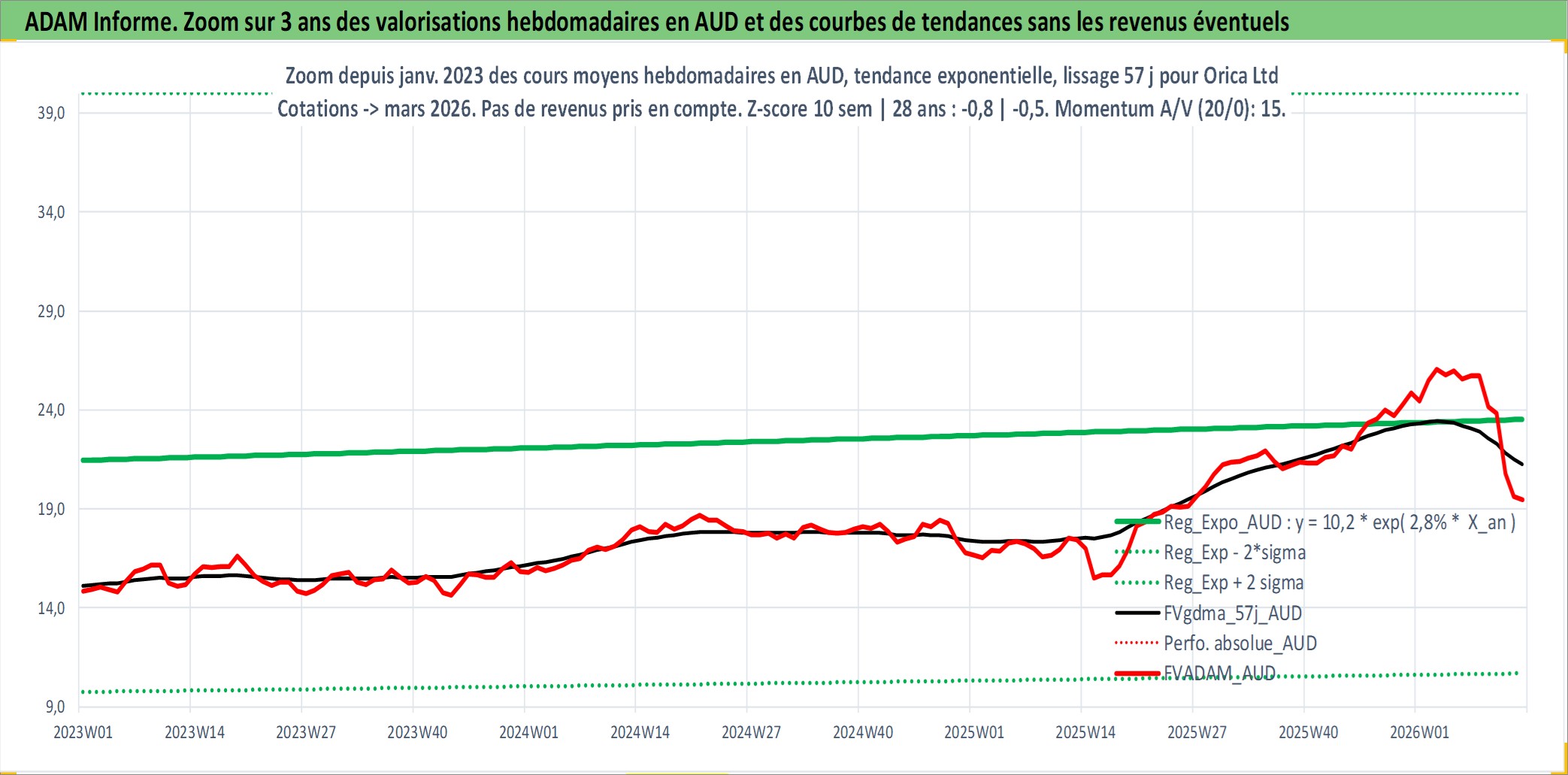 Site dédié aux investisseursPage dédiée sur site financeAnalyse des valorisations hebdomadaires de l'action Orica Ltd. Cet actif est cote en AUD. Les valorisations sont en contrevaleur EURO et couvrent les semaines 1997W01 a 2026W13. Les revenus de cet actif financier sont pris en compte depuis la semaine 1997W01. La note globale ESG de cet actif est estimee a 5.0 (apres rebasage entre 0 et 20).