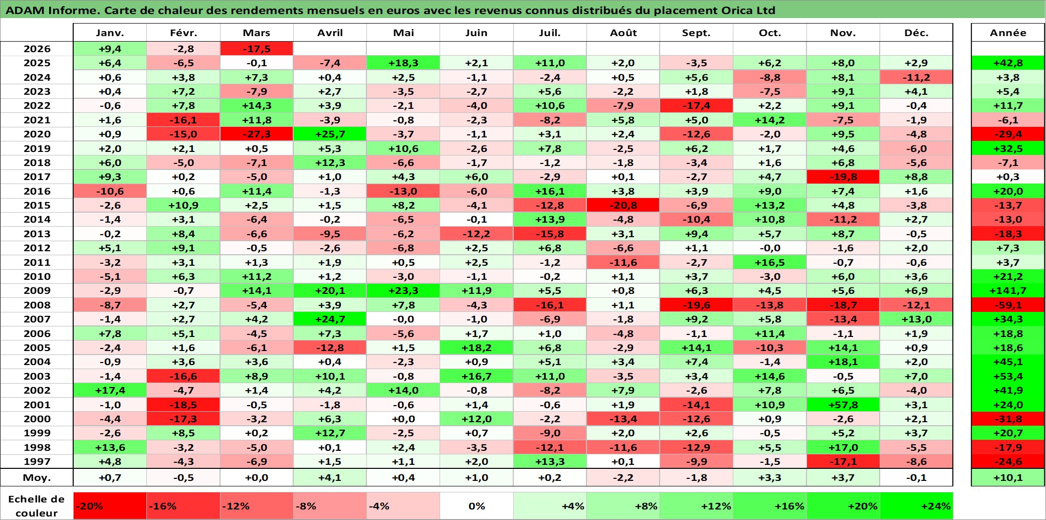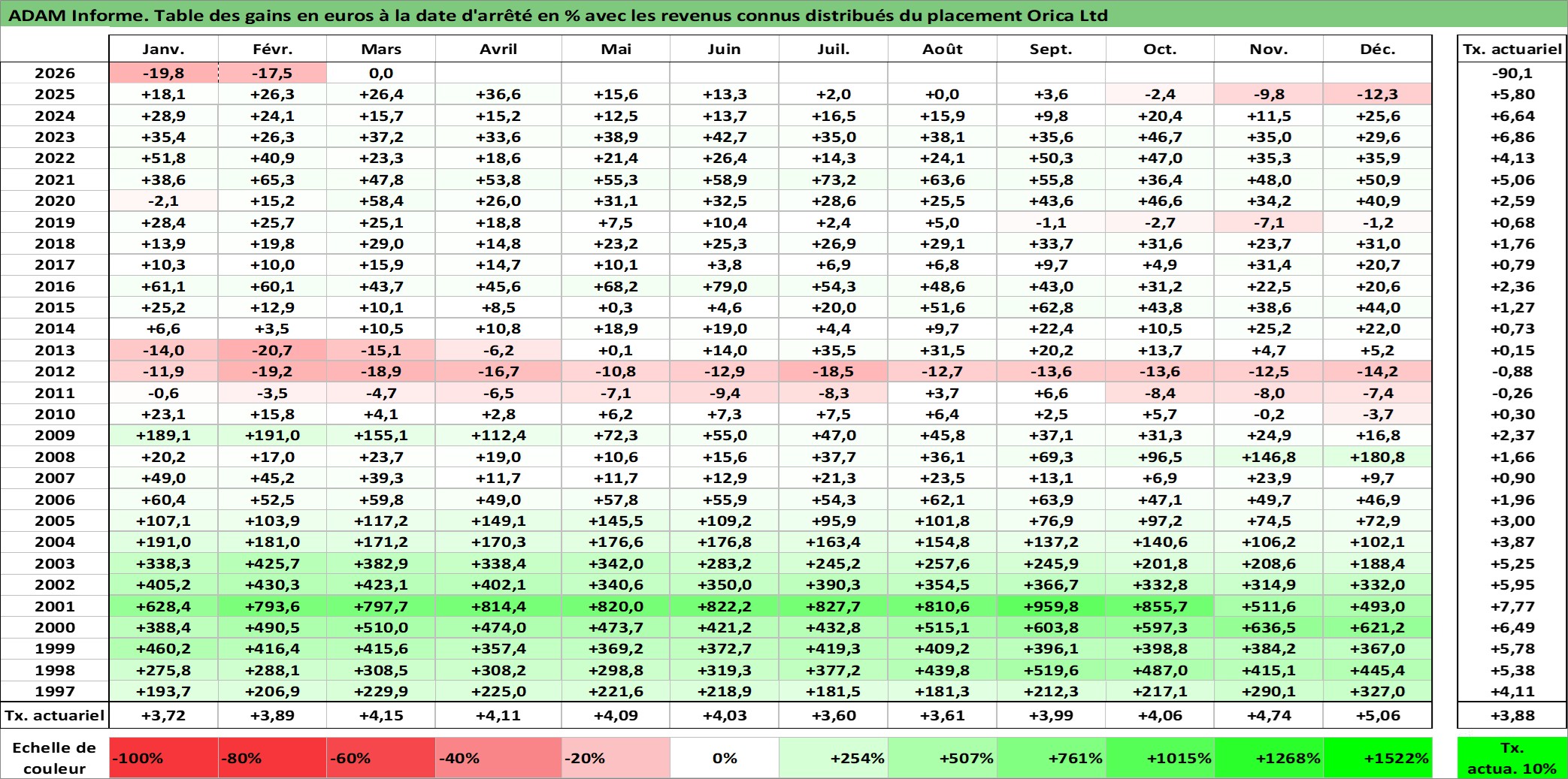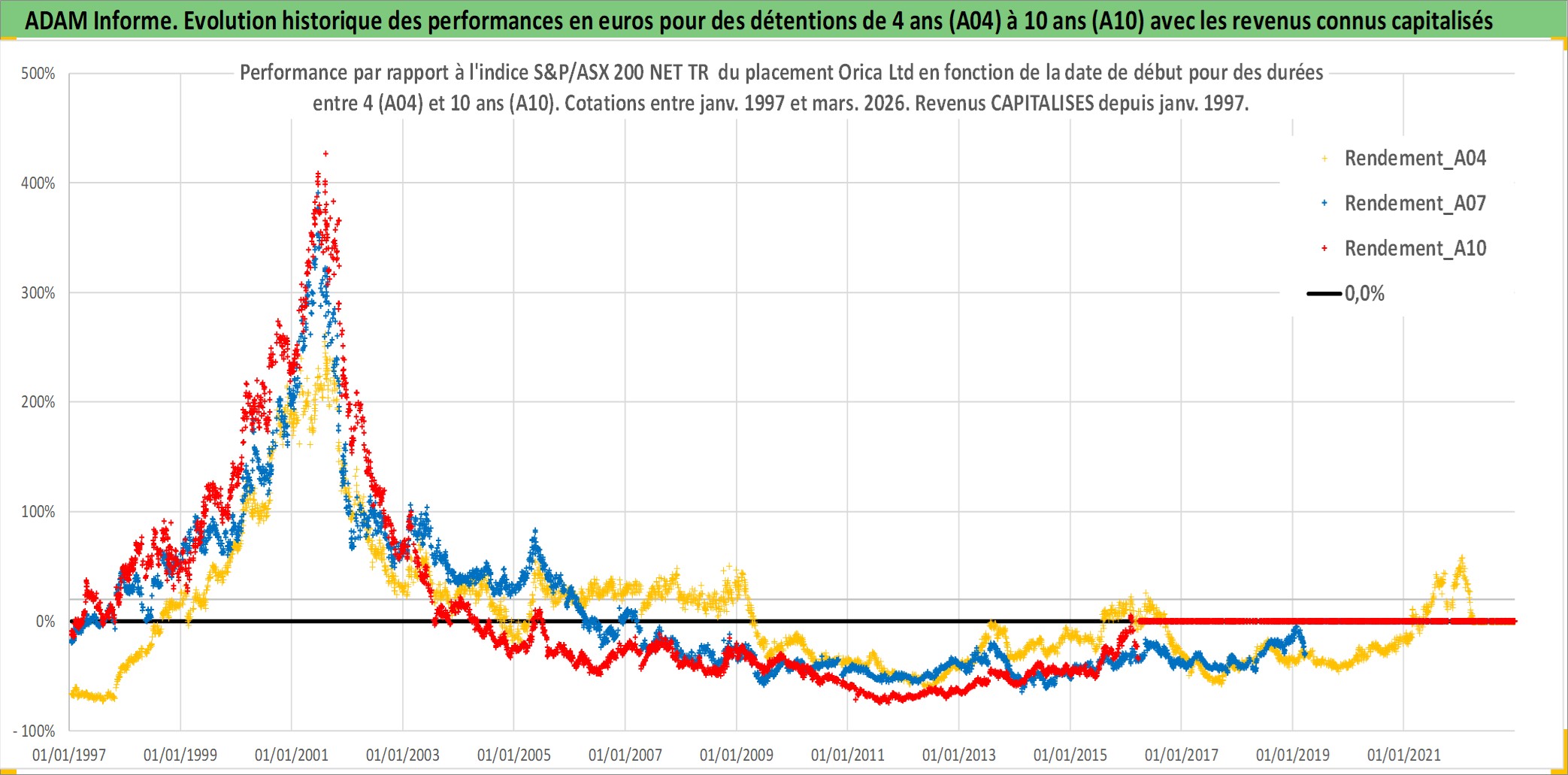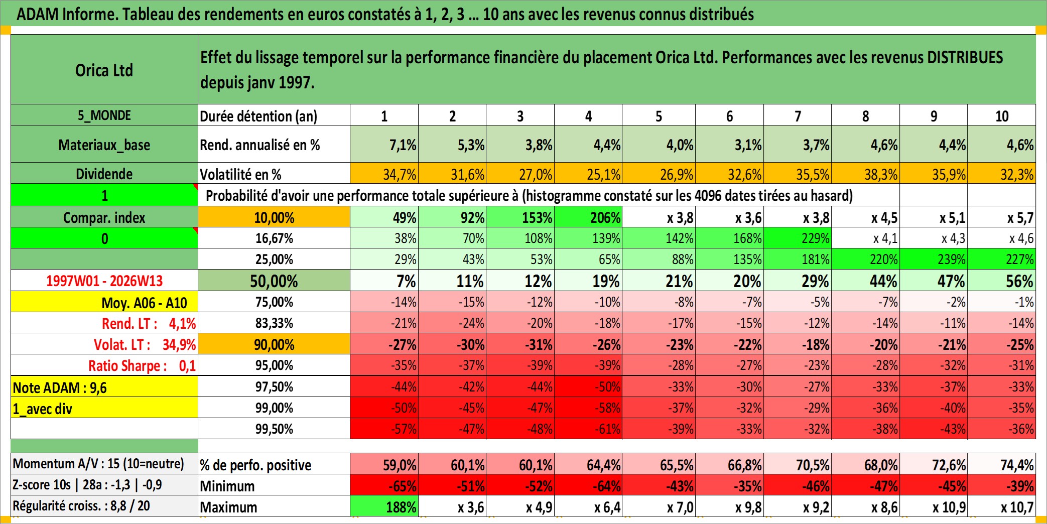 Site dédié aux investisseursPage dédiée sur site financeAnalyse des valorisations hebdomadaires de l'action Orica Ltd. Cet actif est cote en AUD. Les valorisations sont en contrevaleur EURO et couvrent les semaines 1997W01 a 2026W13. Les revenus de cet actif financier sont pris en compte depuis la semaine 1997W01. La note globale ESG de cet actif est estimee a 5.0 (apres rebasage entre 0 et 20).