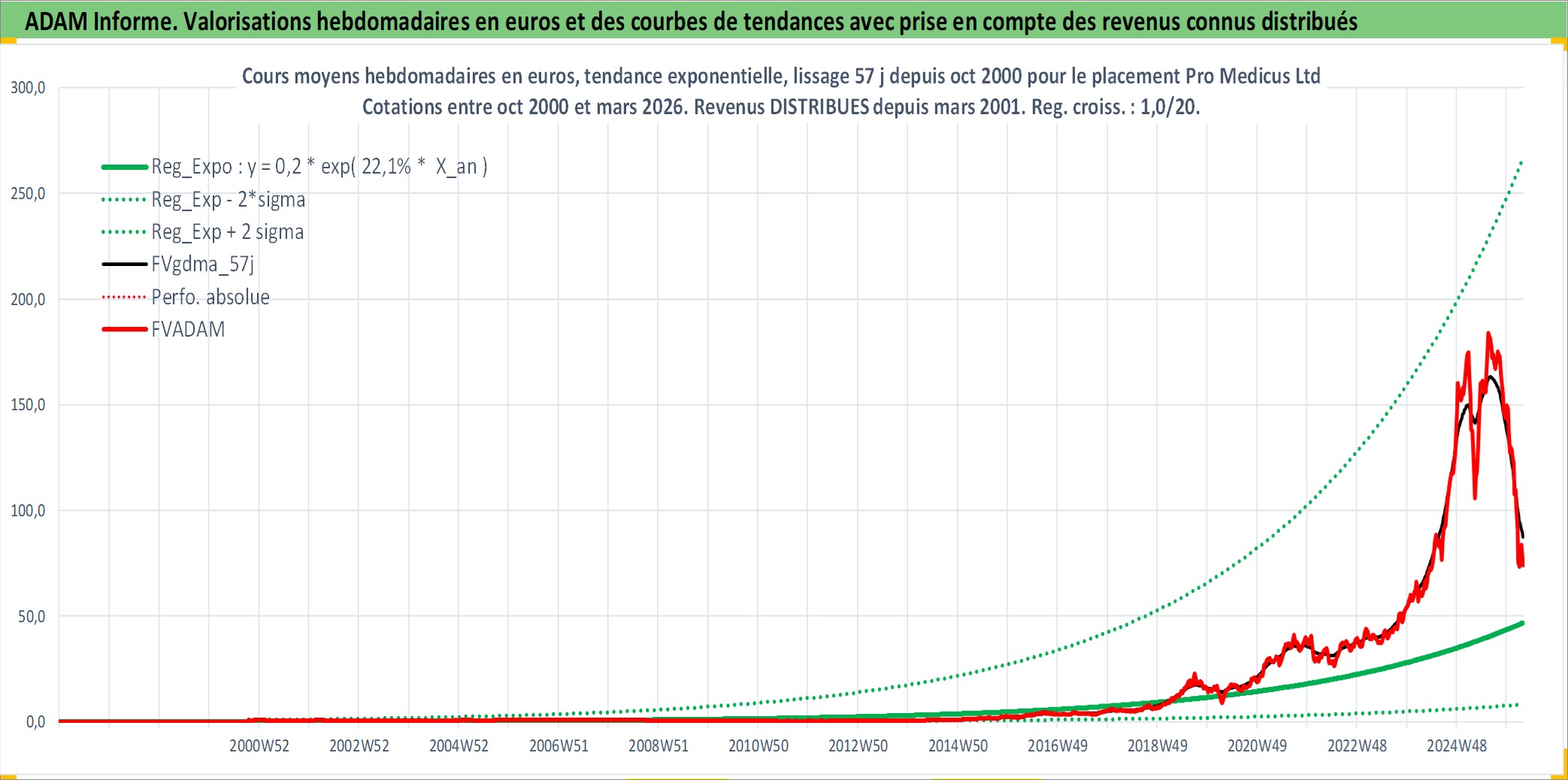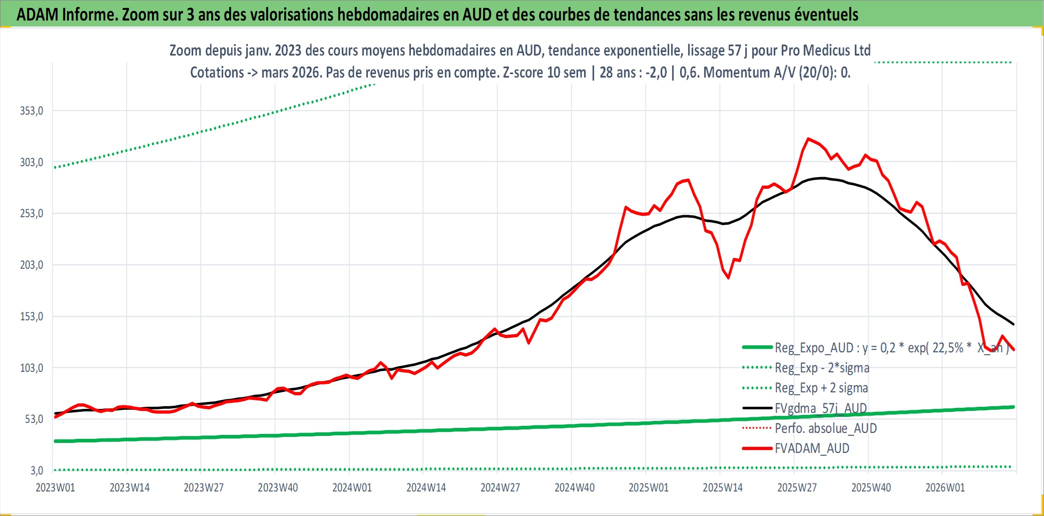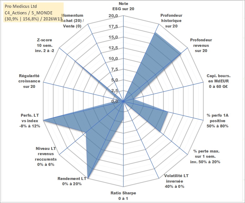 Site dédié aux investisseursPage dédiée sur site financeAnalyse des valorisations hebdomadaires de l'action Pro Medicus Ltd. Cet actif est cote en AUD. Les valorisations sont en contrevaleur EURO et couvrent les semaines 2000W41 a 2026W13. Les revenus de cet actif financier sont pris en compte depuis la semaine 2001W11. La note ESG de cet actif n'est pas connue.