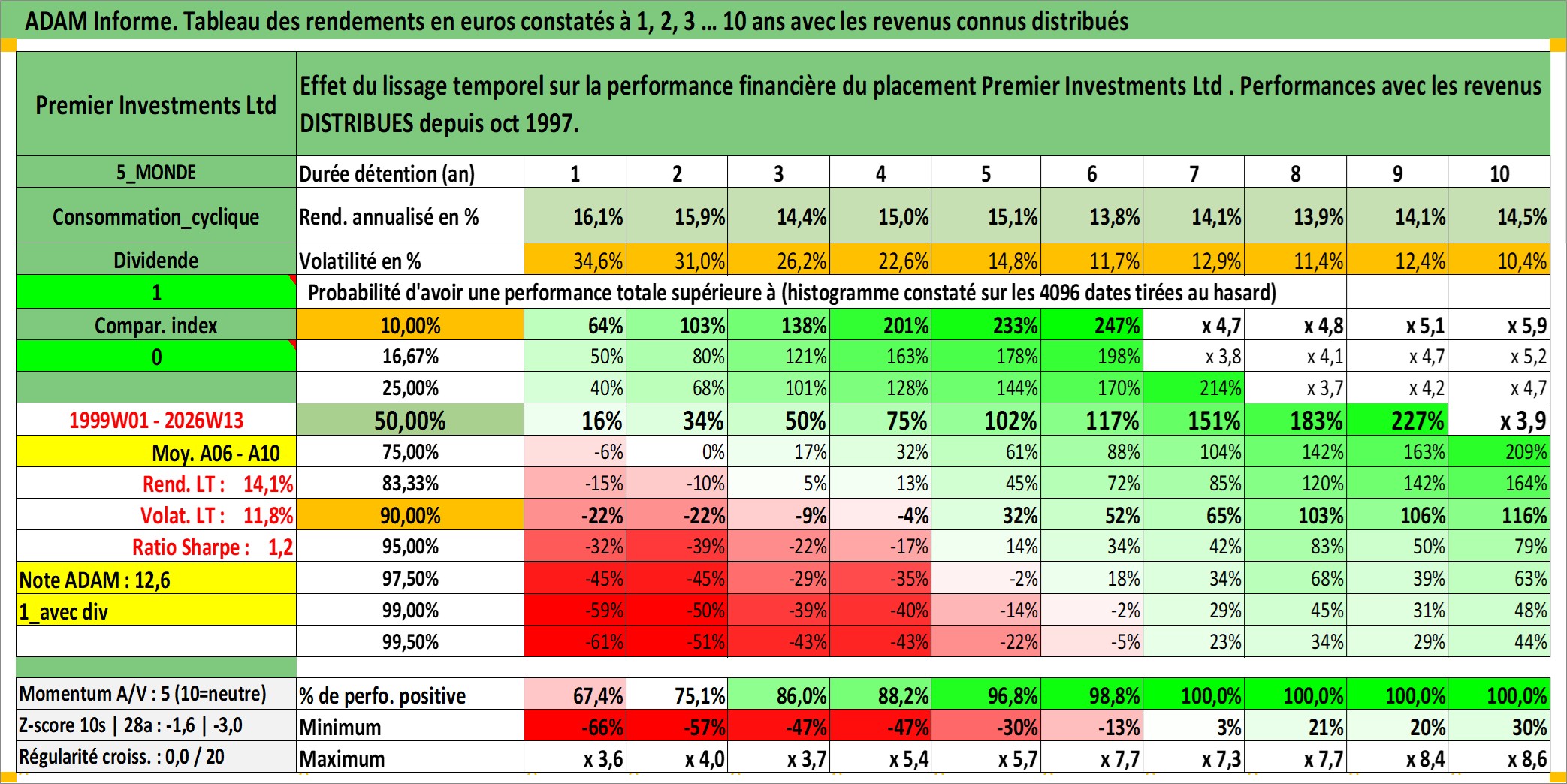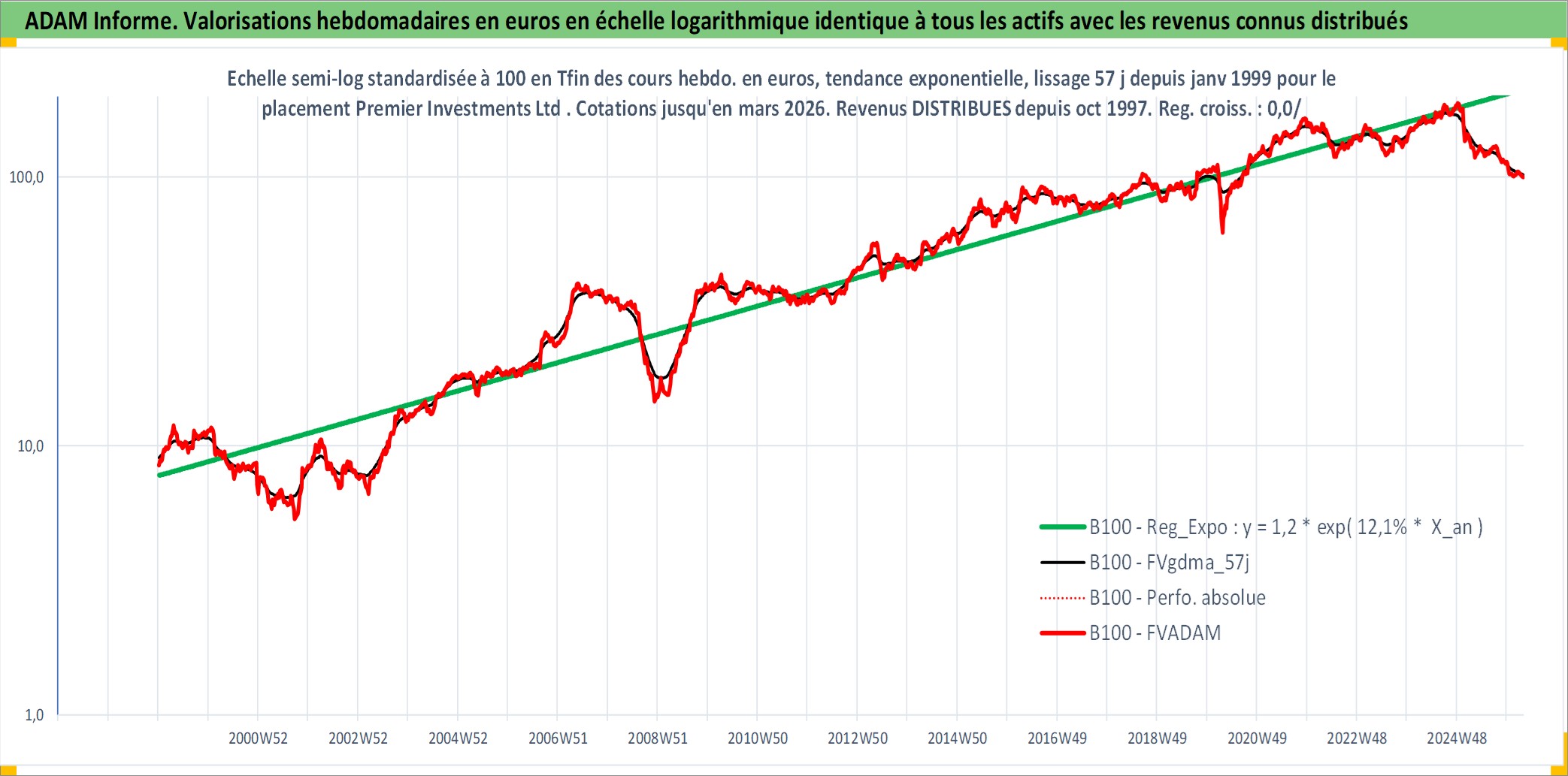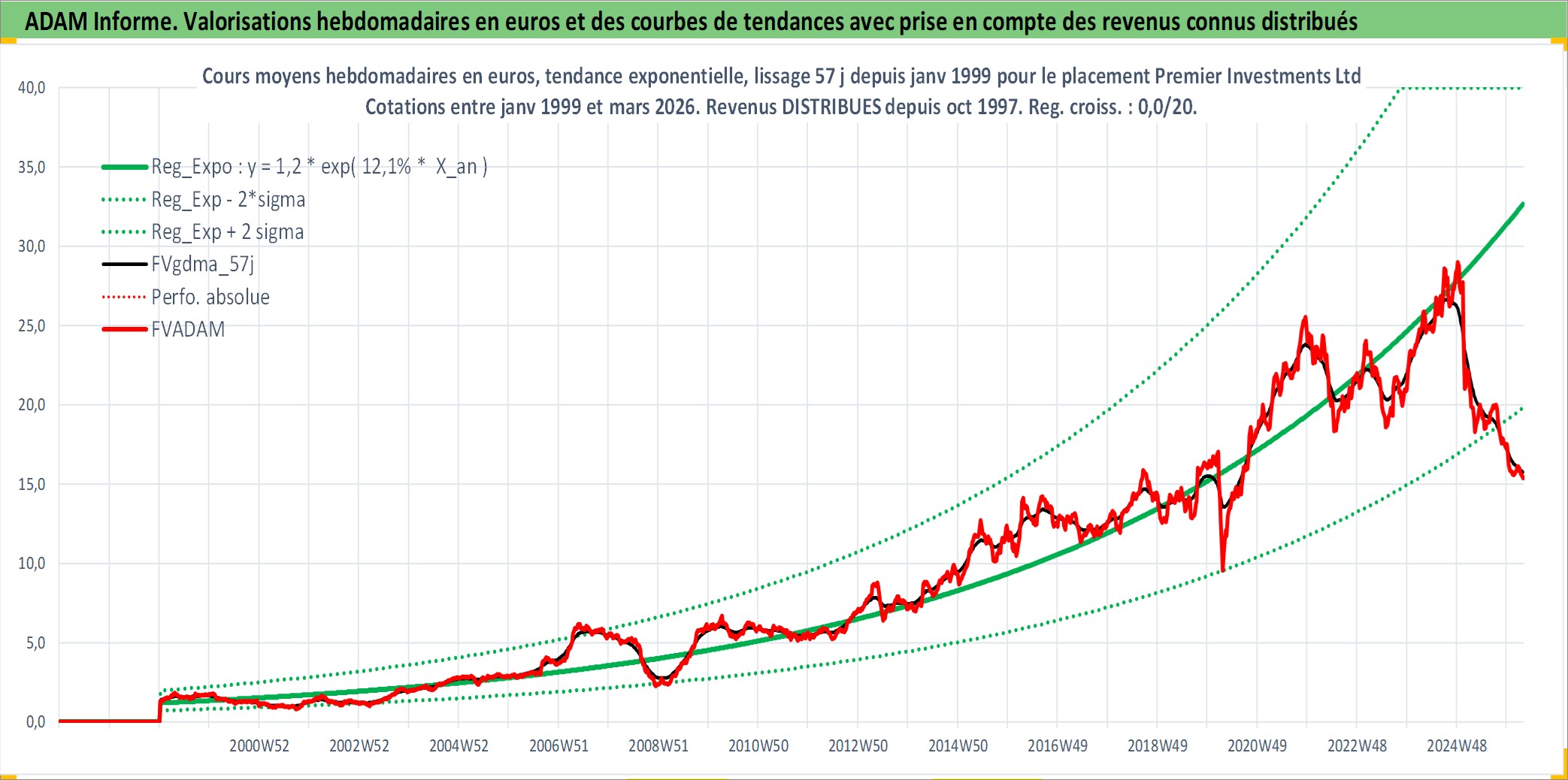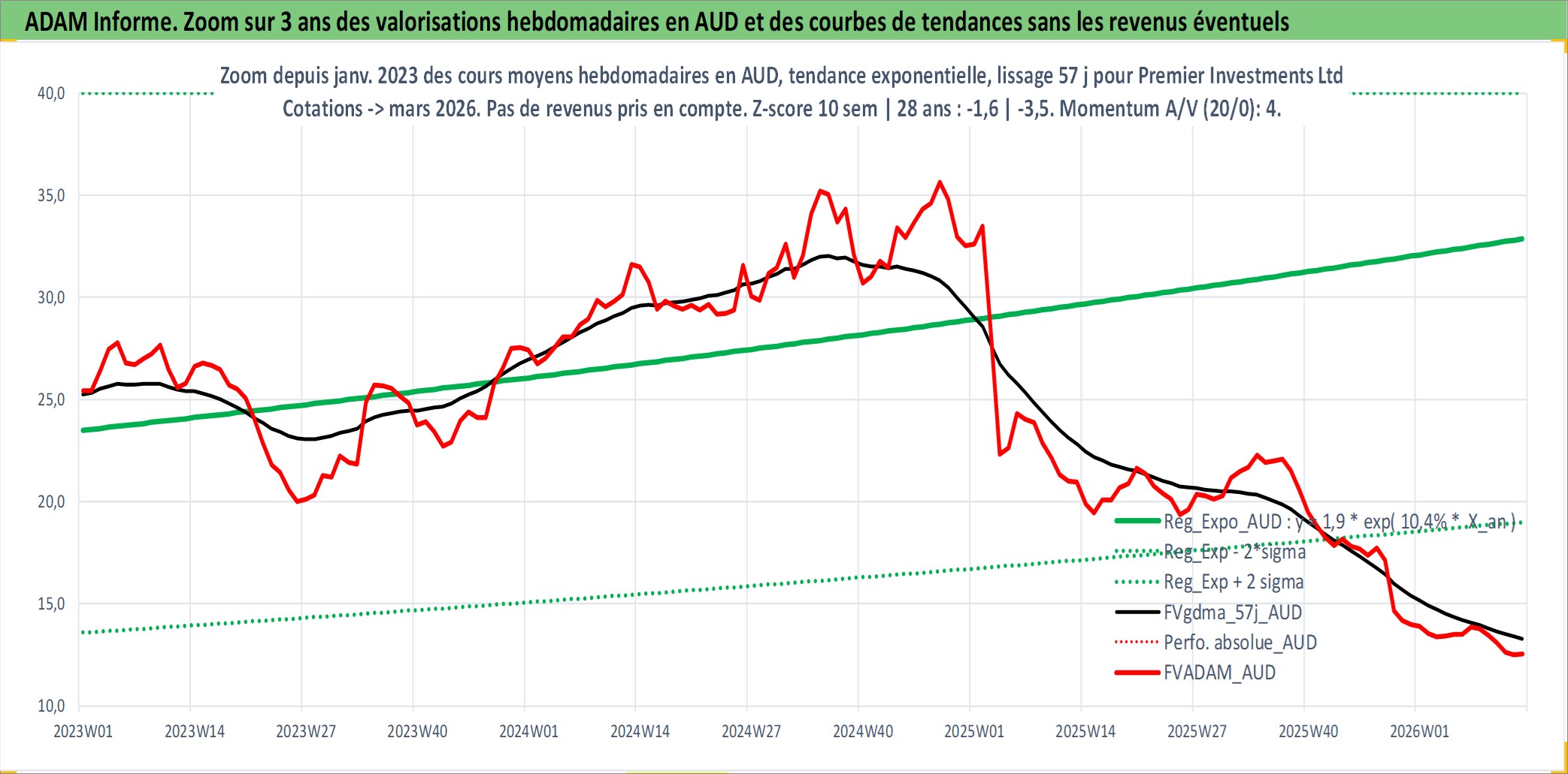 Site dédié aux investisseursPage dédiée sur site financeAnalyse des valorisations hebdomadaires de l'action Premier Investments Ltd . Cet actif est cote en AUD. Les valorisations sont en contrevaleur EURO et couvrent les semaines 1999W01 a 2026W13. Les revenus de cet actif financier sont pris en compte depuis la semaine 1997W44. La note ESG de cet actif n'est pas connue.