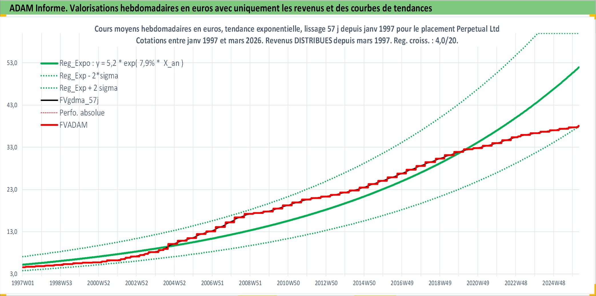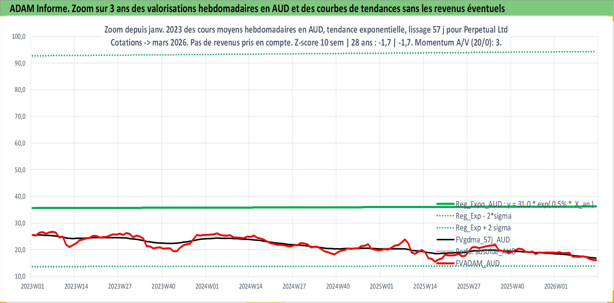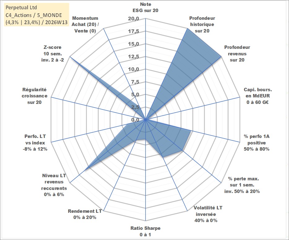 Site dédié aux investisseursPage dédiée sur site financeAnalyse des valorisations hebdomadaires de l'action Perpetual Ltd. Cet actif est cote en AUD. Les valorisations sont en contrevaleur EURO et couvrent les semaines 1997W01 a 2026W13. Les revenus de cet actif financier sont pris en compte depuis la semaine 1997W09. La note ESG de cet actif n'est pas connue.