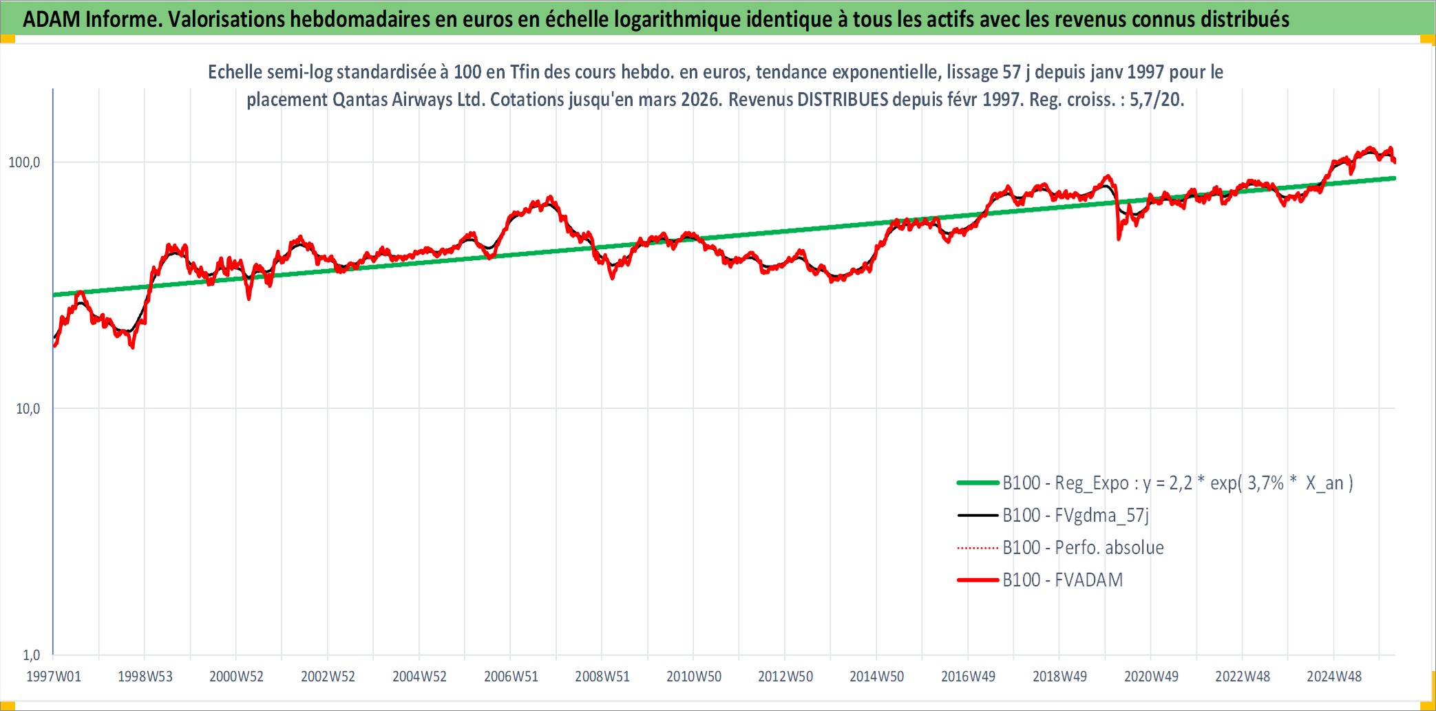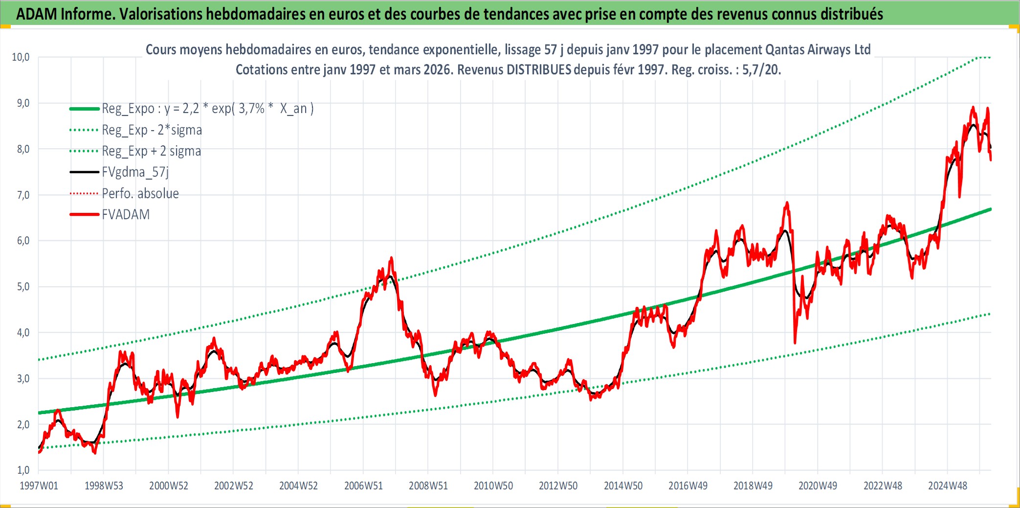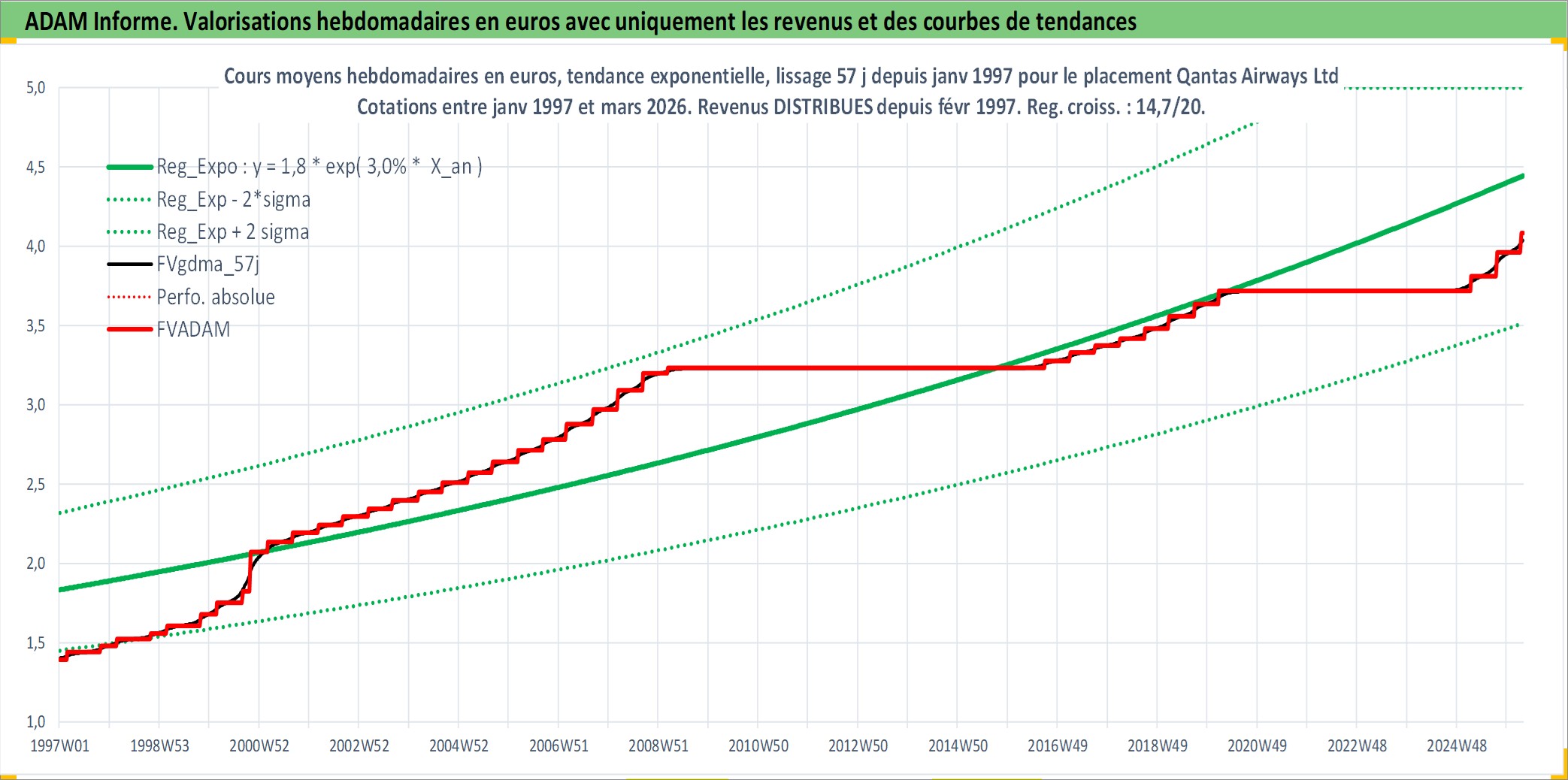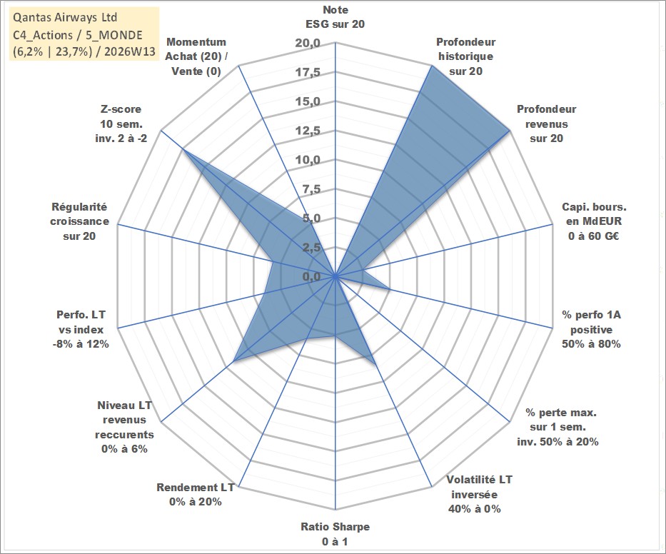 Site dédié aux investisseursPage dédiée sur site financeAnalyse des valorisations hebdomadaires de l'action Qantas Airways Ltd. Cet actif est cote en AUD. Les valorisations sont en contrevaleur EURO et couvrent les semaines 1997W01 a 2026W13. Les revenus de cet actif financier sont pris en compte depuis la semaine 1997W09. La note ESG de cet actif n'est pas connue.
