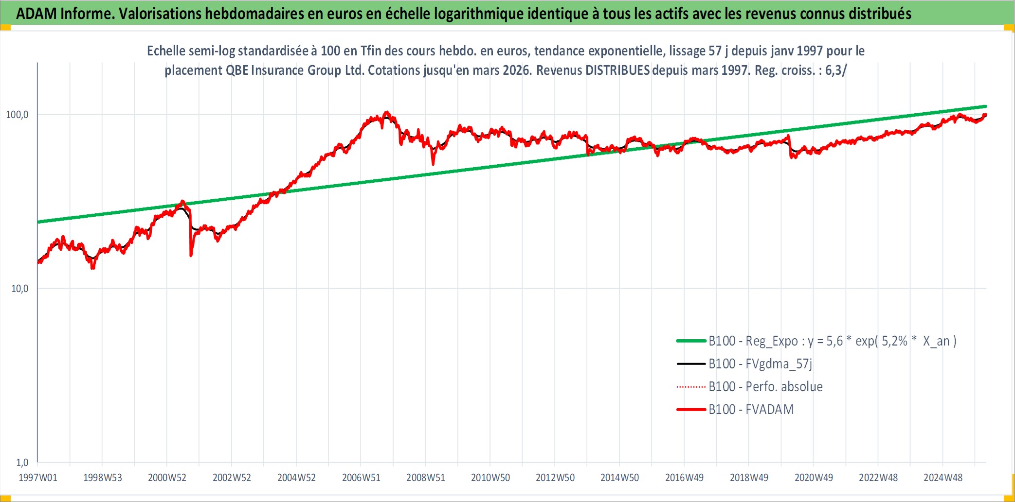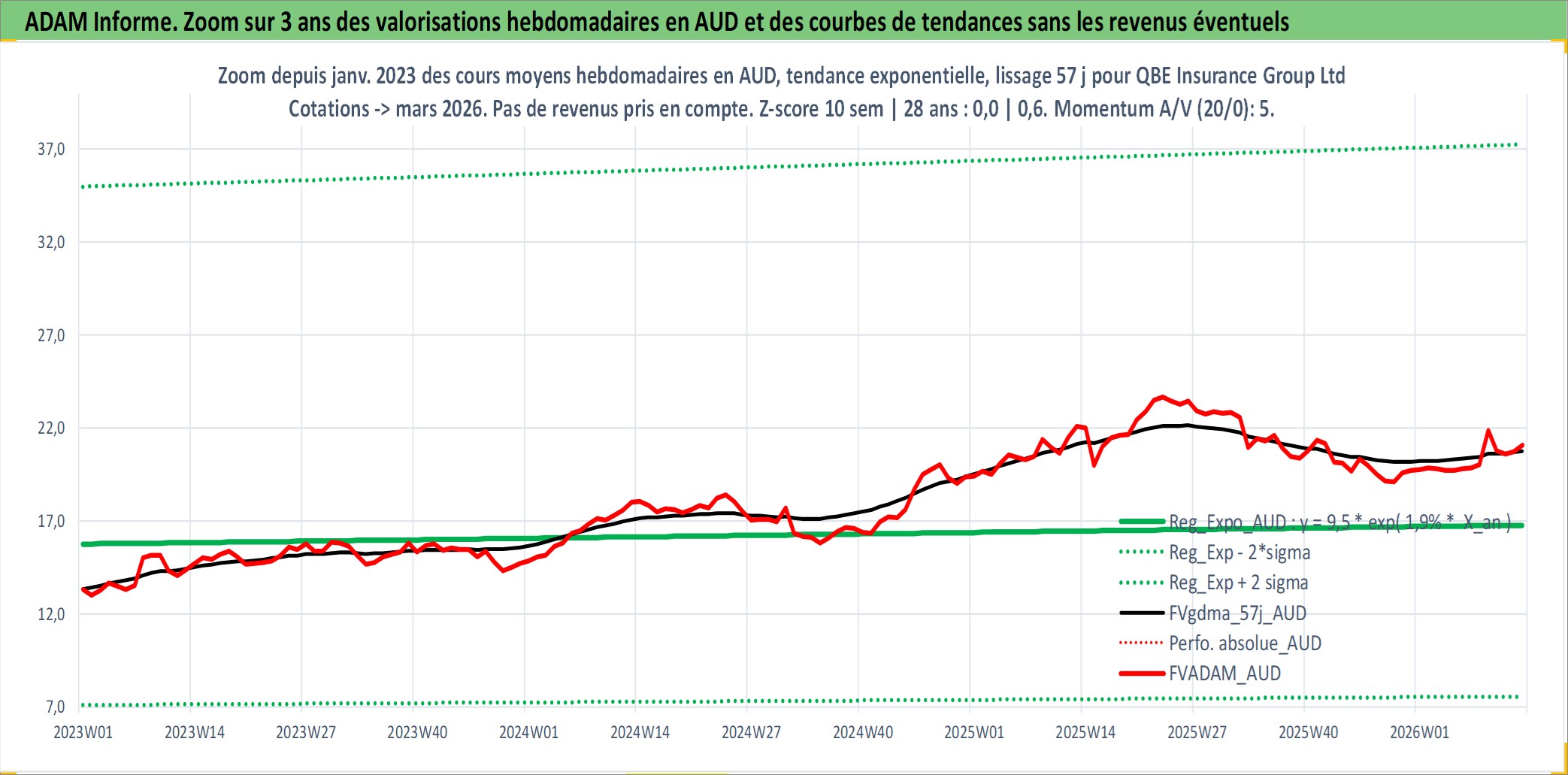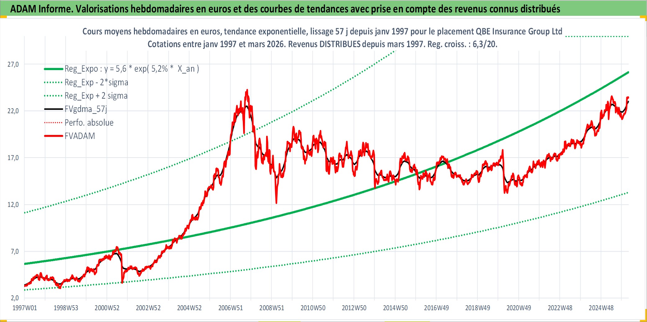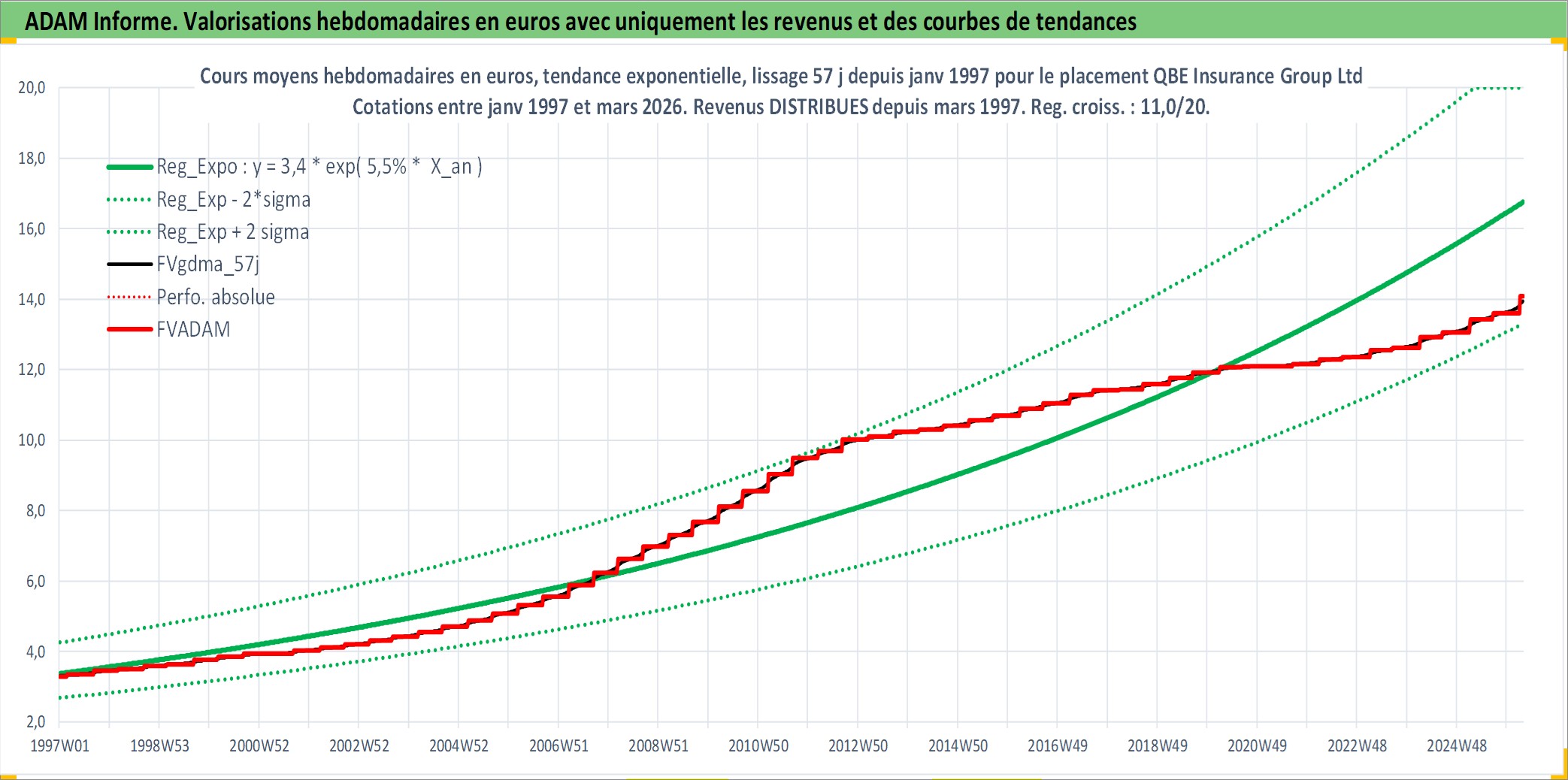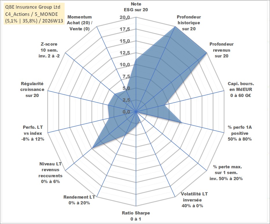 Site dédié aux investisseursPage dédiée sur site financeAnalyse des valorisations hebdomadaires de l'action QBE Insurance Group Ltd. Cet actif est cote en AUD. Les valorisations sont en contrevaleur EURO et couvrent les semaines 1997W01 a 2026W13. Les revenus de cet actif financier sont pris en compte depuis la semaine 1997W09. La note globale ESG de cet actif est estimee a 11.0 (apres rebasage entre 0 et 20).