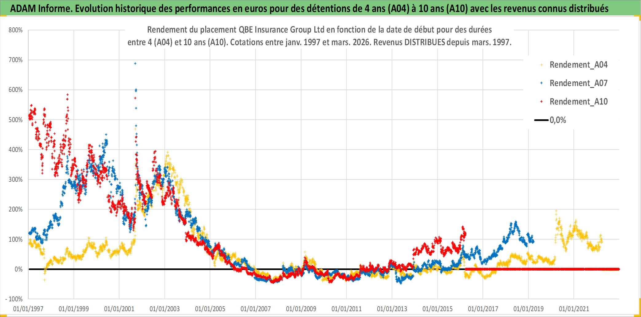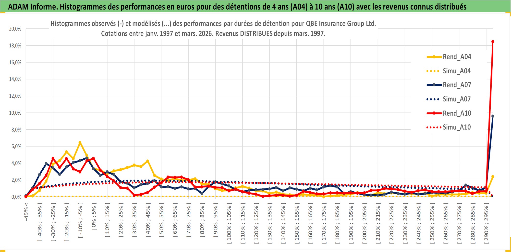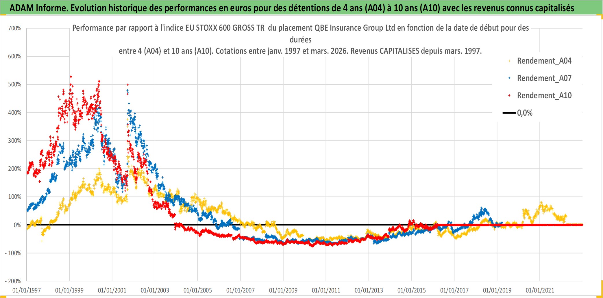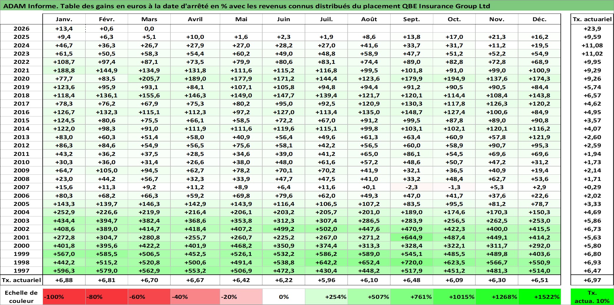 Site dédié aux investisseursPage dédiée sur site financeAnalyse des valorisations hebdomadaires de l'action QBE Insurance Group Ltd. Cet actif est cote en AUD. Les valorisations sont en contrevaleur EURO et couvrent les semaines 1997W01 a 2026W13. Les revenus de cet actif financier sont pris en compte depuis la semaine 1997W09. La note globale ESG de cet actif est estimee a 11.0 (apres rebasage entre 0 et 20).