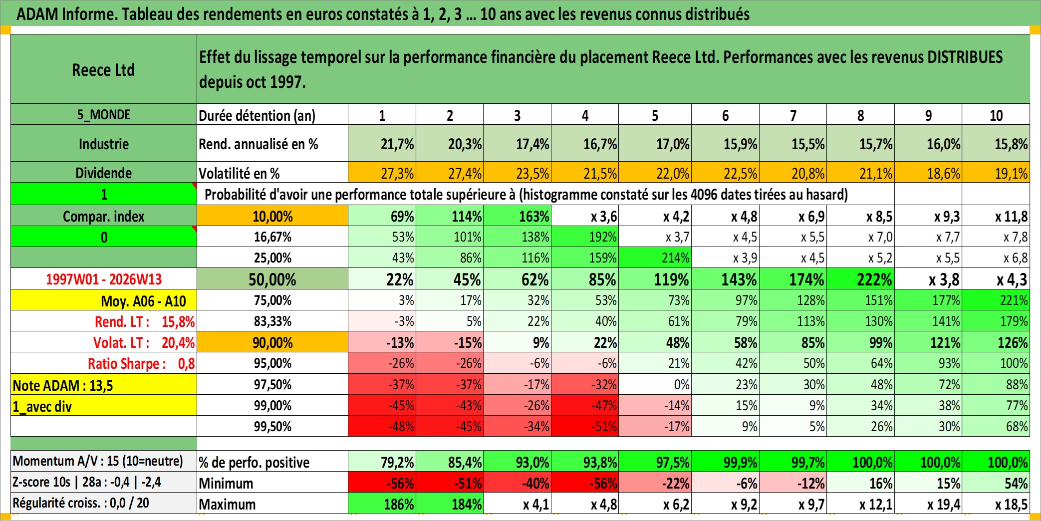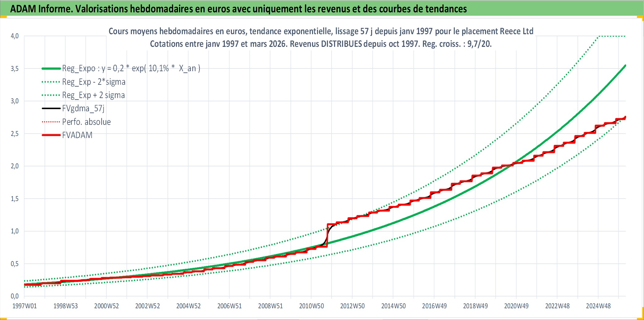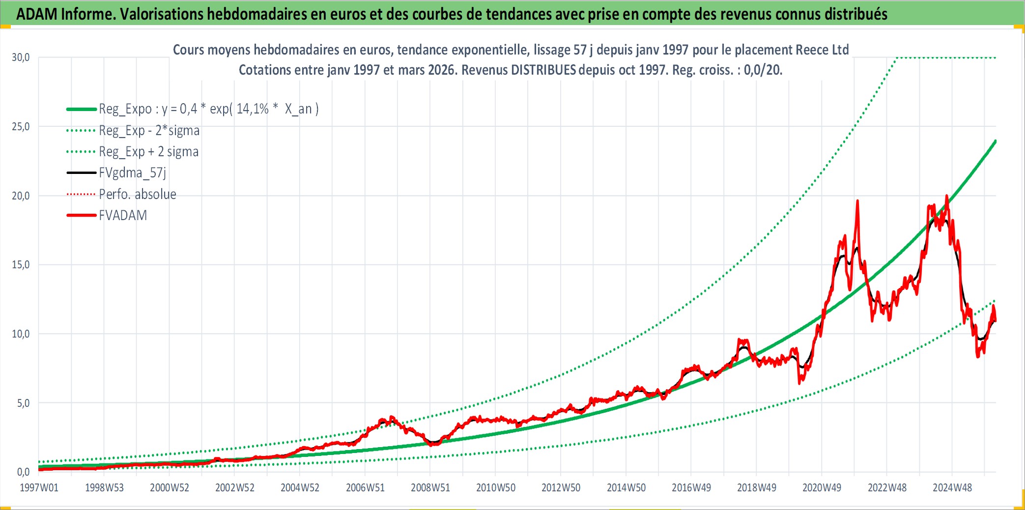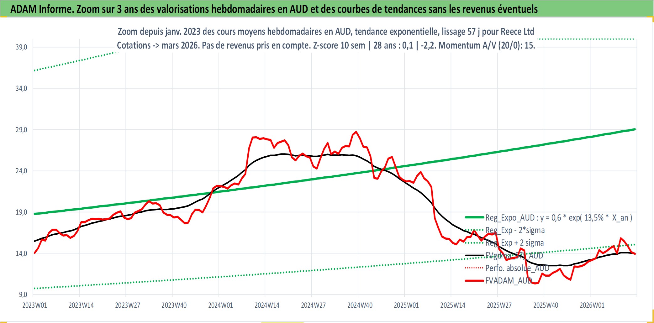 Site dédié aux investisseursPage dédiée sur site financeAnalyse des valorisations hebdomadaires de l'action Reece Ltd. Cet actif est cote en AUD. Les valorisations sont en contrevaleur EURO et couvrent les semaines 1997W01 a 2026W13. Les revenus de cet actif financier sont pris en compte depuis la semaine 1997W43. La note ESG de cet actif n'est pas connue.