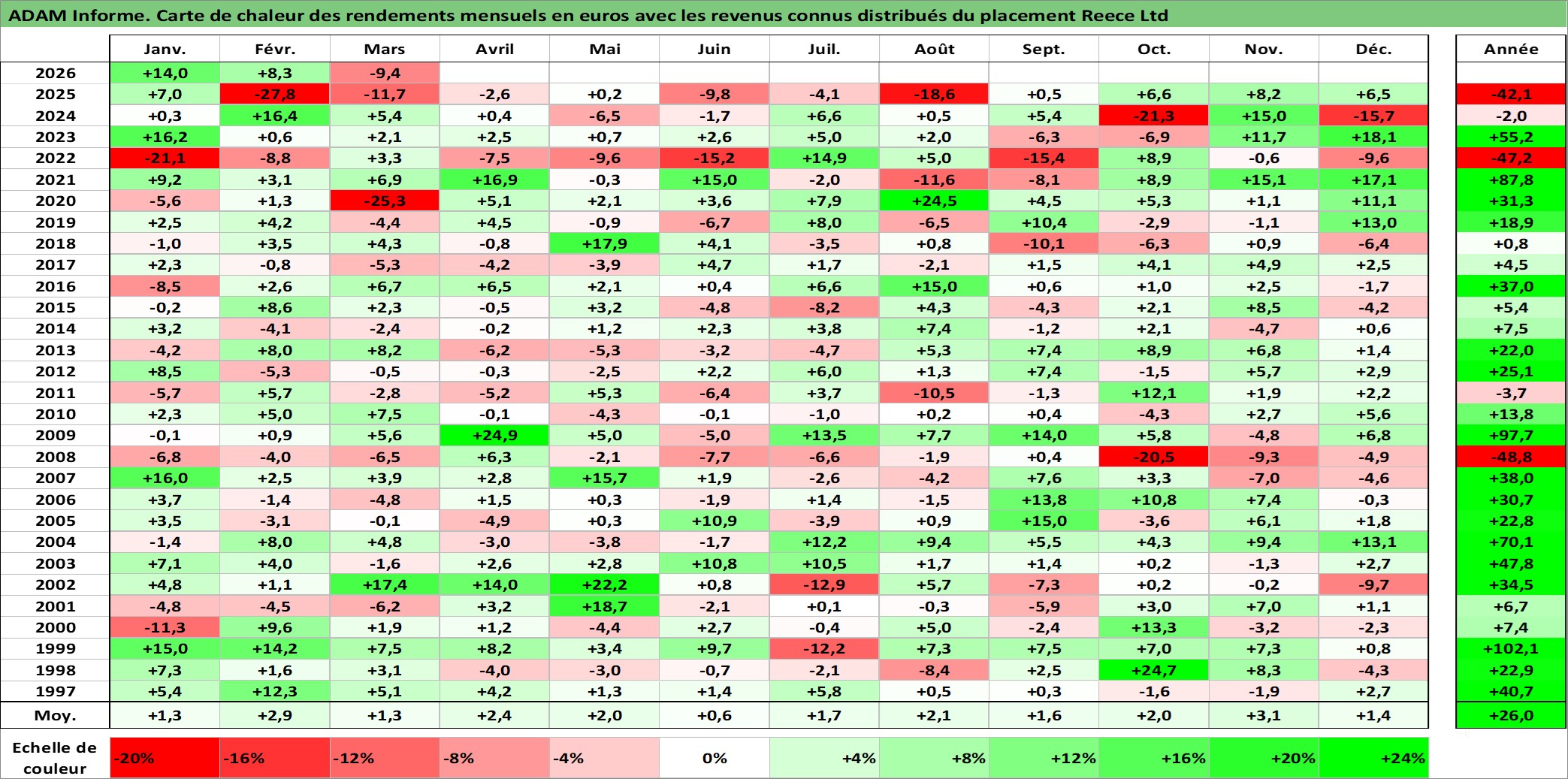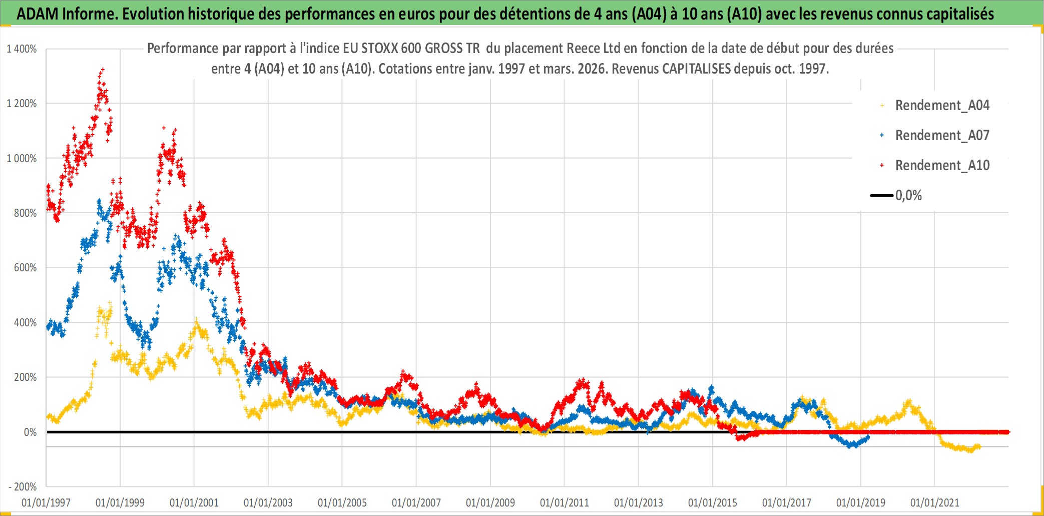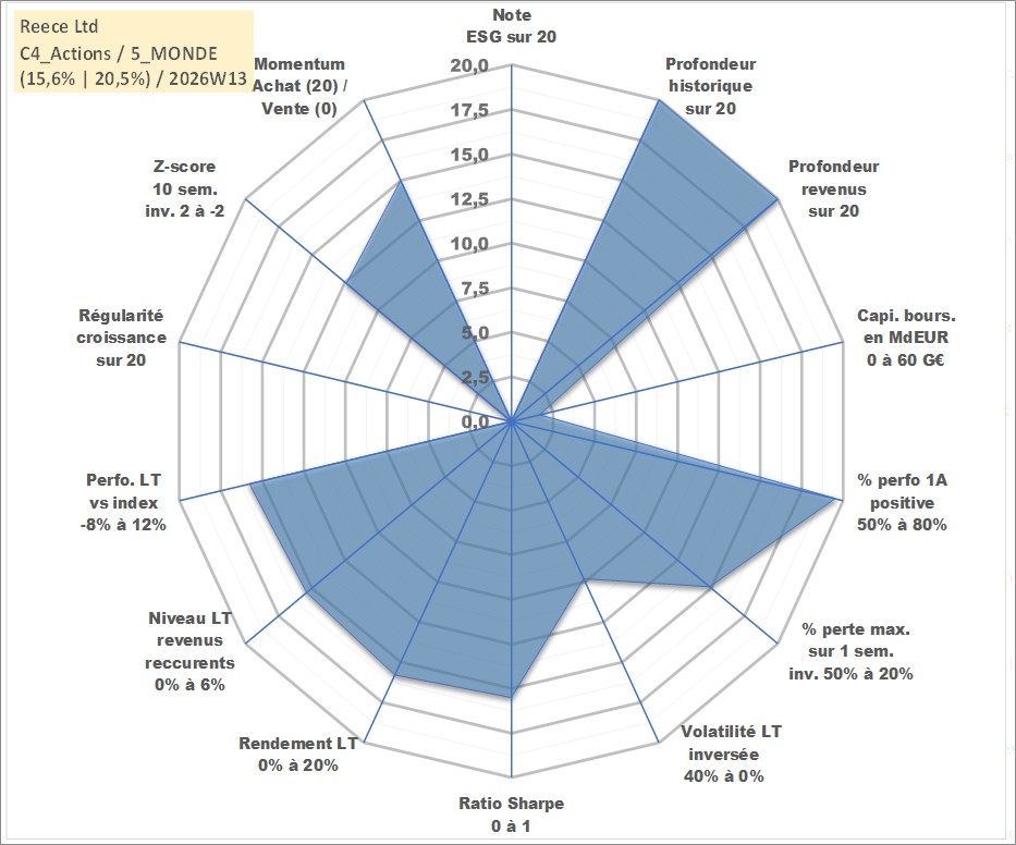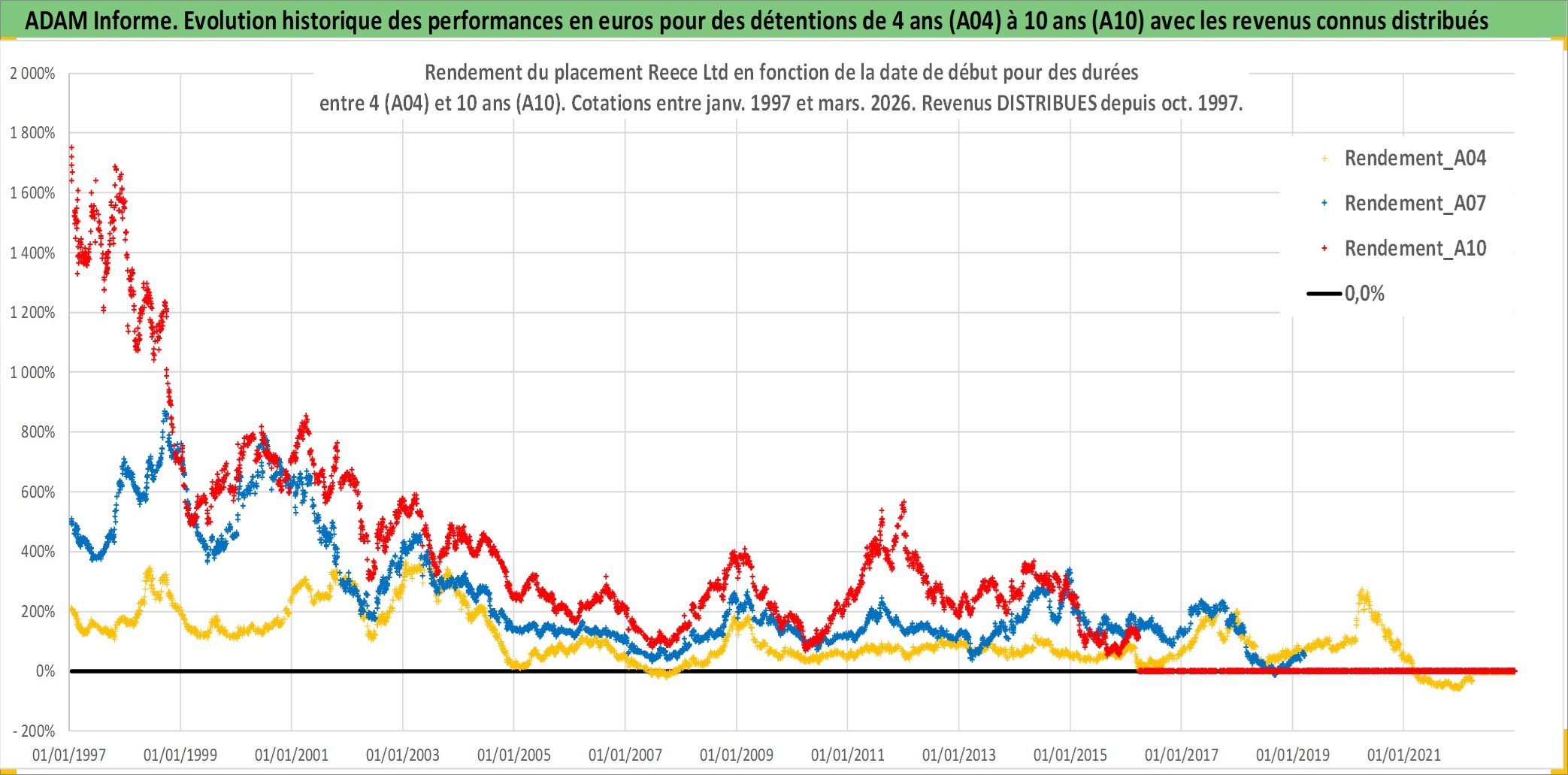 Site dédié aux investisseursPage dédiée sur site financeAnalyse des valorisations hebdomadaires de l'action Reece Ltd. Cet actif est cote en AUD. Les valorisations sont en contrevaleur EURO et couvrent les semaines 1997W01 a 2026W13. Les revenus de cet actif financier sont pris en compte depuis la semaine 1997W43. La note ESG de cet actif n'est pas connue.
