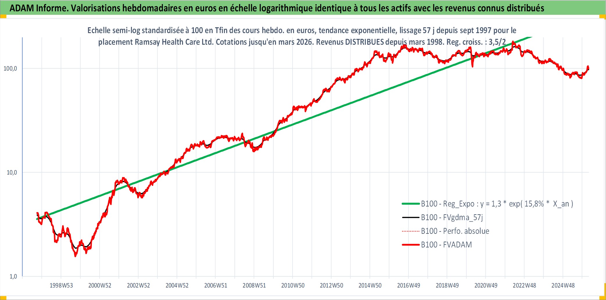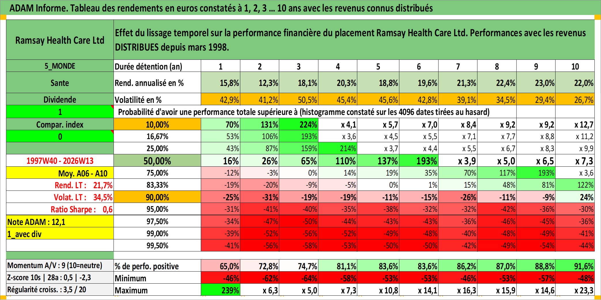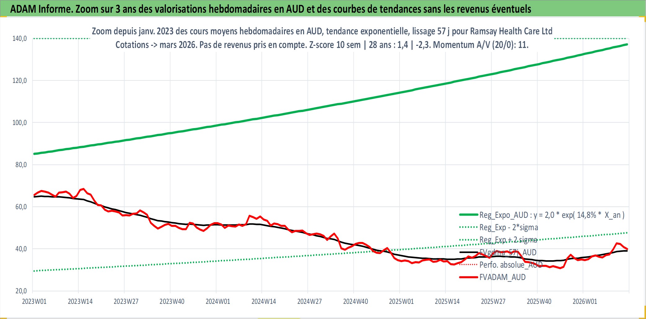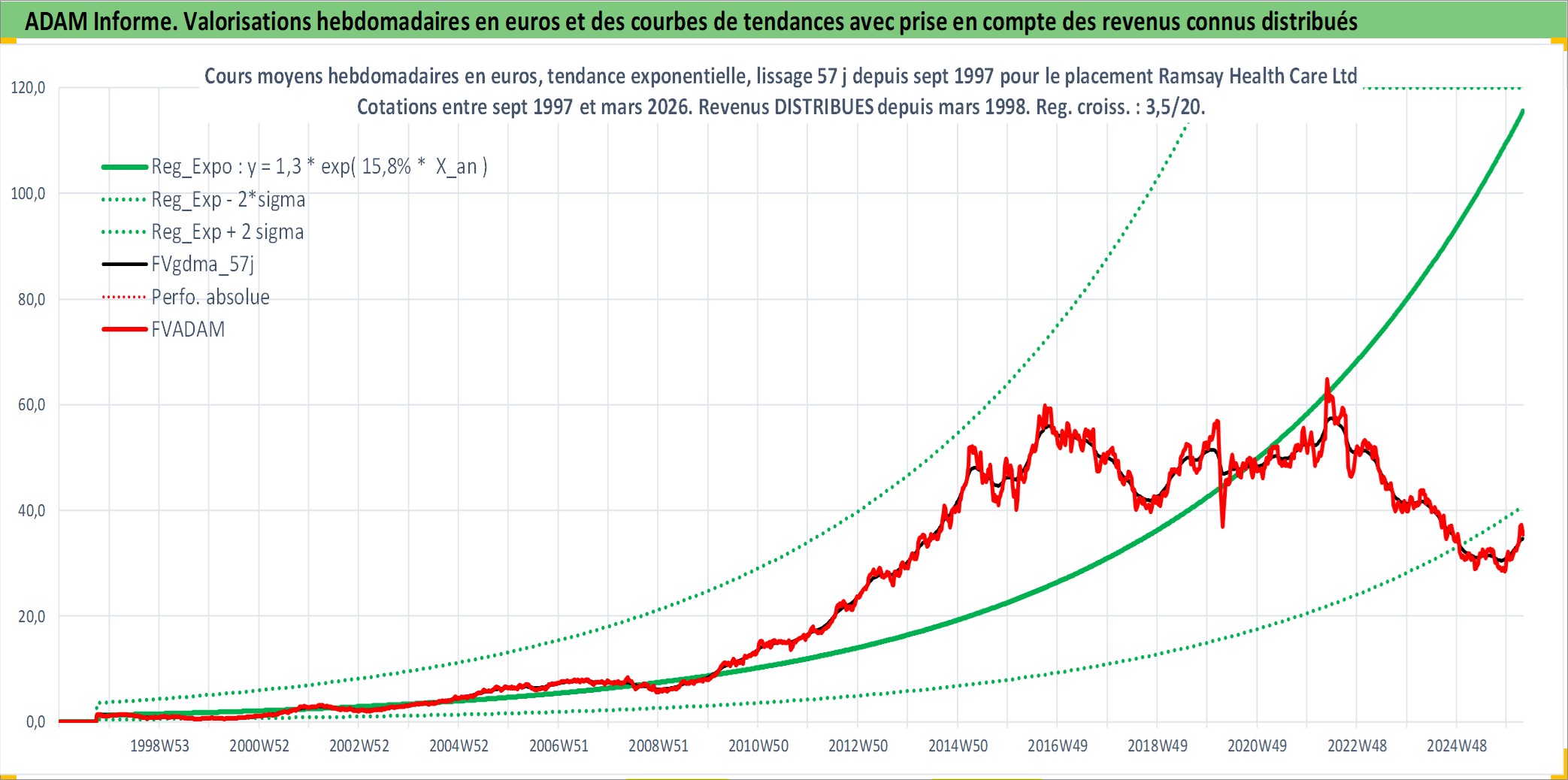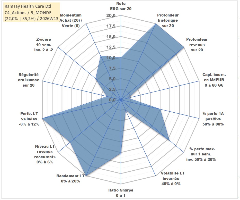 Site dédié aux investisseursPage dédiée sur site financeAnalyse des valorisations hebdomadaires de l'action Ramsay Health Care Ltd. Cet actif est cote en AUD. Les valorisations sont en contrevaleur EURO et couvrent les semaines 1997W40 a 2026W13. Les revenus de cet actif financier sont pris en compte depuis la semaine 1998W10. La note globale ESG de cet actif est estimee a 10.0 (apres rebasage entre 0 et 20).