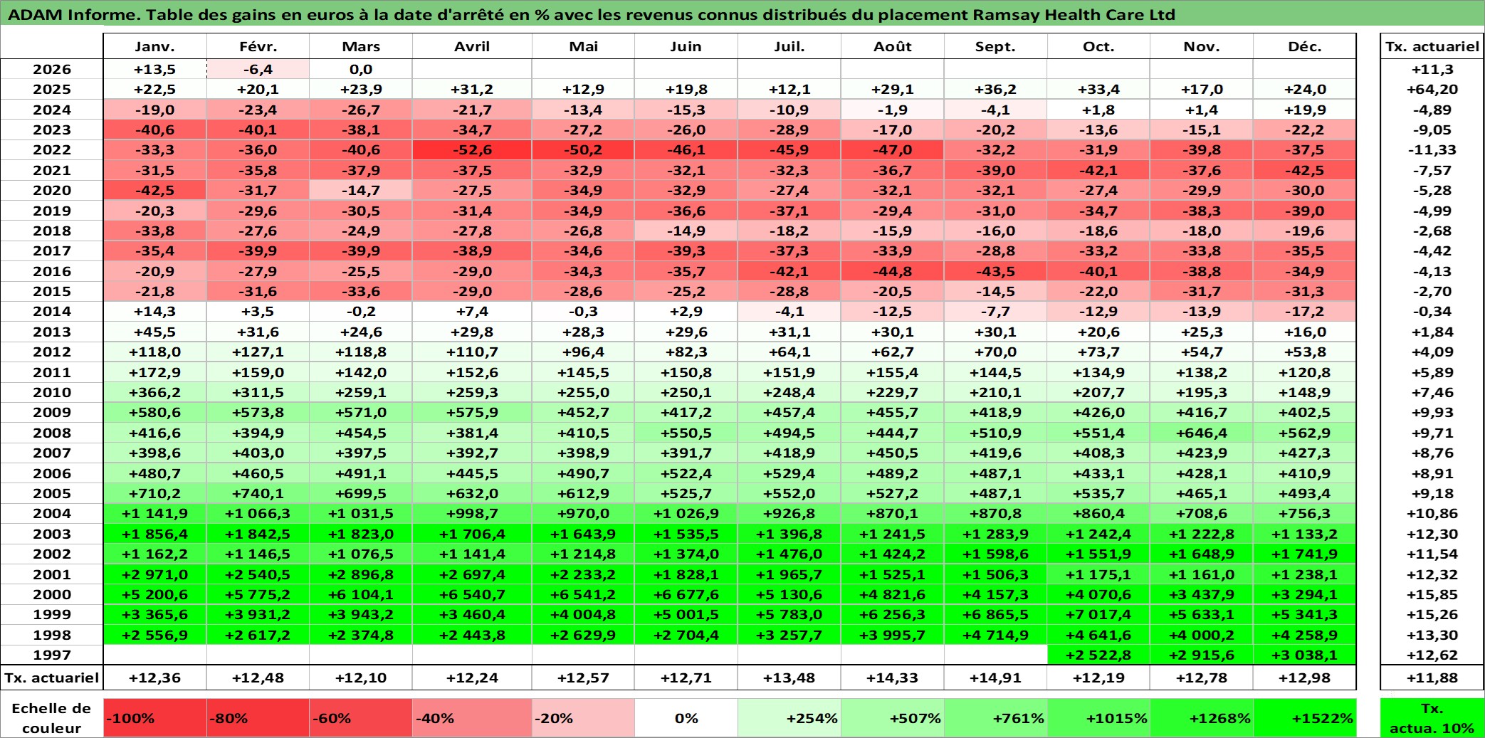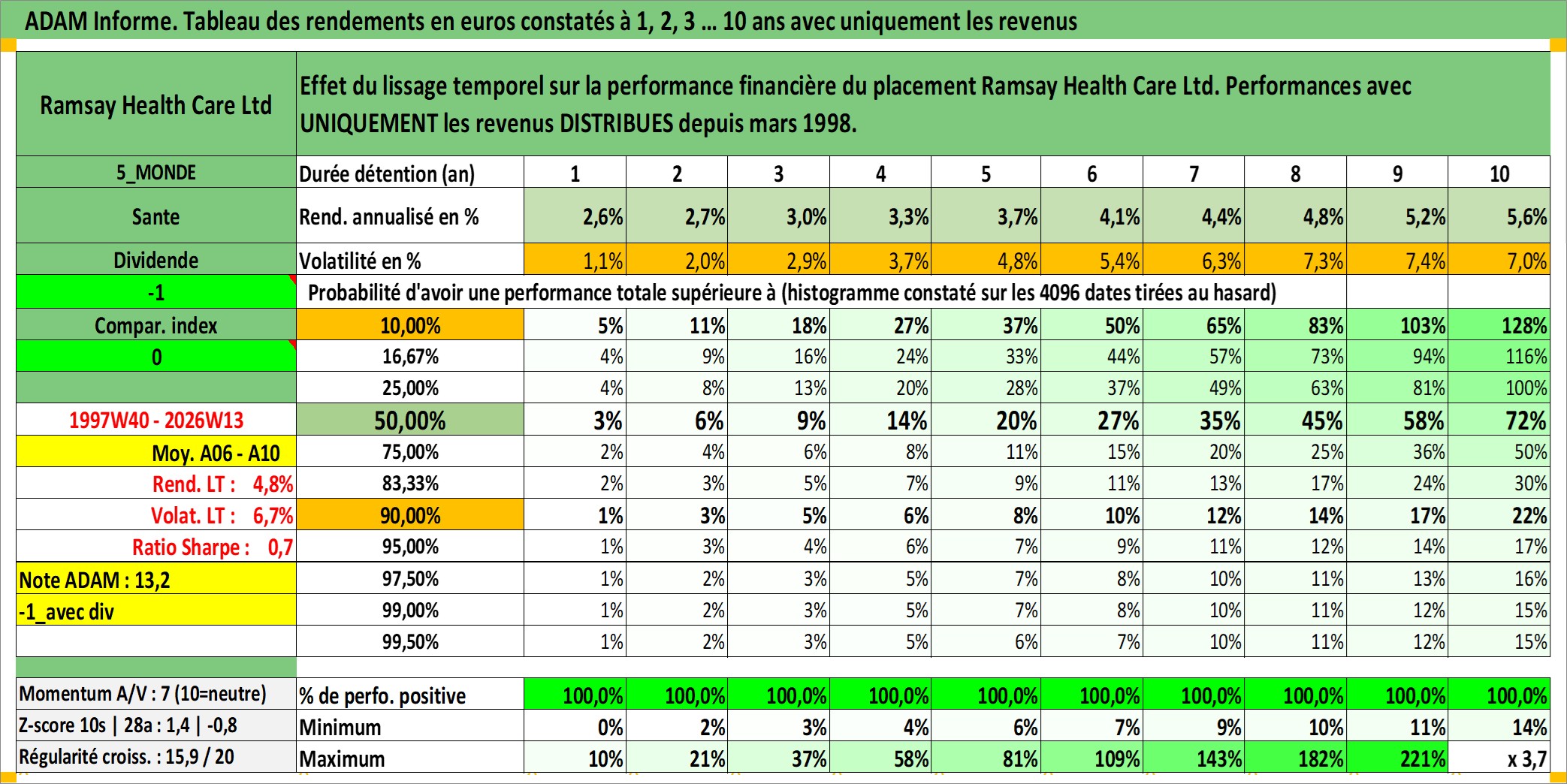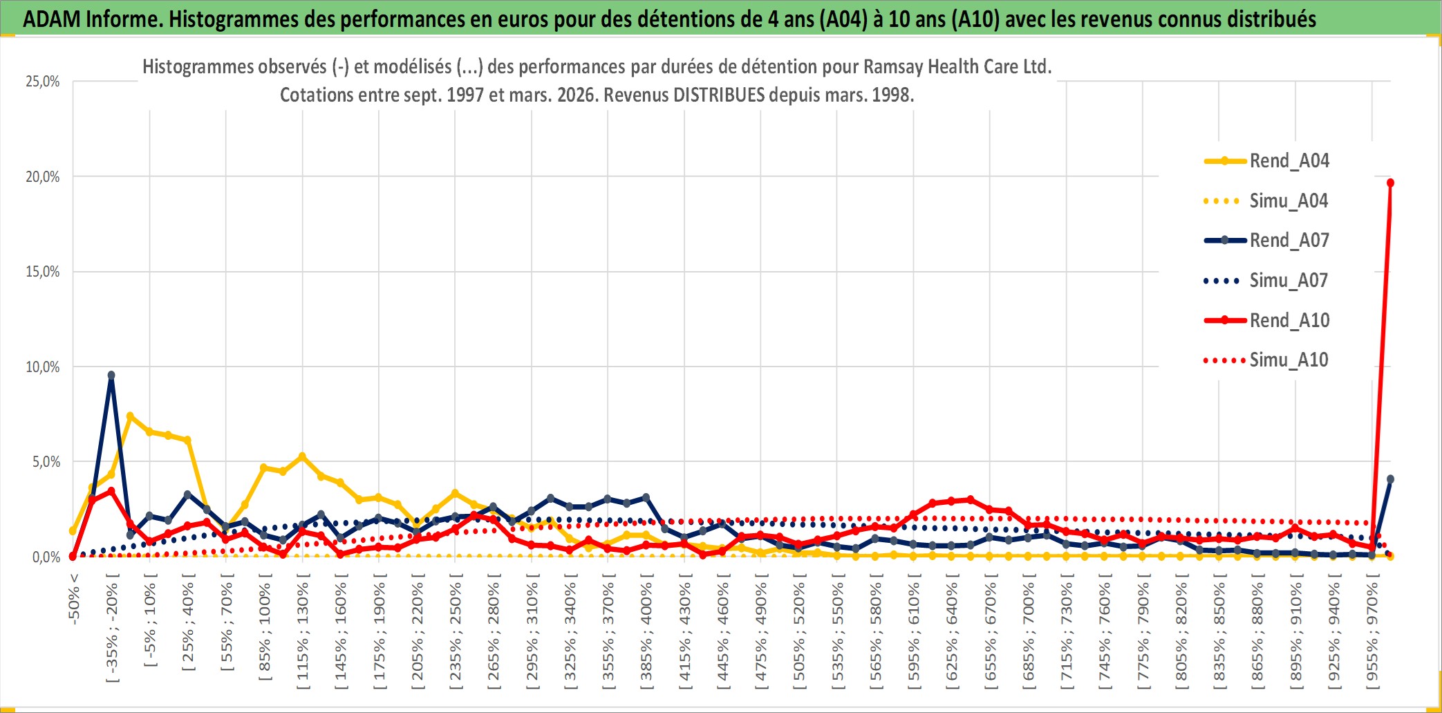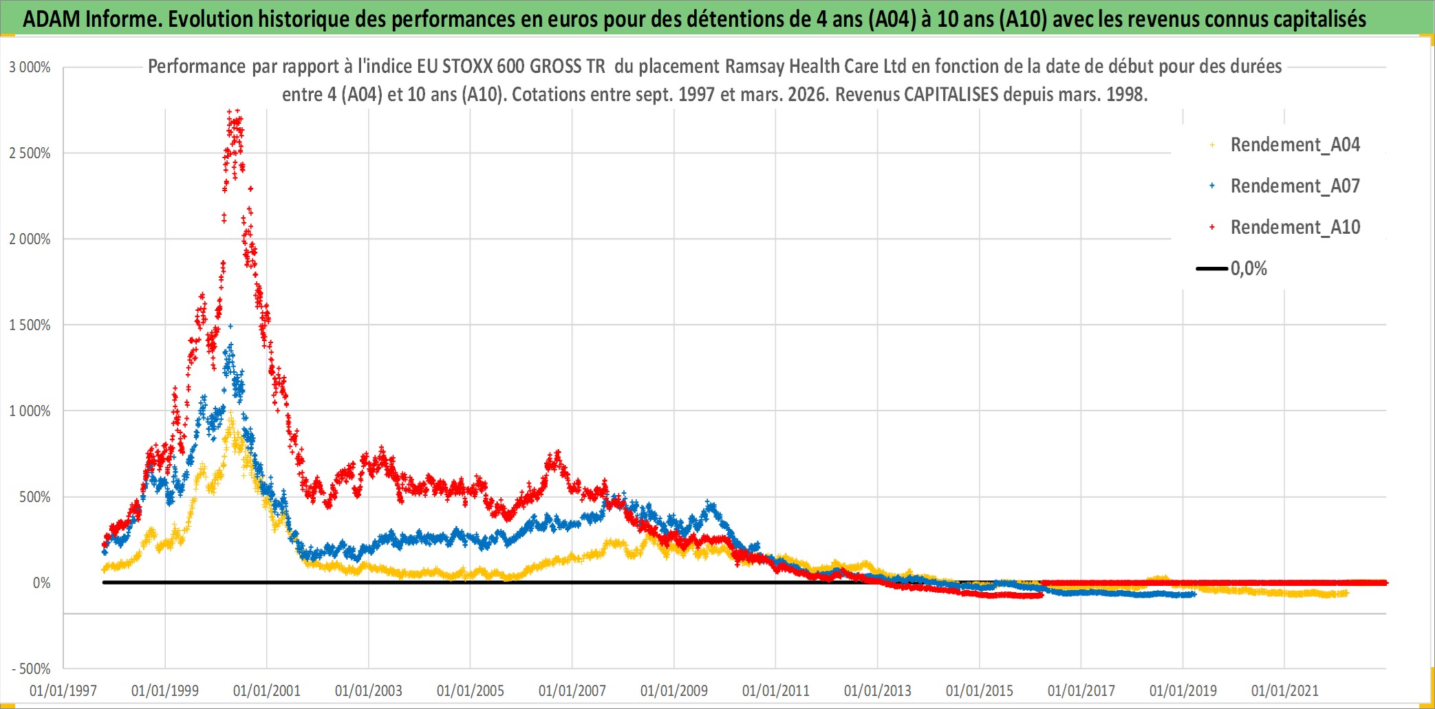 Site dédié aux investisseursPage dédiée sur site financeAnalyse des valorisations hebdomadaires de l'action Ramsay Health Care Ltd. Cet actif est cote en AUD. Les valorisations sont en contrevaleur EURO et couvrent les semaines 1997W40 a 2026W13. Les revenus de cet actif financier sont pris en compte depuis la semaine 1998W10. La note globale ESG de cet actif est estimee a 10.0 (apres rebasage entre 0 et 20).