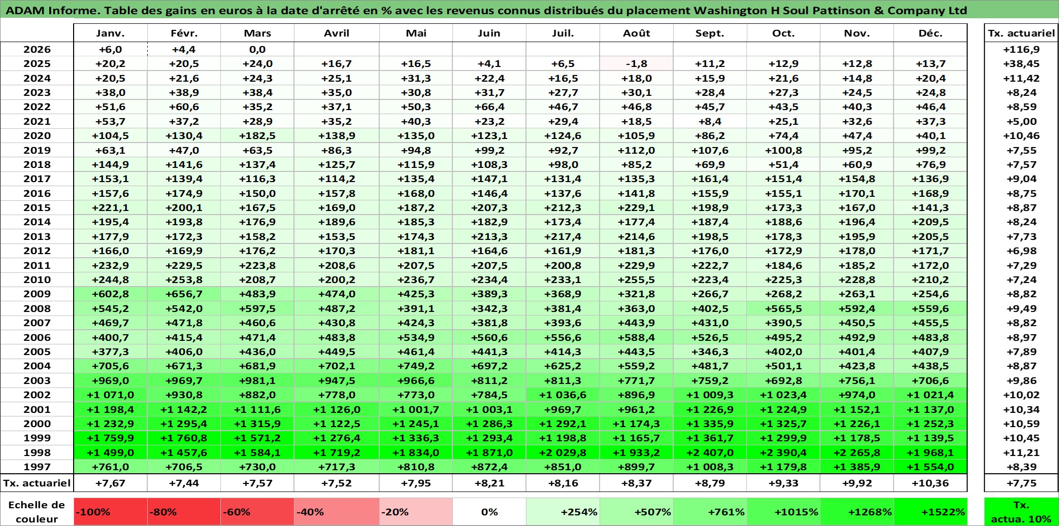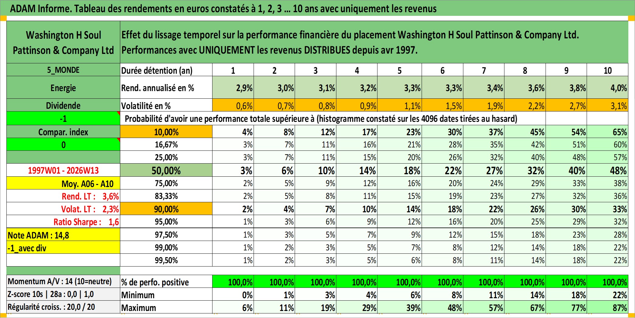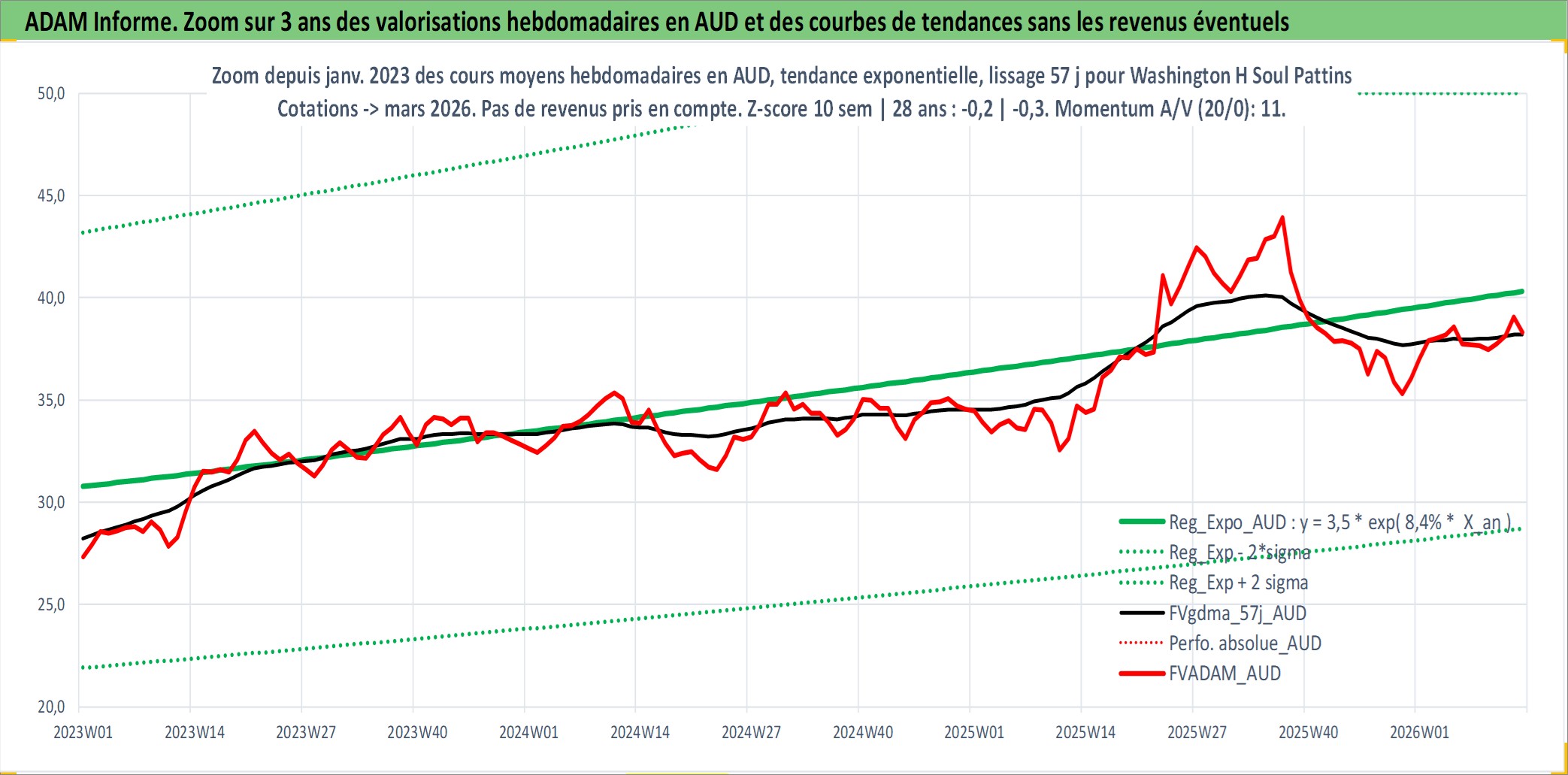 Site dédié aux investisseursPage dédiée sur site financeAnalyse des valorisations hebdomadaires de l'action Washington H Soul Pattinson & Company Ltd. Cet actif est cote en AUD. Les valorisations sont en contrevaleur EURO et couvrent les semaines 1997W01 a 2026W13. Les revenus de cet actif financier sont pris en compte depuis la semaine 1997W17. La note ESG de cet actif n'est pas connue.
