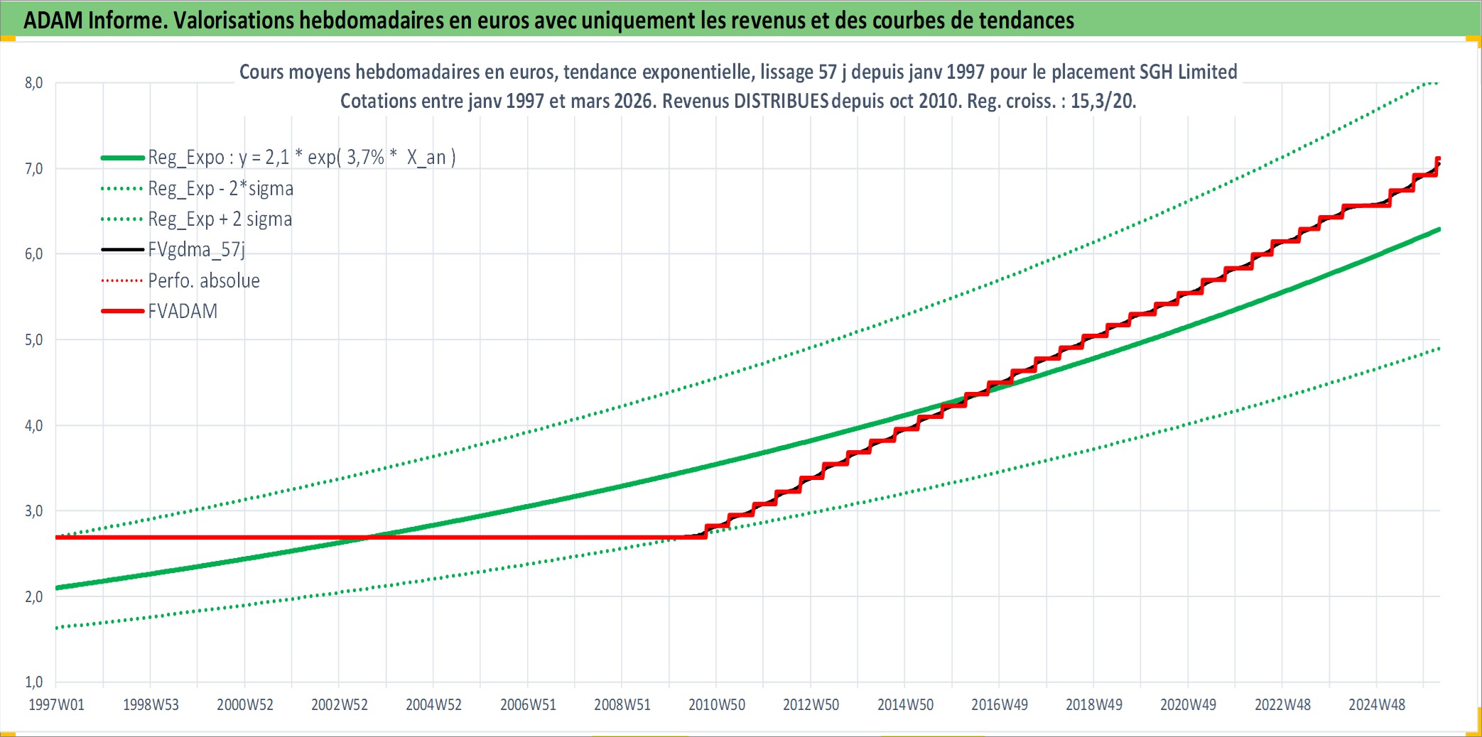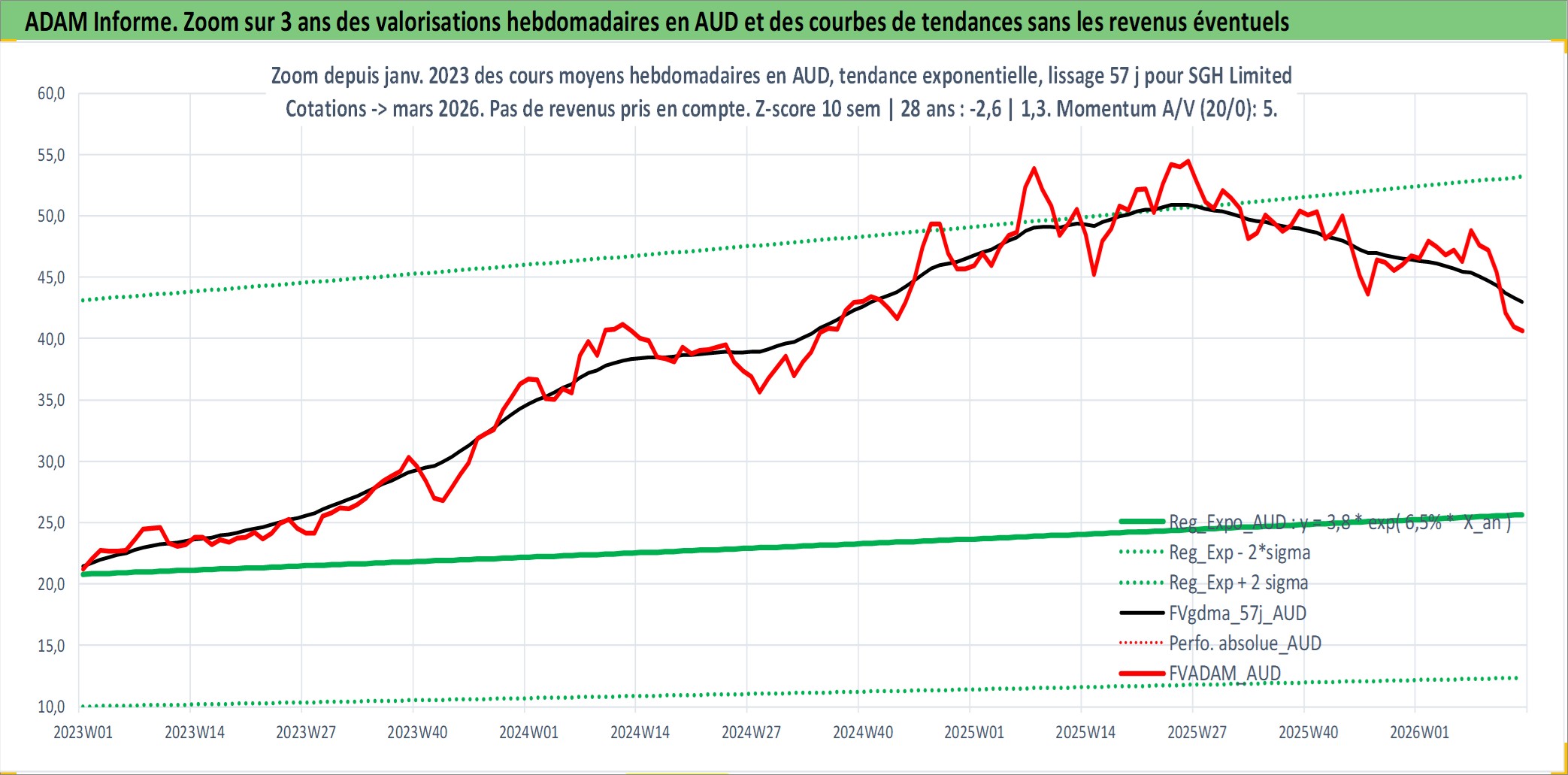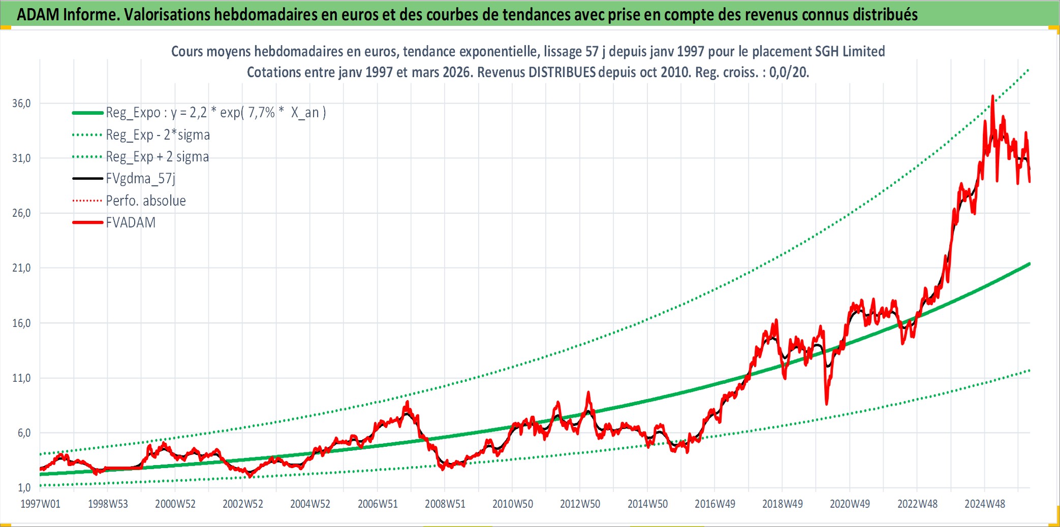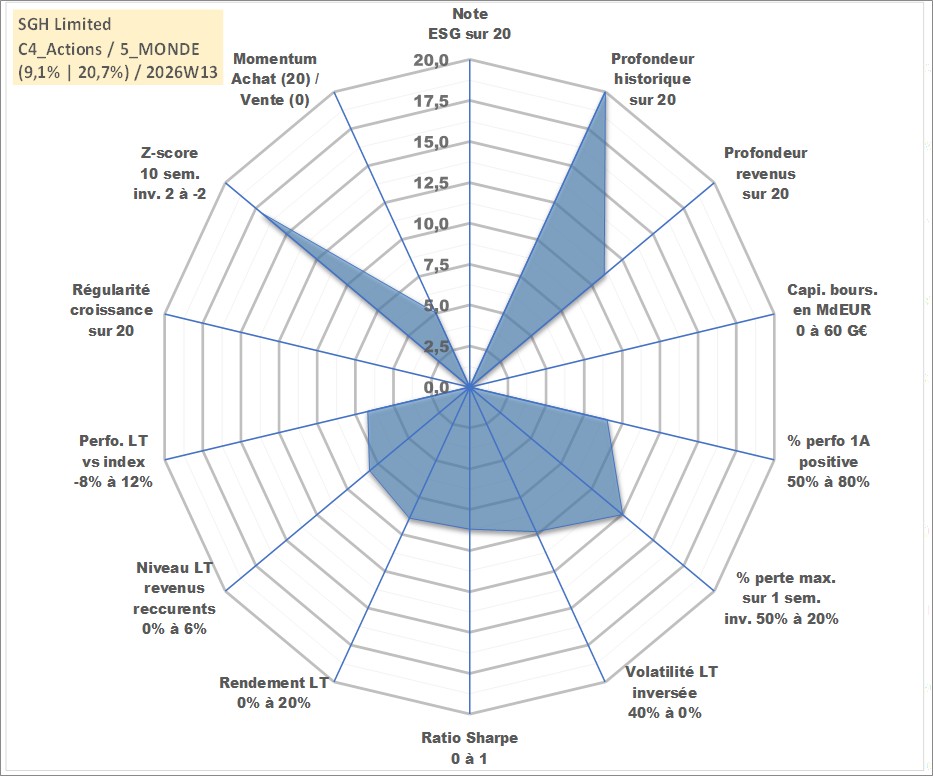 Site dédié aux investisseursPage dédiée sur site financeAnalyse des valorisations hebdomadaires de l'action SGH Limited. Cet actif est cote en AUD. Les valorisations sont en contrevaleur EURO et couvrent les semaines 1997W01 a 2026W13. Les revenus de cet actif financier sont pris en compte depuis la semaine 2010W39. La note ESG de cet actif n'est pas connue.