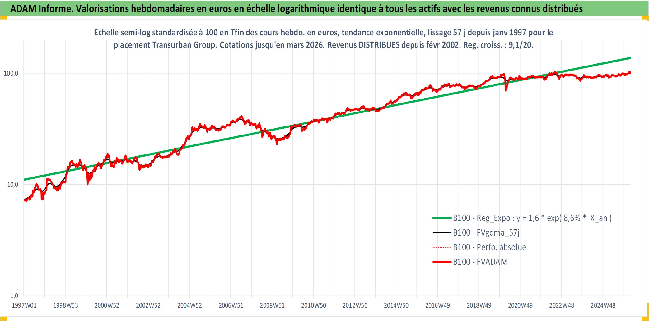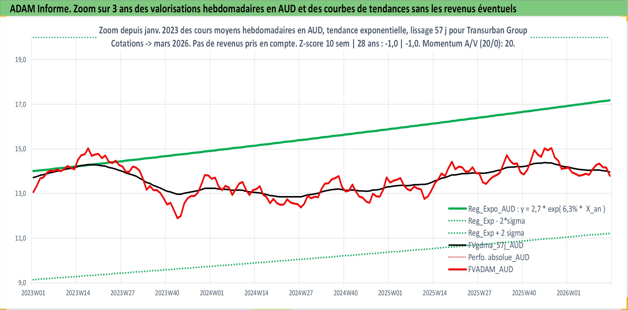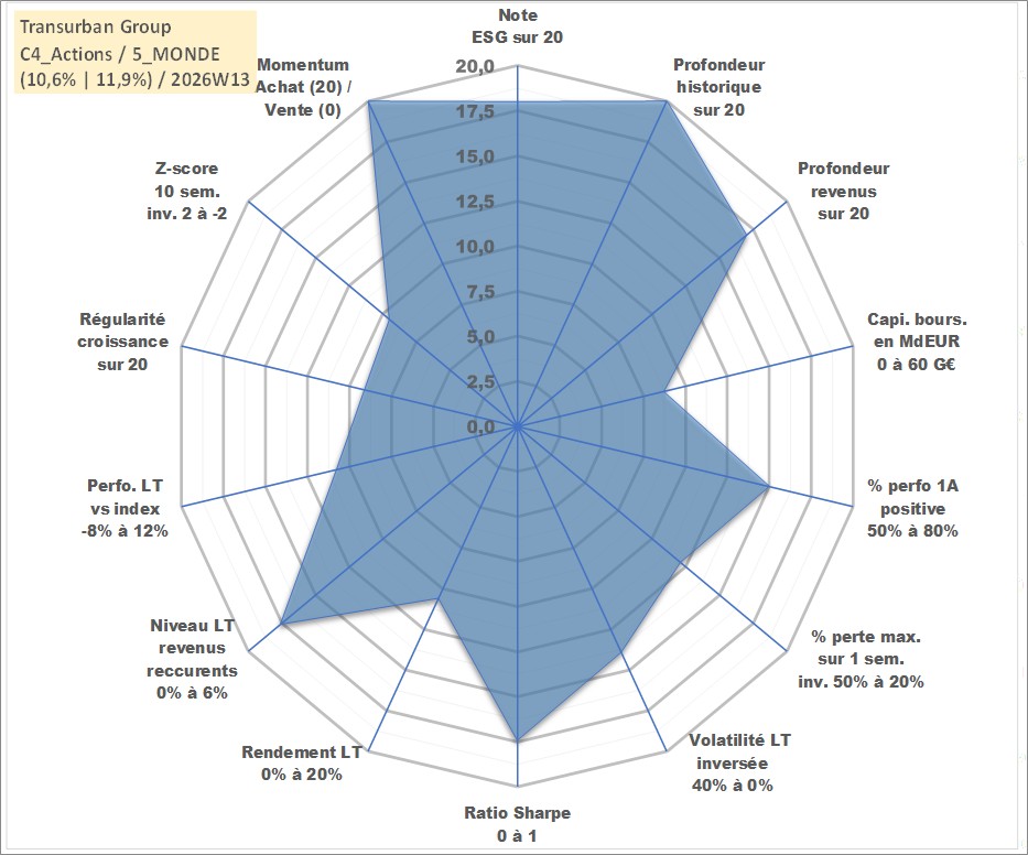 Site dédié aux investisseursPage dédiée sur site financeAnalyse des valorisations hebdomadaires de l'action Transurban Group. Cet actif est cote en AUD. Les valorisations sont en contrevaleur EURO et couvrent les semaines 1997W01 a 2026W13. Les revenus de cet actif financier sont pris en compte depuis la semaine 2002W06. La note globale ESG de cet actif est estimee a 18.0 (apres rebasage entre 0 et 20).