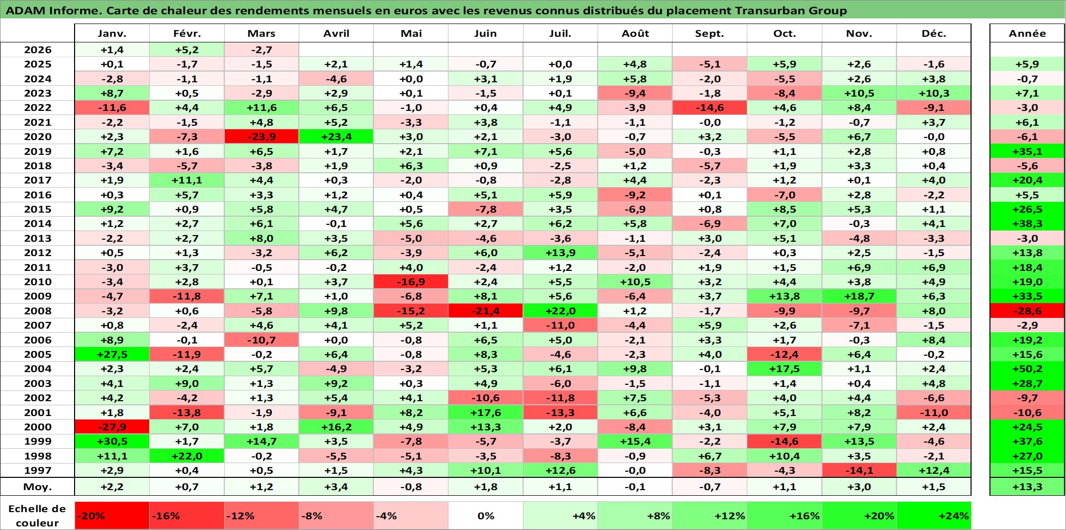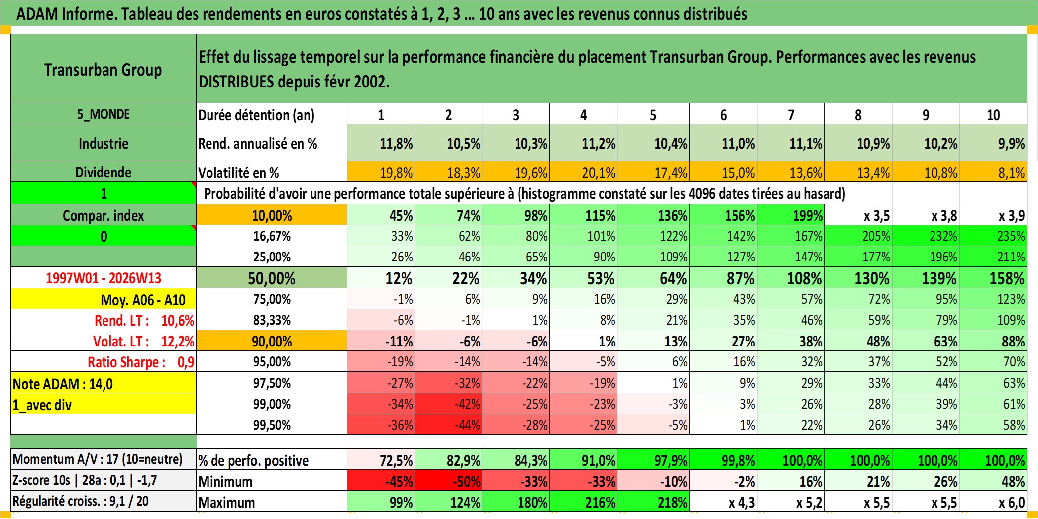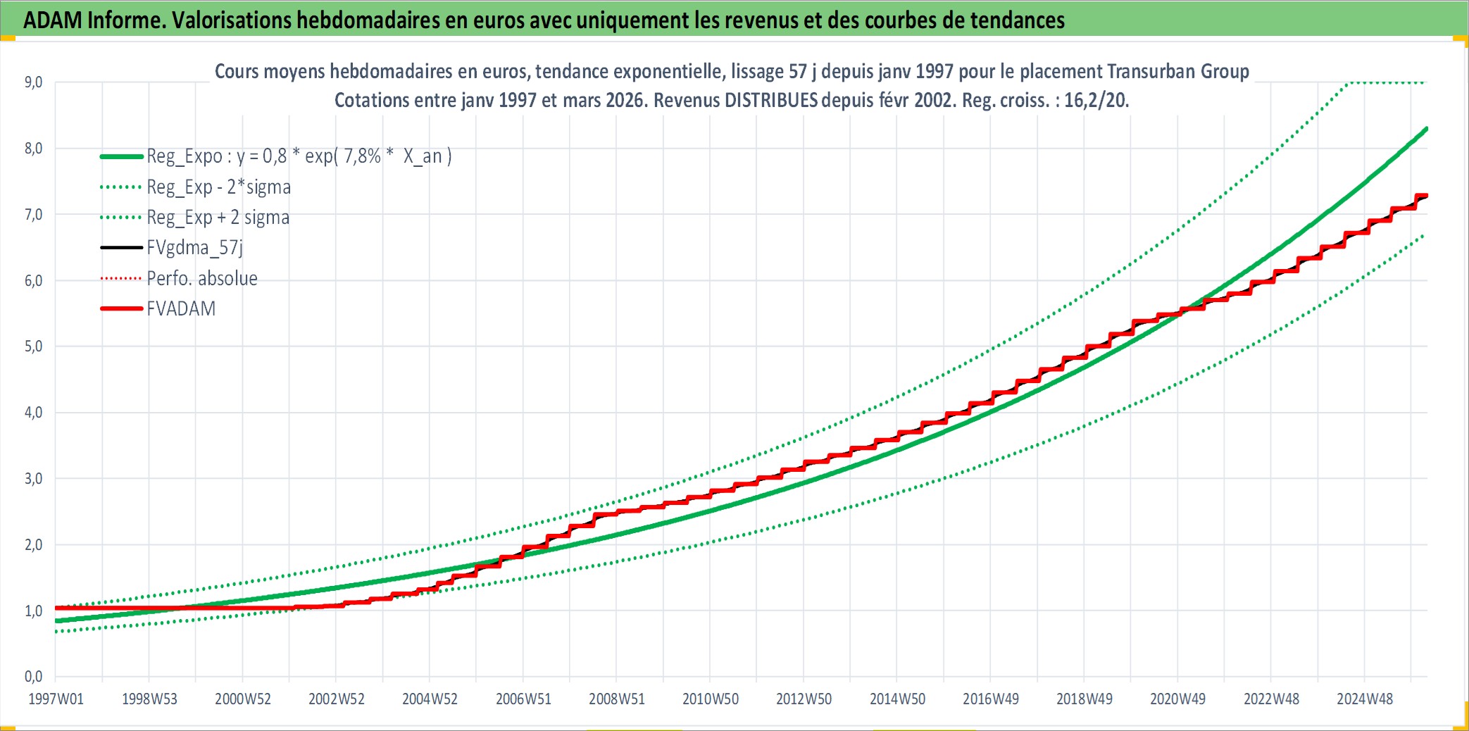 Site dédié aux investisseursPage dédiée sur site financeAnalyse des valorisations hebdomadaires de l'action Transurban Group. Cet actif est cote en AUD. Les valorisations sont en contrevaleur EURO et couvrent les semaines 1997W01 a 2026W13. Les revenus de cet actif financier sont pris en compte depuis la semaine 2002W06. La note globale ESG de cet actif est estimee a 18.0 (apres rebasage entre 0 et 20).