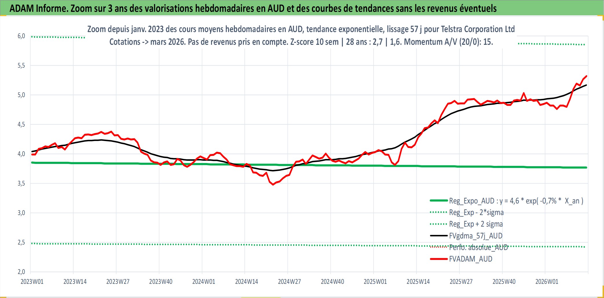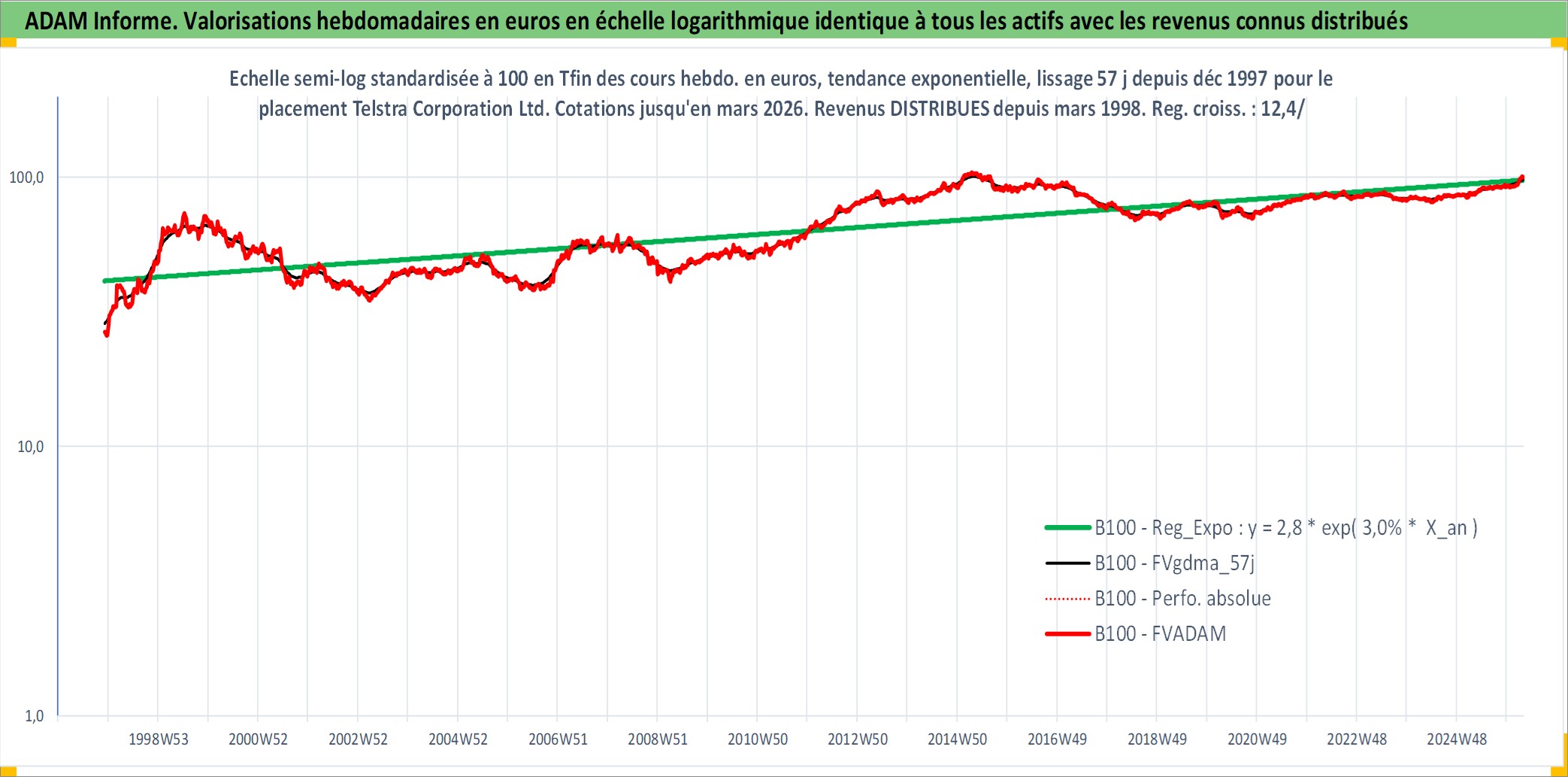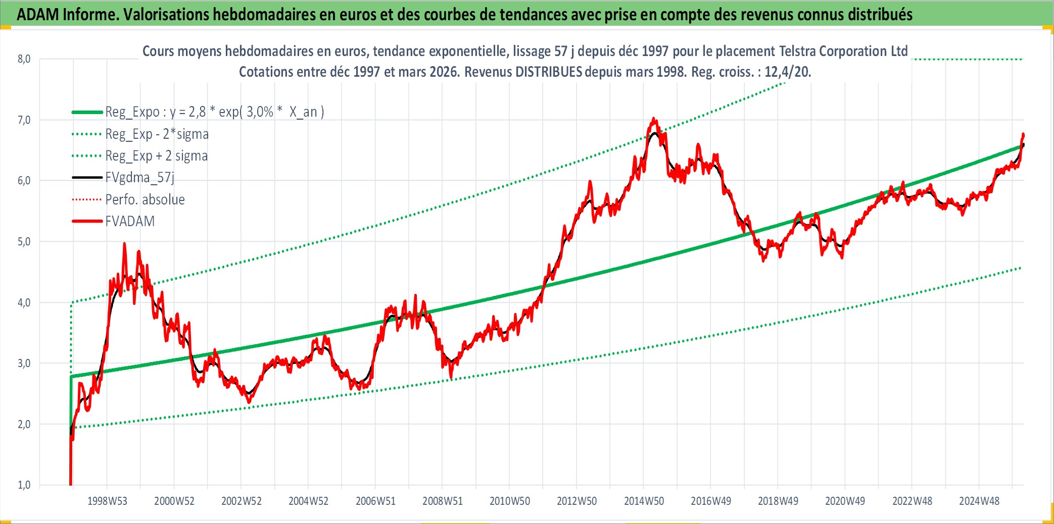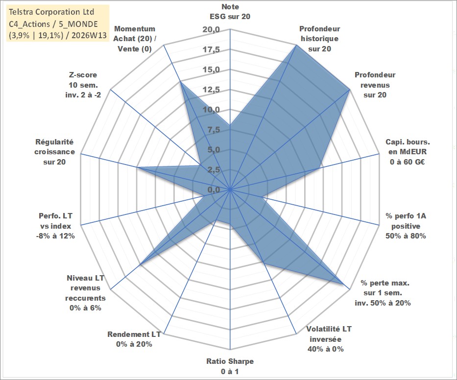 Site dédié aux investisseursPage dédiée sur site financeAnalyse des valorisations hebdomadaires de l'action Telstra Corporation Ltd. Cet actif est cote en AUD. Les valorisations sont en contrevaleur EURO et couvrent les semaines 1997W49 a 2026W13. Les revenus de cet actif financier sont pris en compte depuis la semaine 1998W09. La note globale ESG de cet actif est estimee a 8.0 (apres rebasage entre 0 et 20).