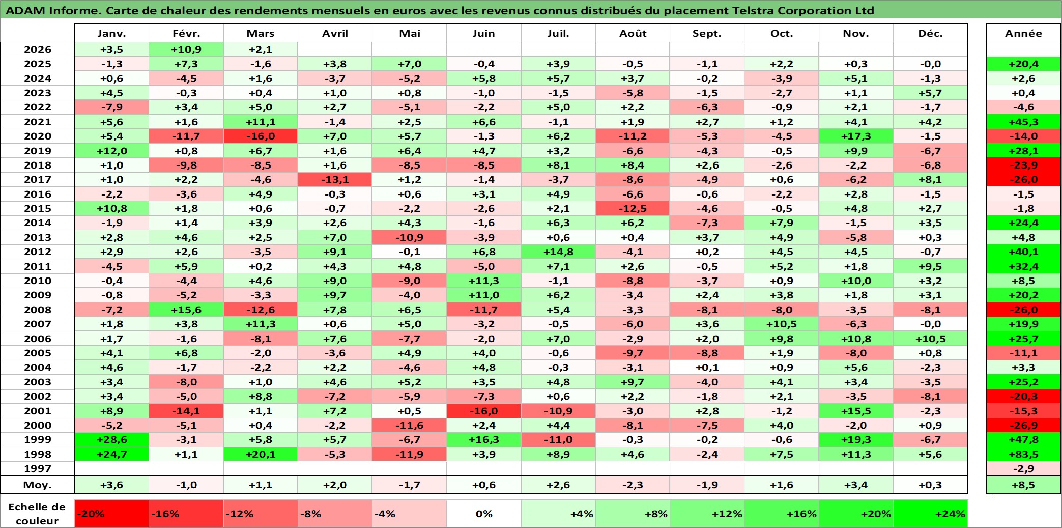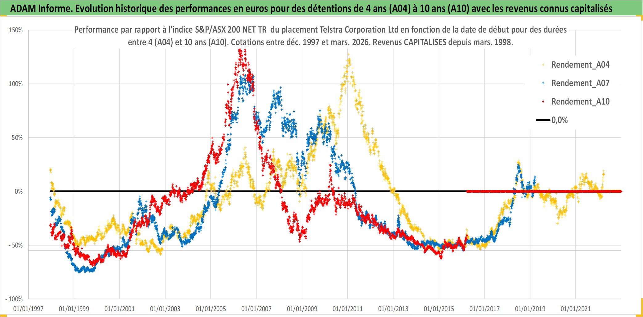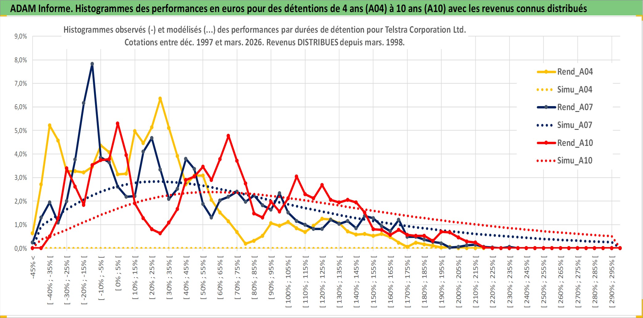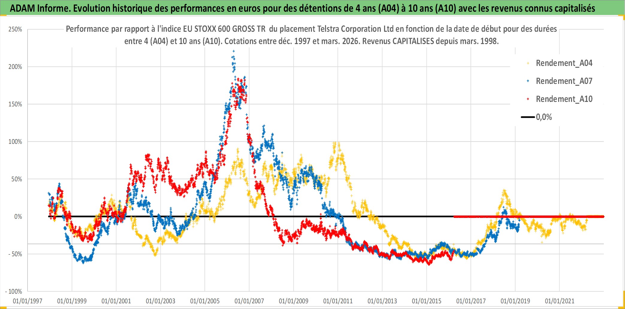 Site dédié aux investisseursPage dédiée sur site financeAnalyse des valorisations hebdomadaires de l'action Telstra Corporation Ltd. Cet actif est cote en AUD. Les valorisations sont en contrevaleur EURO et couvrent les semaines 1997W49 a 2026W13. Les revenus de cet actif financier sont pris en compte depuis la semaine 1998W09. La note globale ESG de cet actif est estimee a 8.0 (apres rebasage entre 0 et 20).