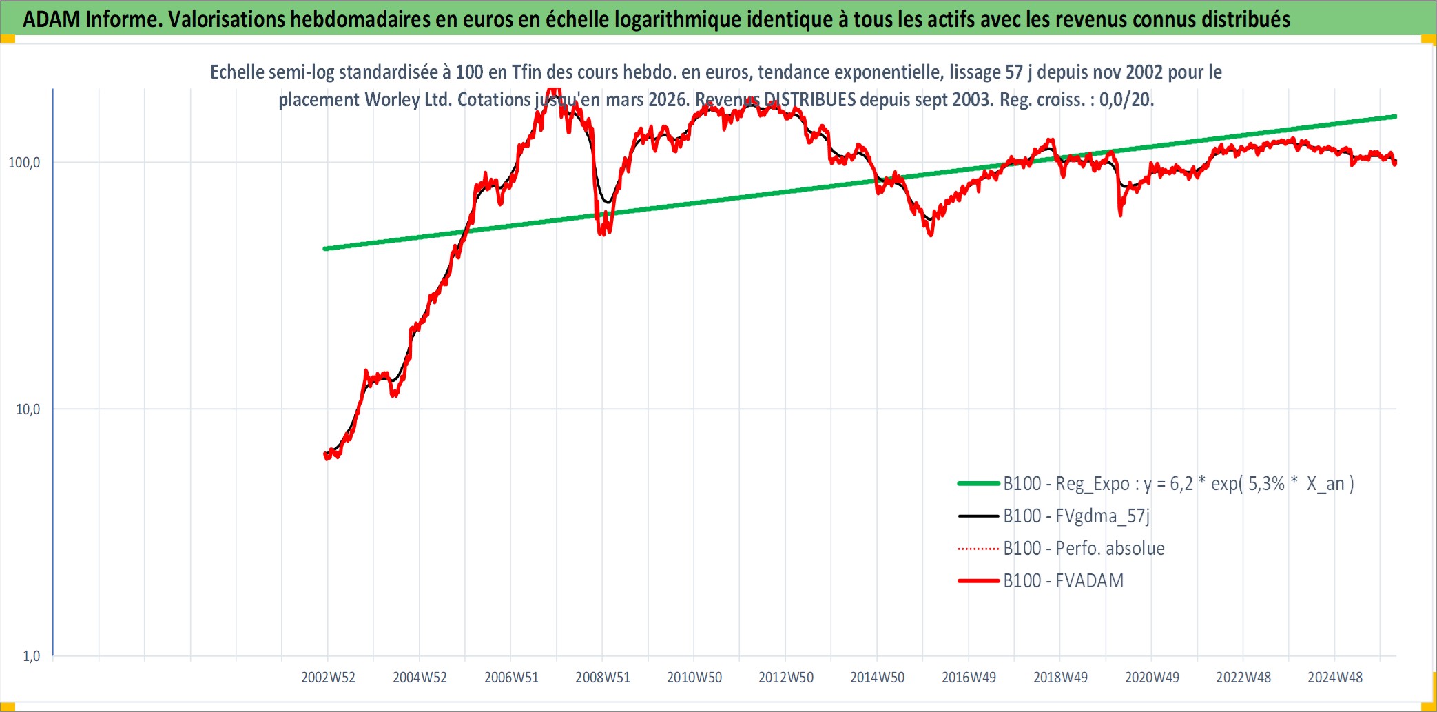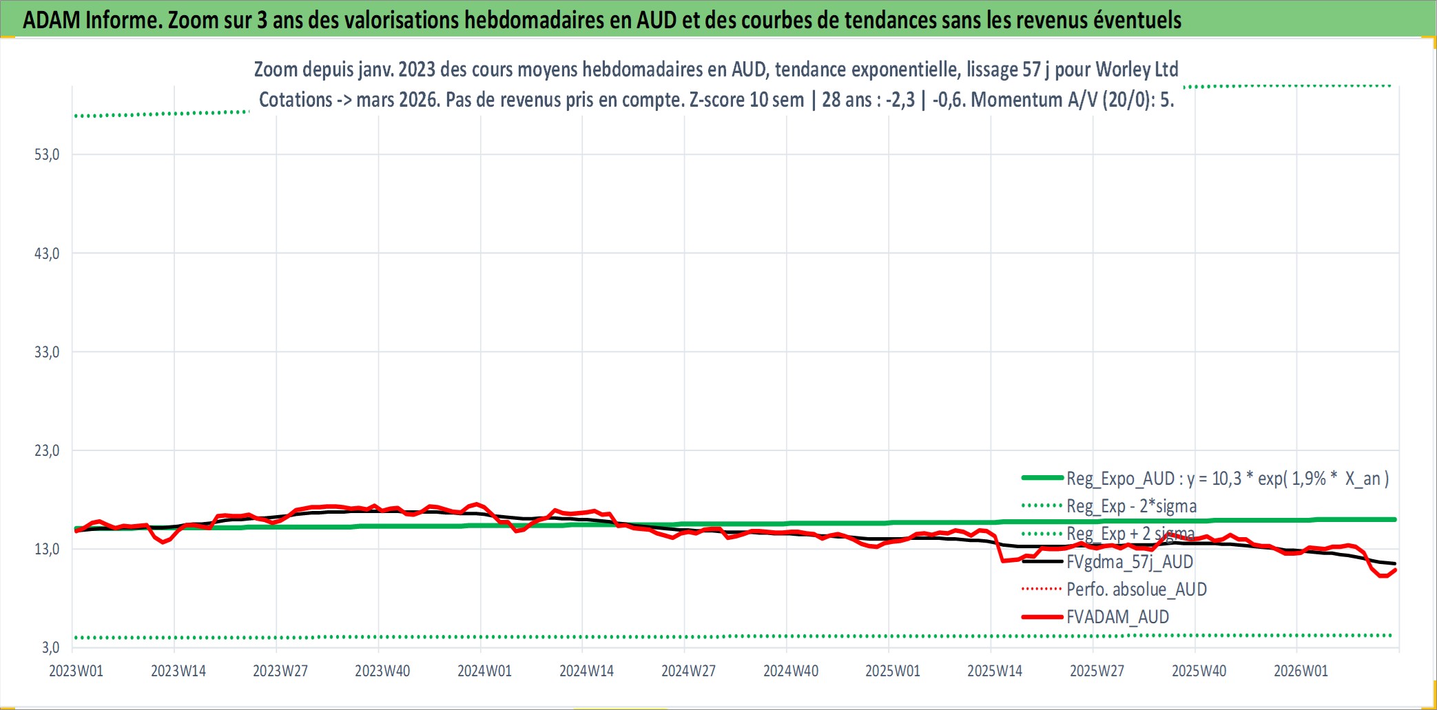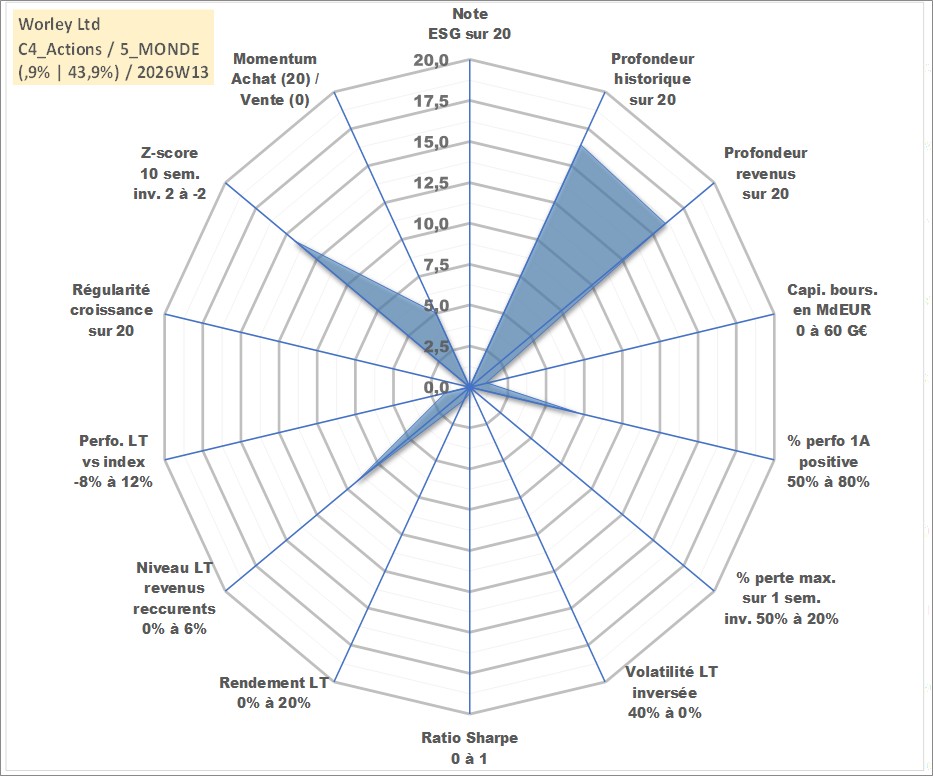 Site dédié aux investisseursPage dédiée sur site financeAnalyse des valorisations hebdomadaires de l'action Worley Ltd. Cet actif est cote en AUD. Les valorisations sont en contrevaleur EURO et couvrent les semaines 2002W48 a 2026W13. Les revenus de cet actif financier sont pris en compte depuis la semaine 2003W40. La note ESG de cet actif n'est pas connue.