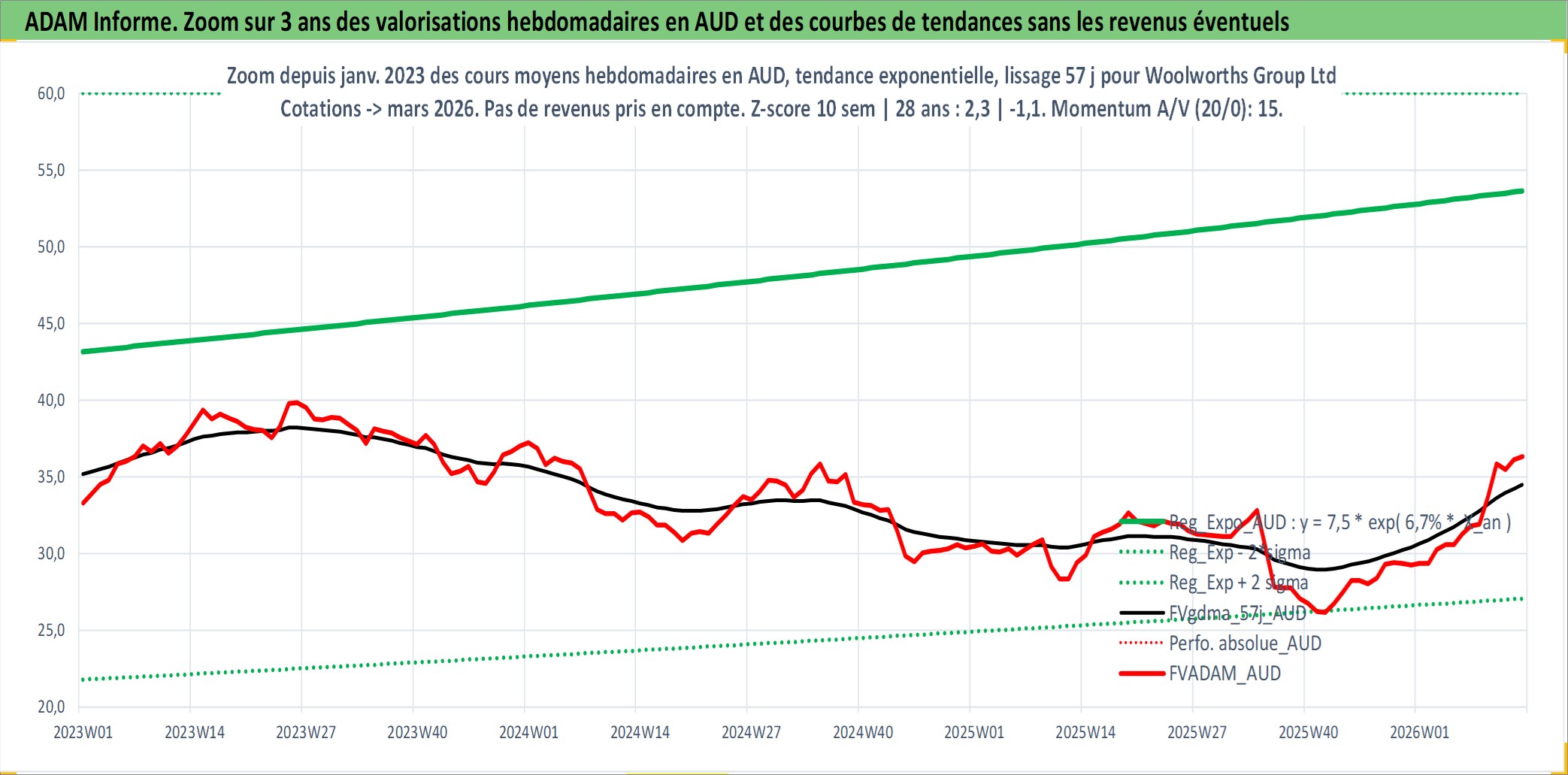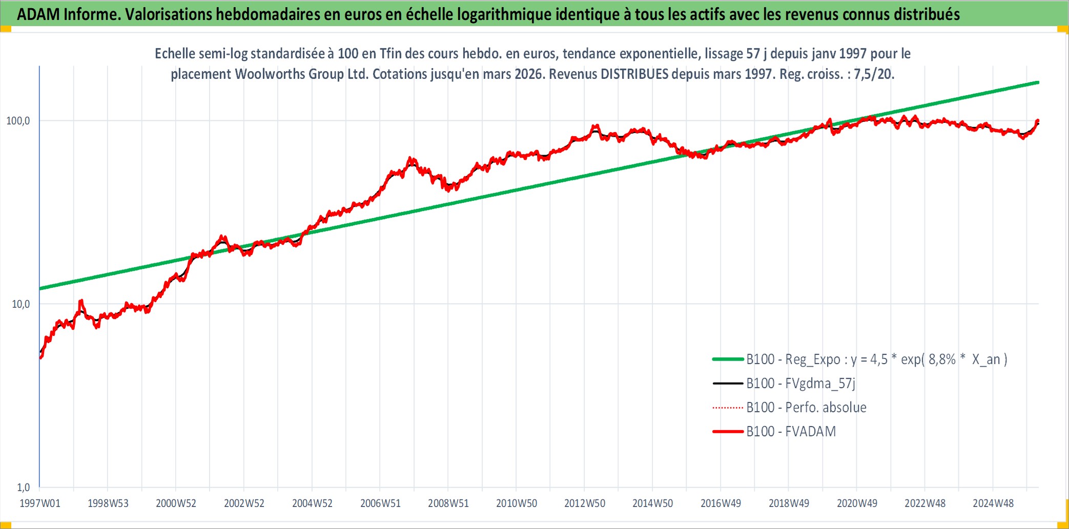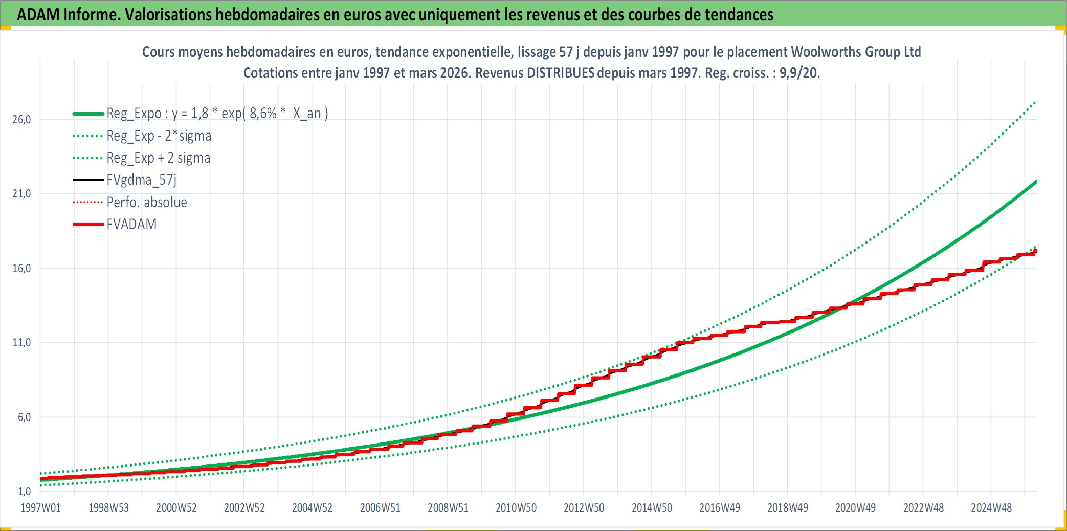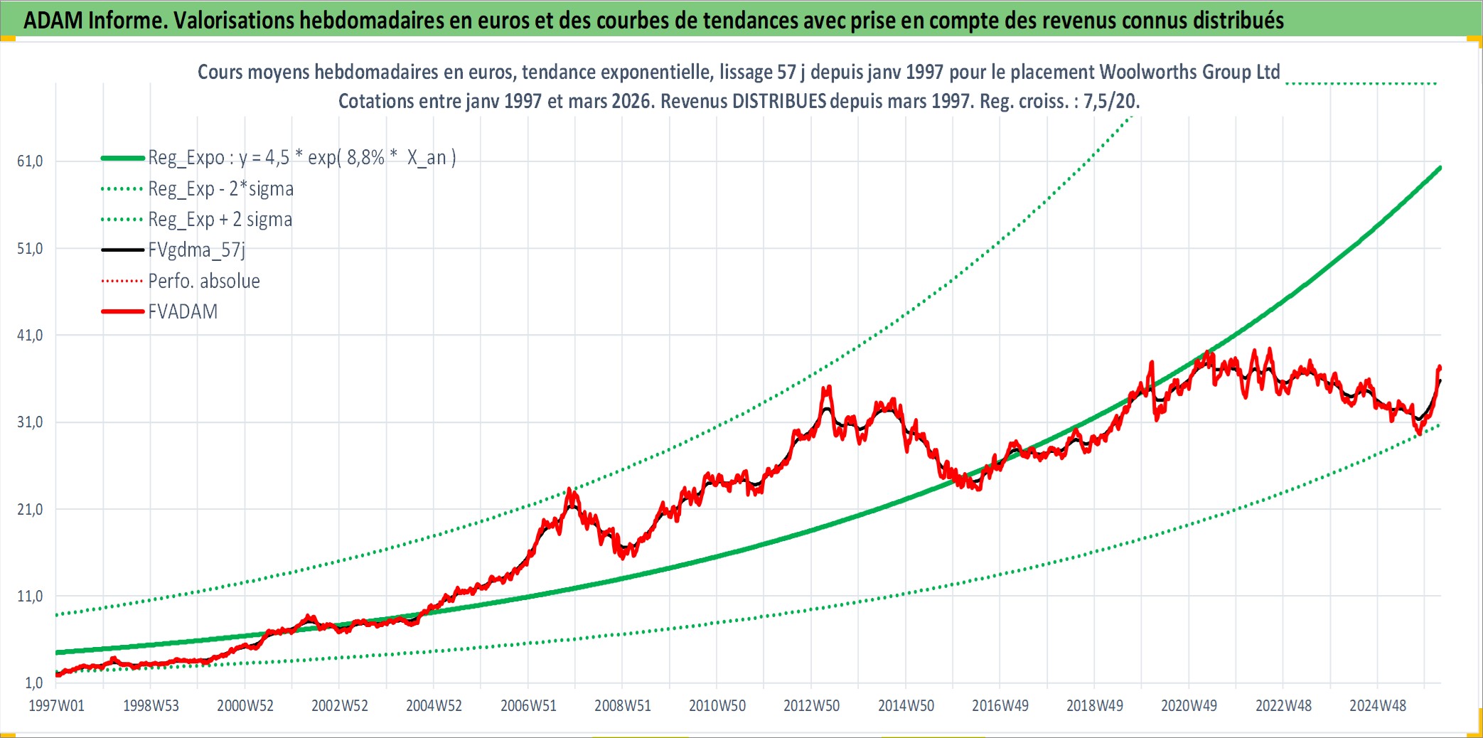 Site dédié aux investisseursPage dédiée sur site financeAnalyse des valorisations hebdomadaires de l'action Woolworths Group Ltd. Cet actif est cote en AUD. Les valorisations sont en contrevaleur EURO et couvrent les semaines 1997W01 a 2026W13. Les revenus de cet actif financier sont pris en compte depuis la semaine 1997W13. La note globale ESG de cet actif est estimee a 11.0 (apres rebasage entre 0 et 20).