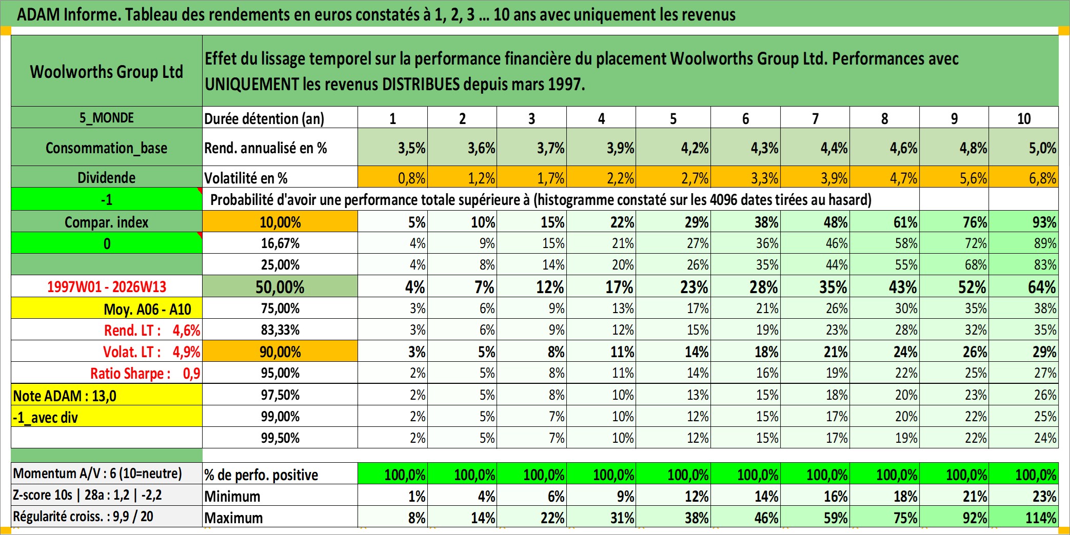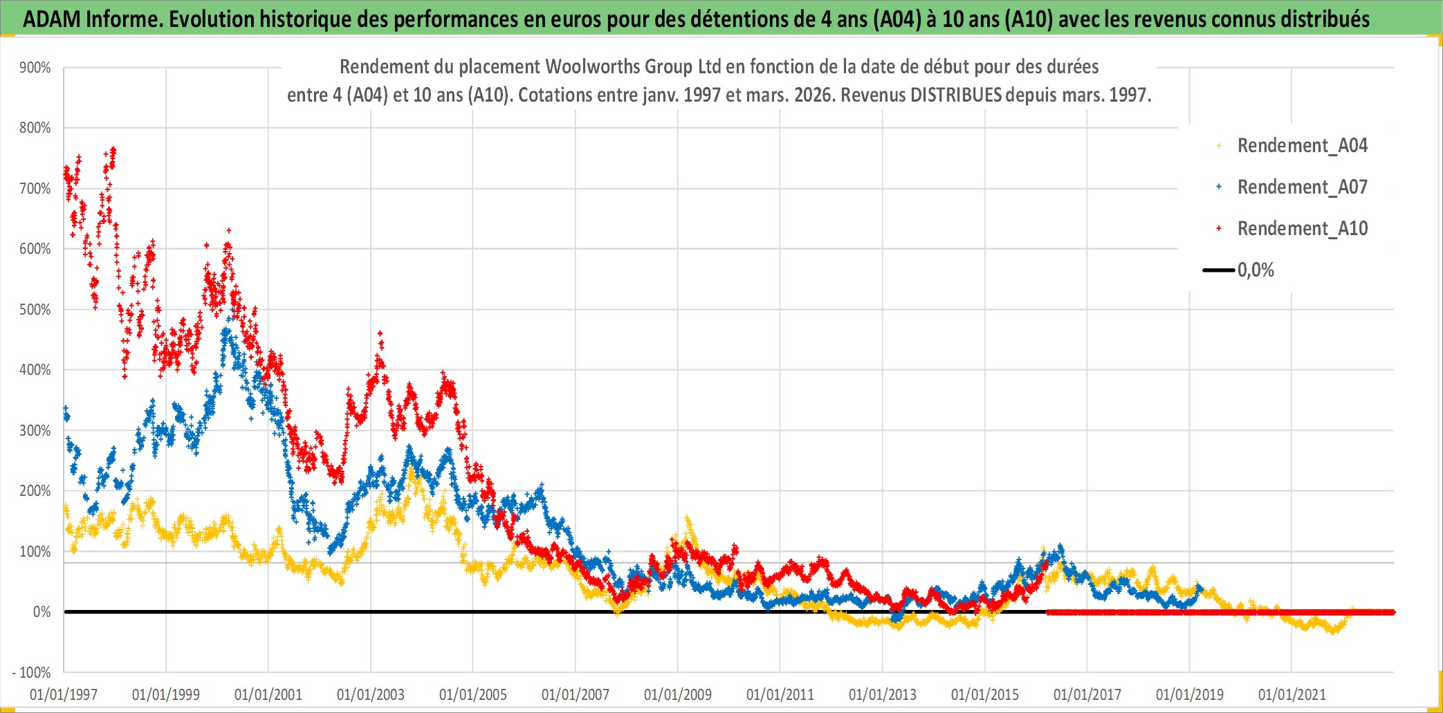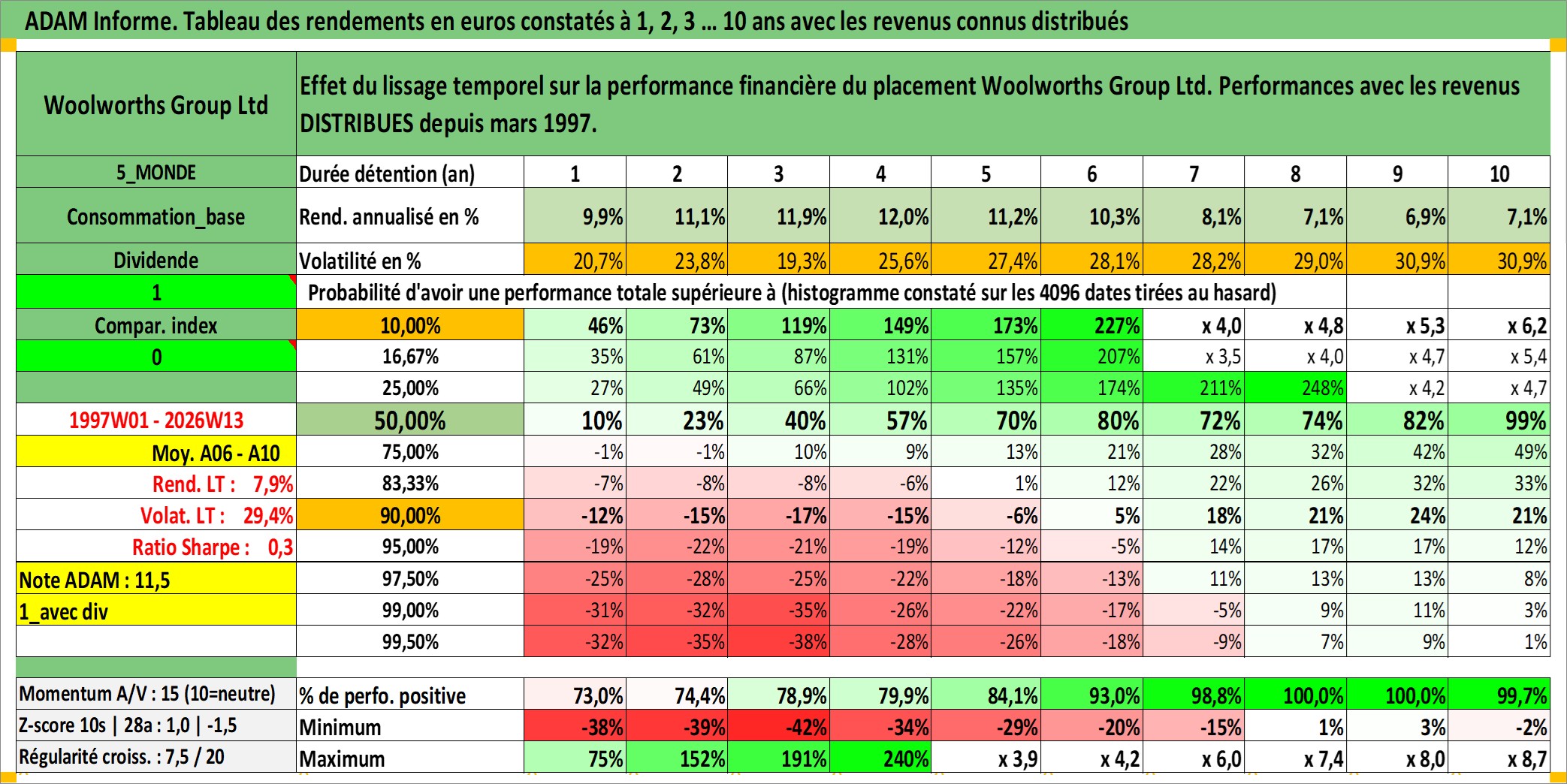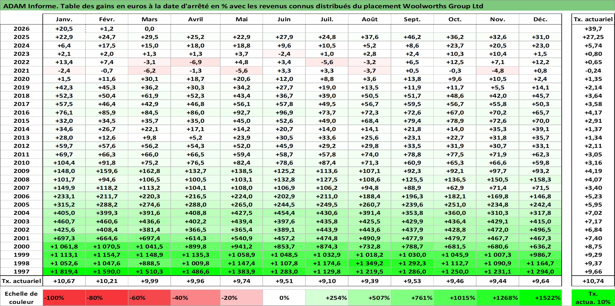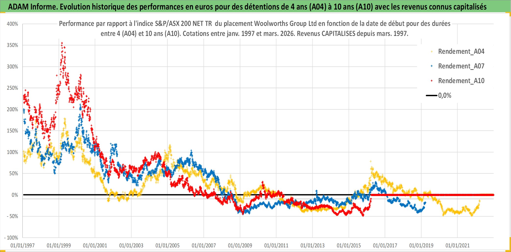 Site dédié aux investisseursPage dédiée sur site financeAnalyse des valorisations hebdomadaires de l'action Woolworths Group Ltd. Cet actif est cote en AUD. Les valorisations sont en contrevaleur EURO et couvrent les semaines 1997W01 a 2026W13. Les revenus de cet actif financier sont pris en compte depuis la semaine 1997W13. La note globale ESG de cet actif est estimee a 11.0 (apres rebasage entre 0 et 20).