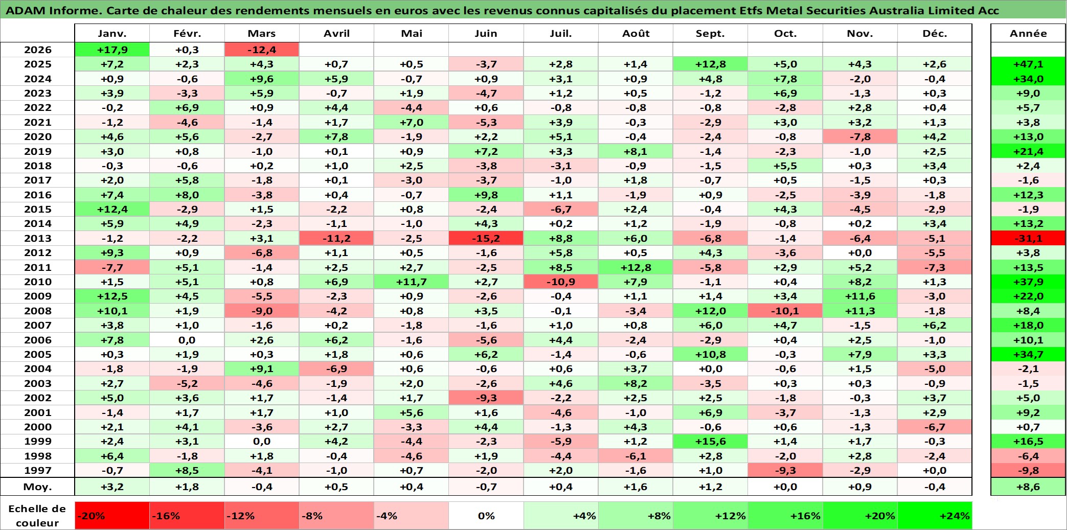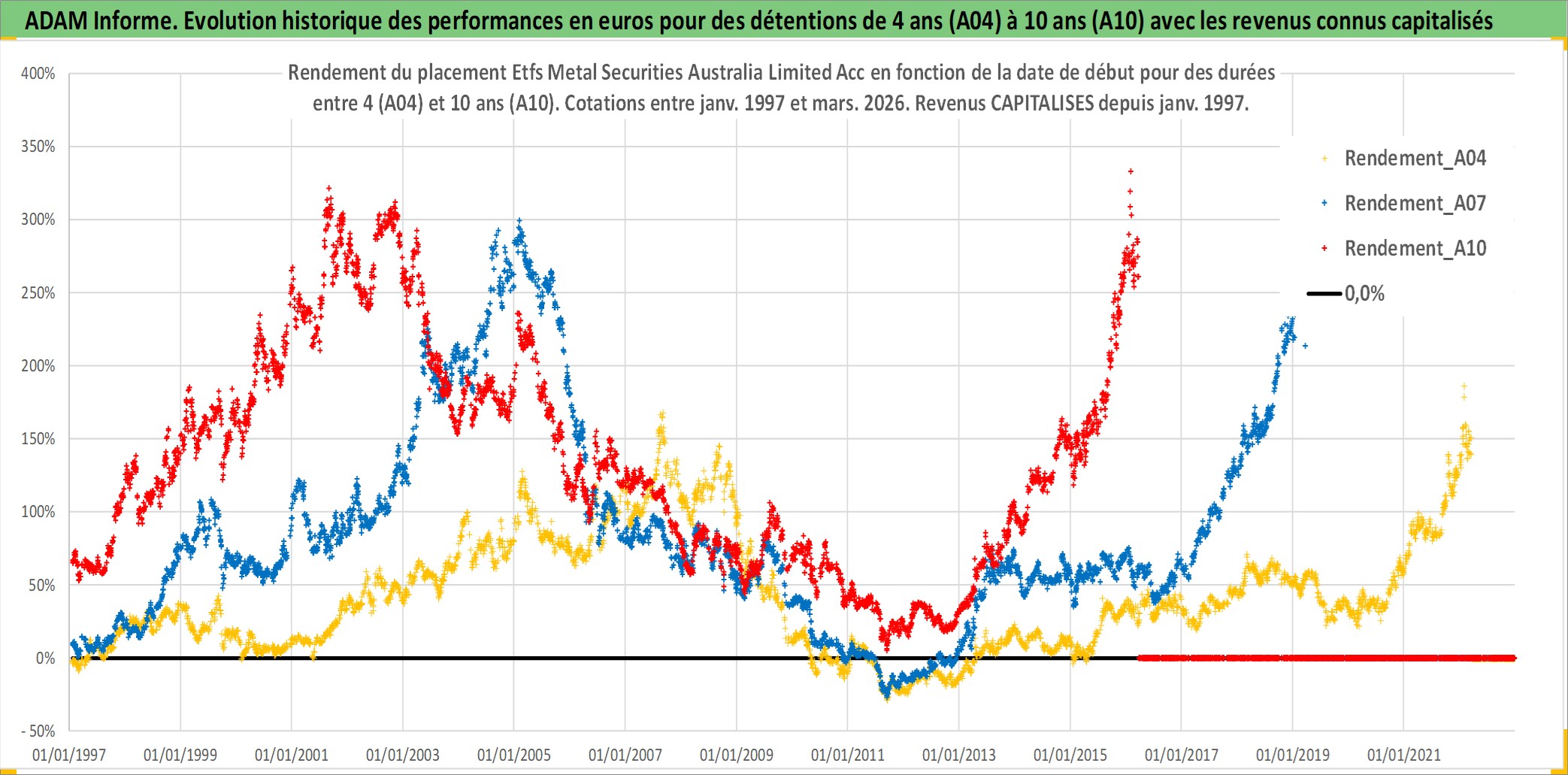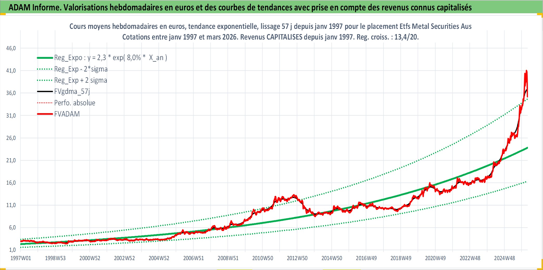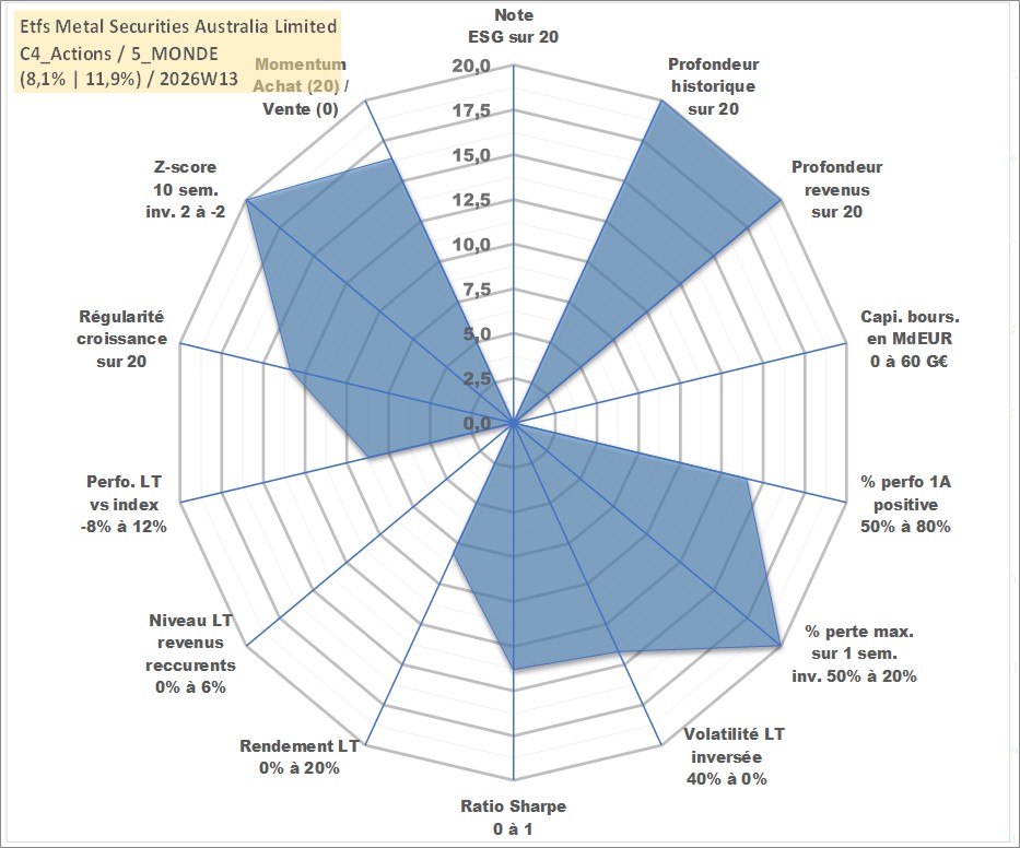 Site dédié aux investisseursPage dédiée sur site financeAnalyse des valorisations hebdomadaires du fonds Etfs Metal Securities Australia Limited Acc. Cet actif est cote en AUD. Les valorisations sont en contrevaleur EURO et couvrent les semaines 1997W01 a 2026W13. Les revenus de cet actif financier sont pris en compte depuis la semaine 1997W01. La note ESG de cet actif n'est pas connue.