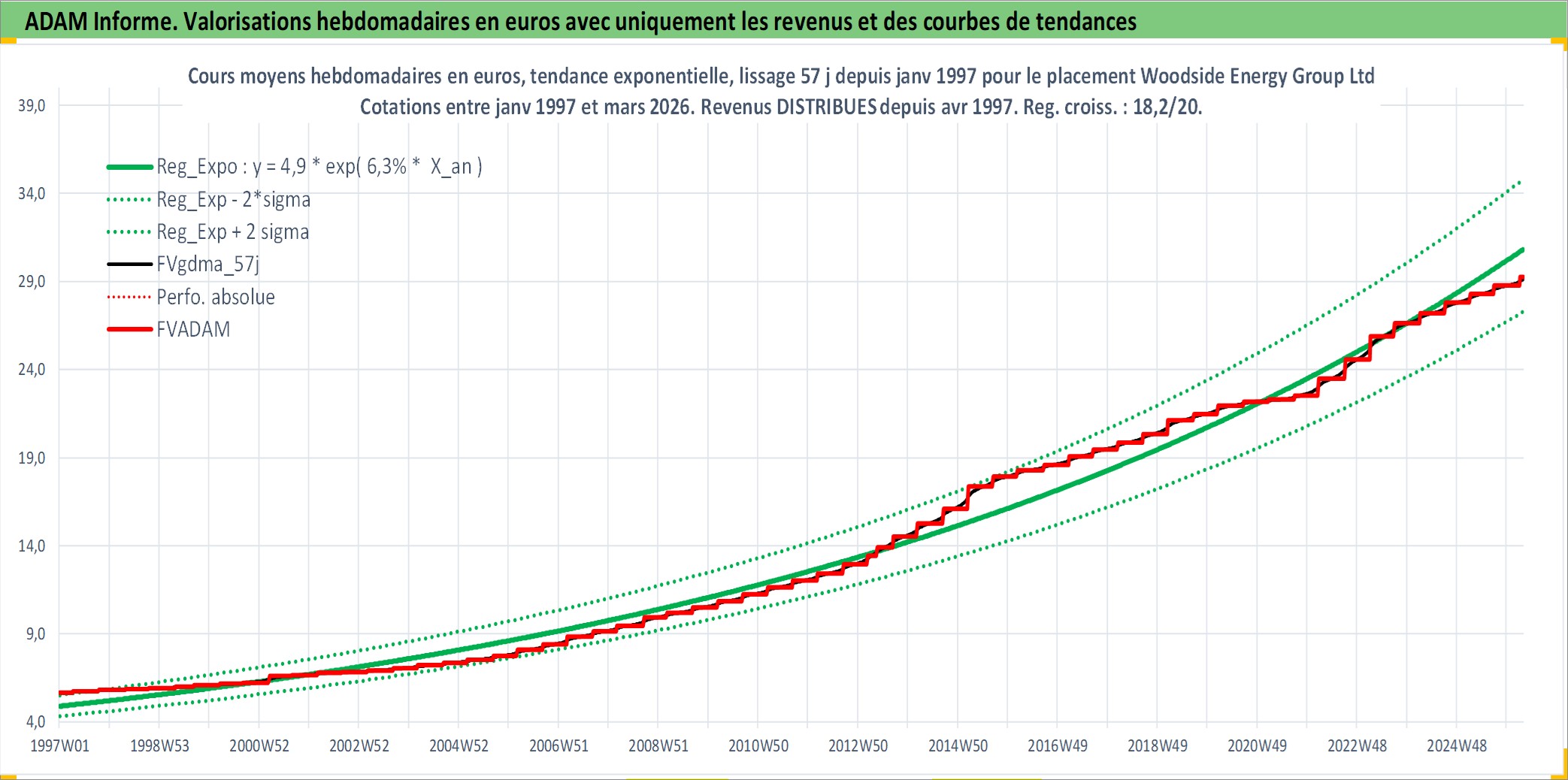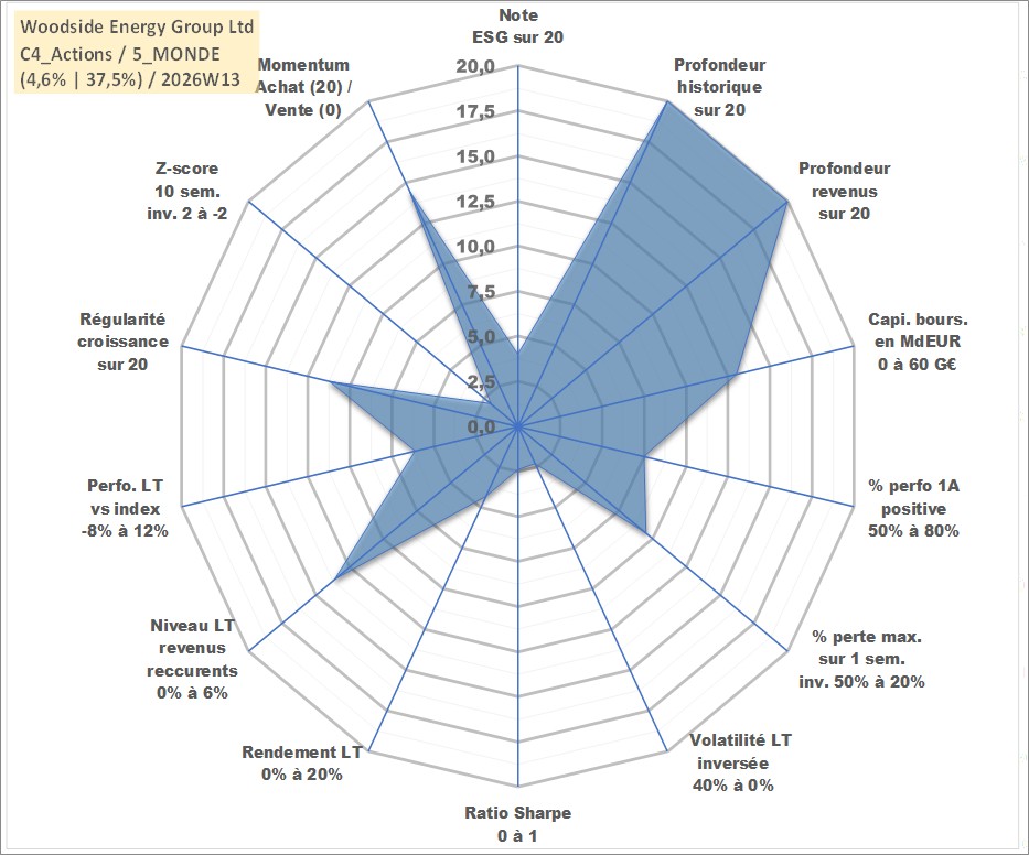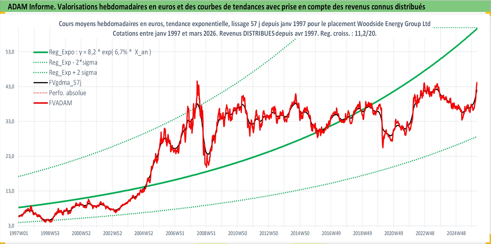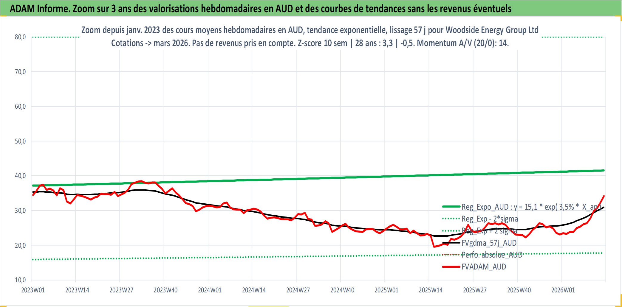 Site dédié aux investisseursPage dédiée sur site financeAnalyse des valorisations hebdomadaires de l'action Woodside Energy Group Ltd . Cet actif est cote en AUD. Les valorisations sont en contrevaleur EURO et couvrent les semaines 1997W01 a 2026W13. Les revenus de cet actif financier sont pris en compte depuis la semaine 1997W15. La note globale ESG de cet actif est estimee a 4.0 (apres rebasage entre 0 et 20).