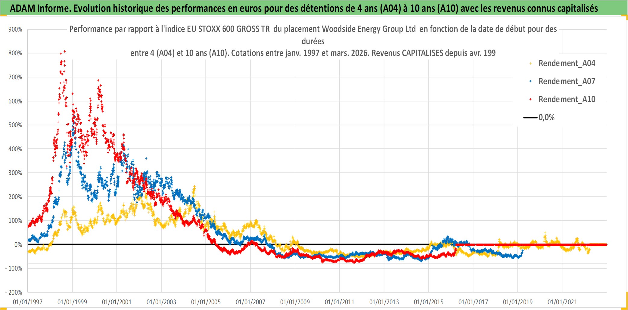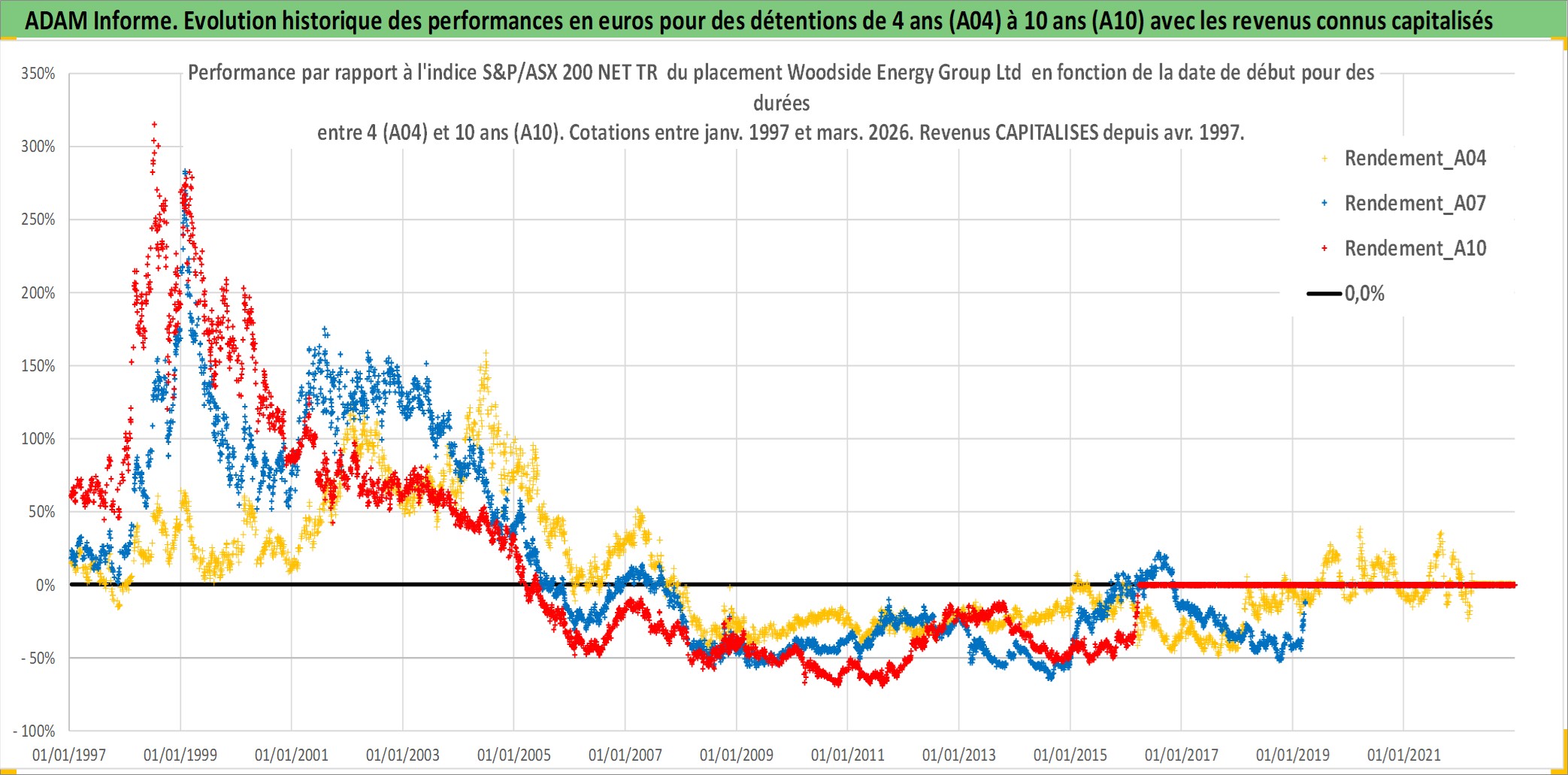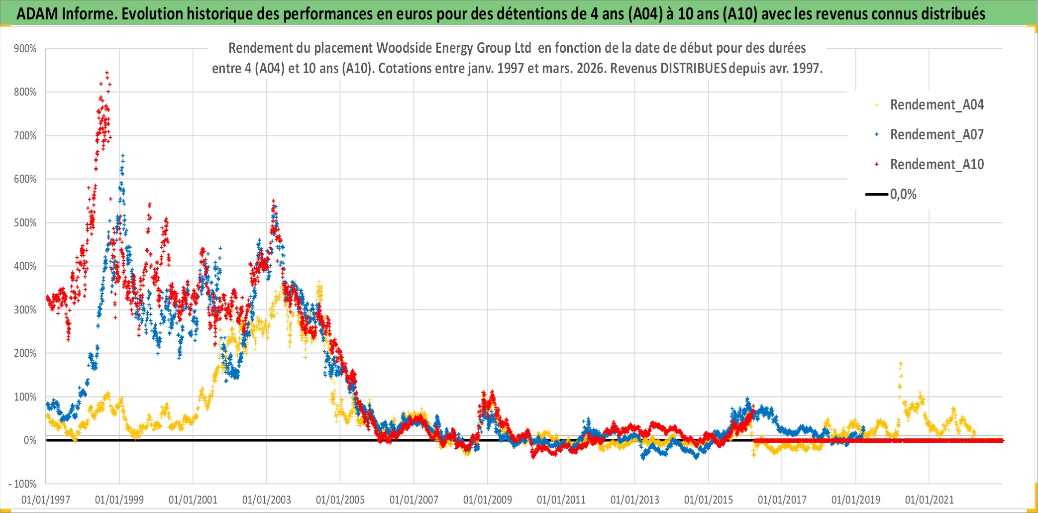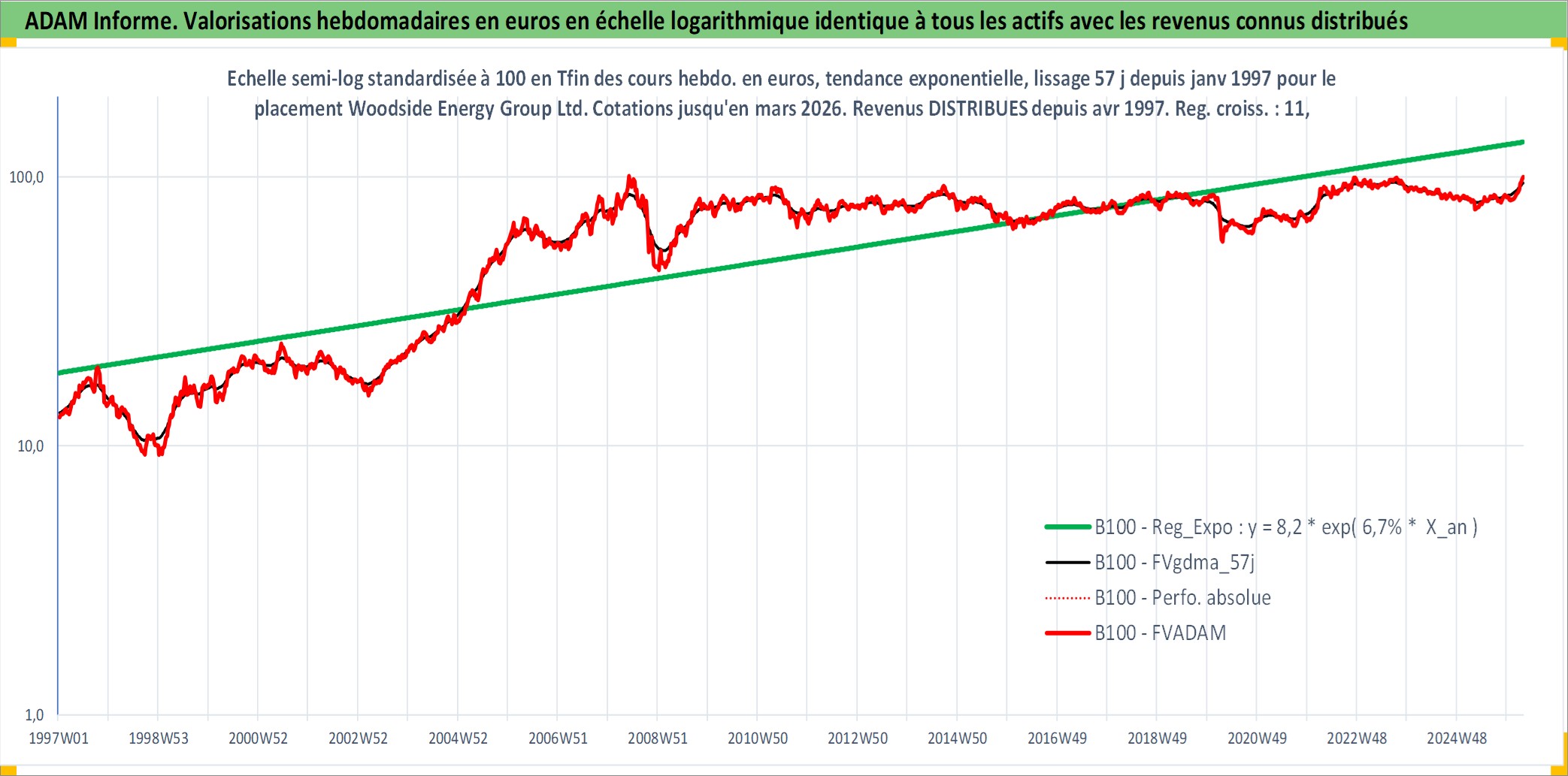 Site dédié aux investisseursPage dédiée sur site financeAnalyse des valorisations hebdomadaires de l'action Woodside Energy Group Ltd . Cet actif est cote en AUD. Les valorisations sont en contrevaleur EURO et couvrent les semaines 1997W01 a 2026W13. Les revenus de cet actif financier sont pris en compte depuis la semaine 1997W15. La note globale ESG de cet actif est estimee a 4.0 (apres rebasage entre 0 et 20).