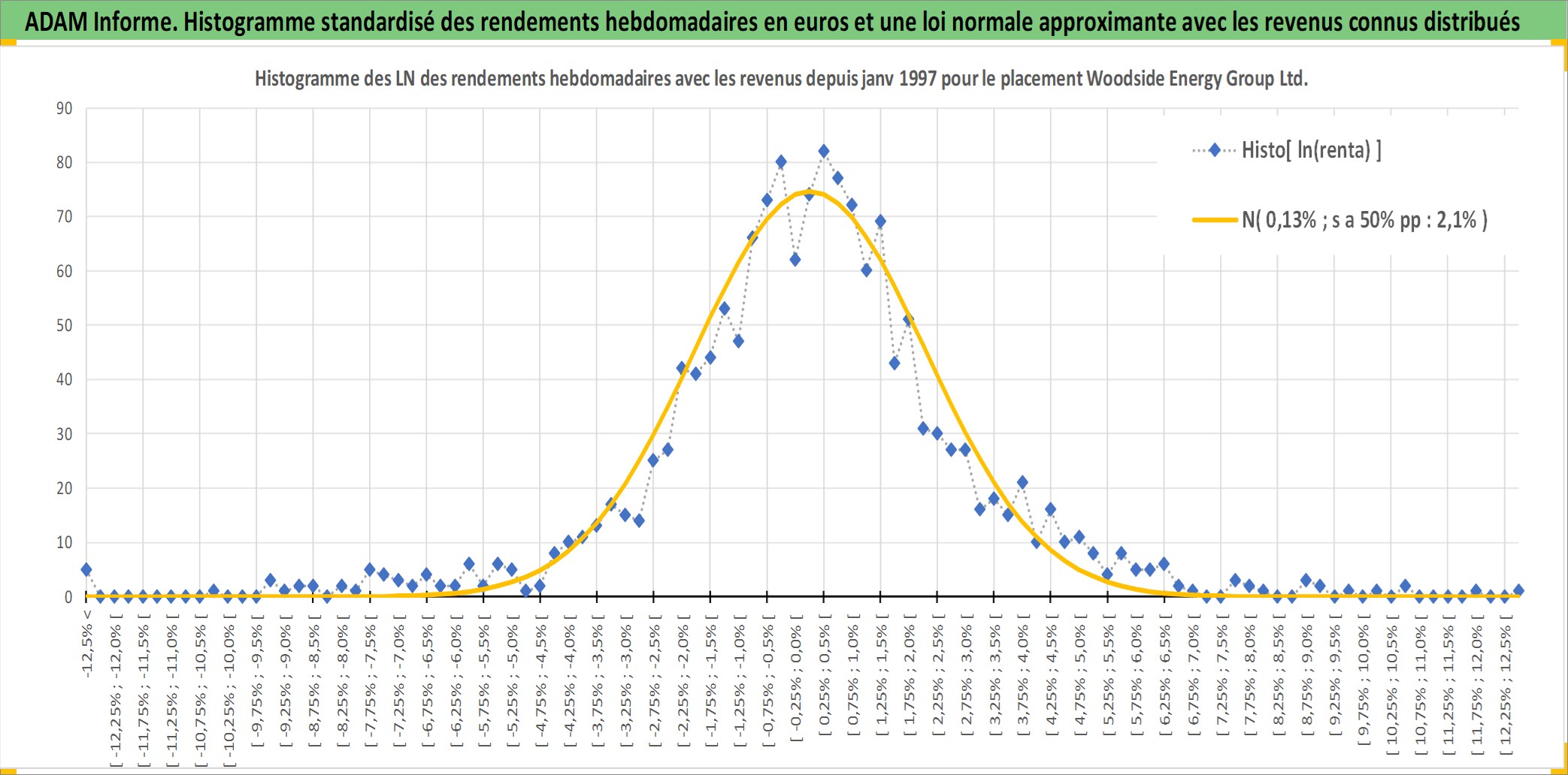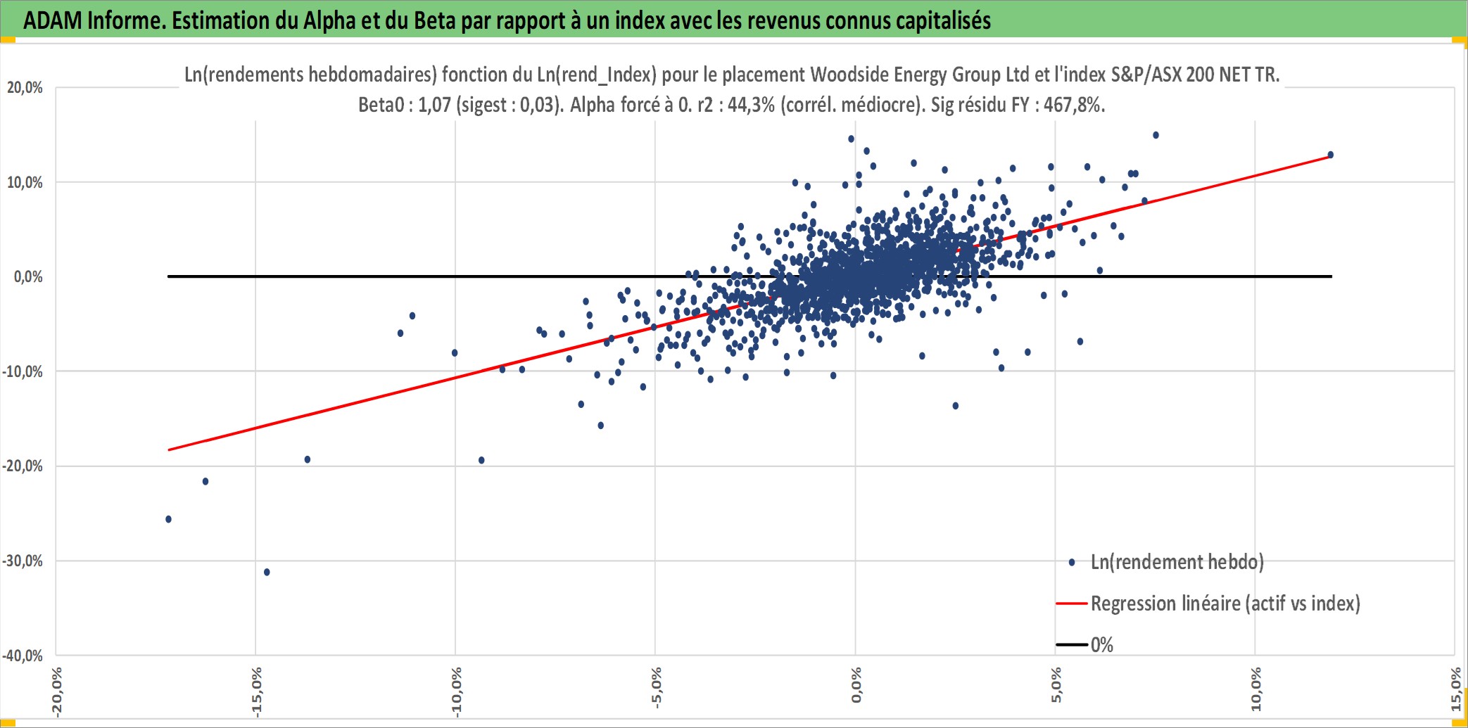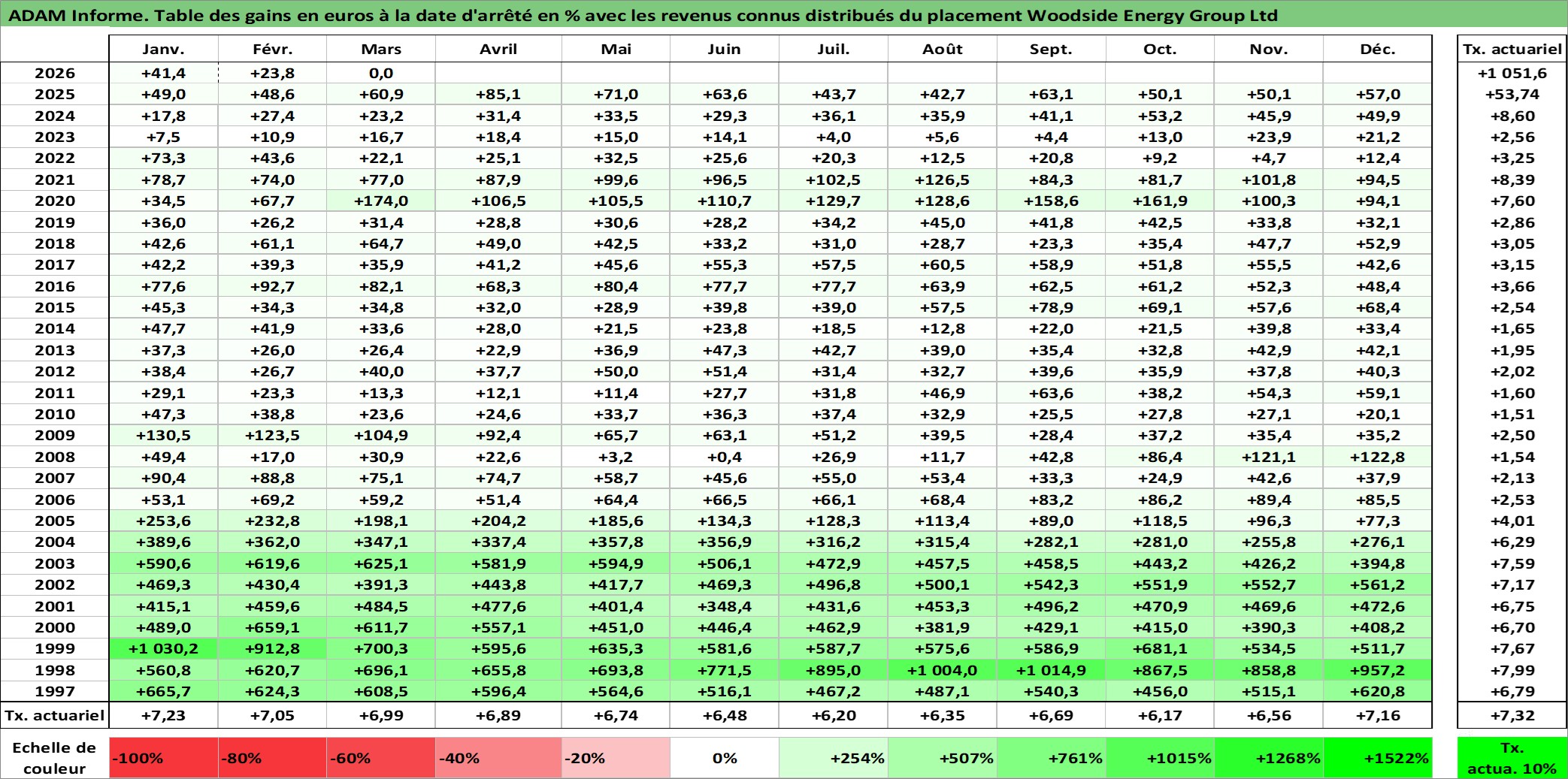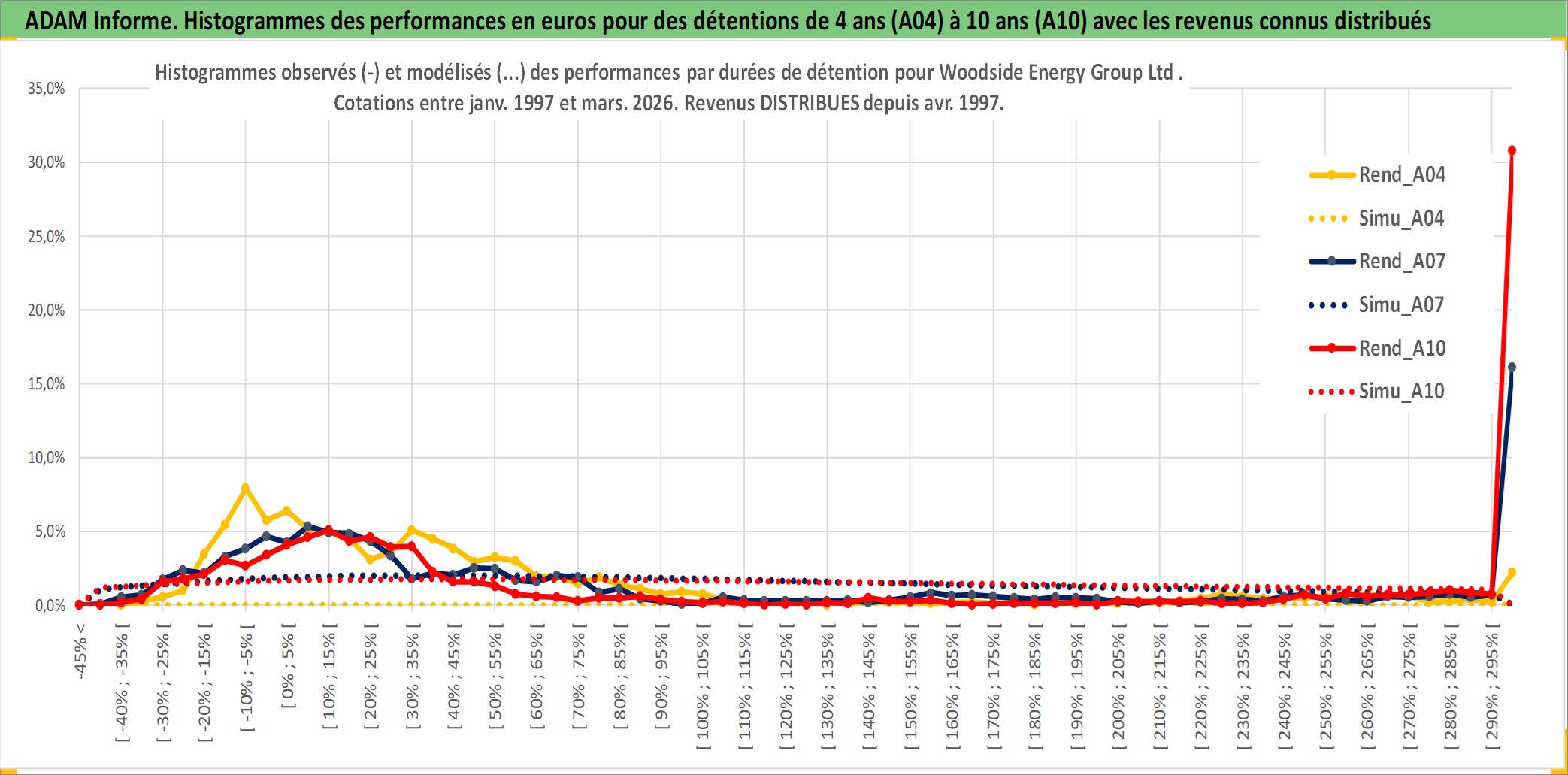 Site dédié aux investisseursPage dédiée sur site financeAnalyse des valorisations hebdomadaires de l'action Woodside Energy Group Ltd . Cet actif est cote en AUD. Les valorisations sont en contrevaleur EURO et couvrent les semaines 1997W01 a 2026W13. Les revenus de cet actif financier sont pris en compte depuis la semaine 1997W15. La note globale ESG de cet actif est estimee a 4.0 (apres rebasage entre 0 et 20).