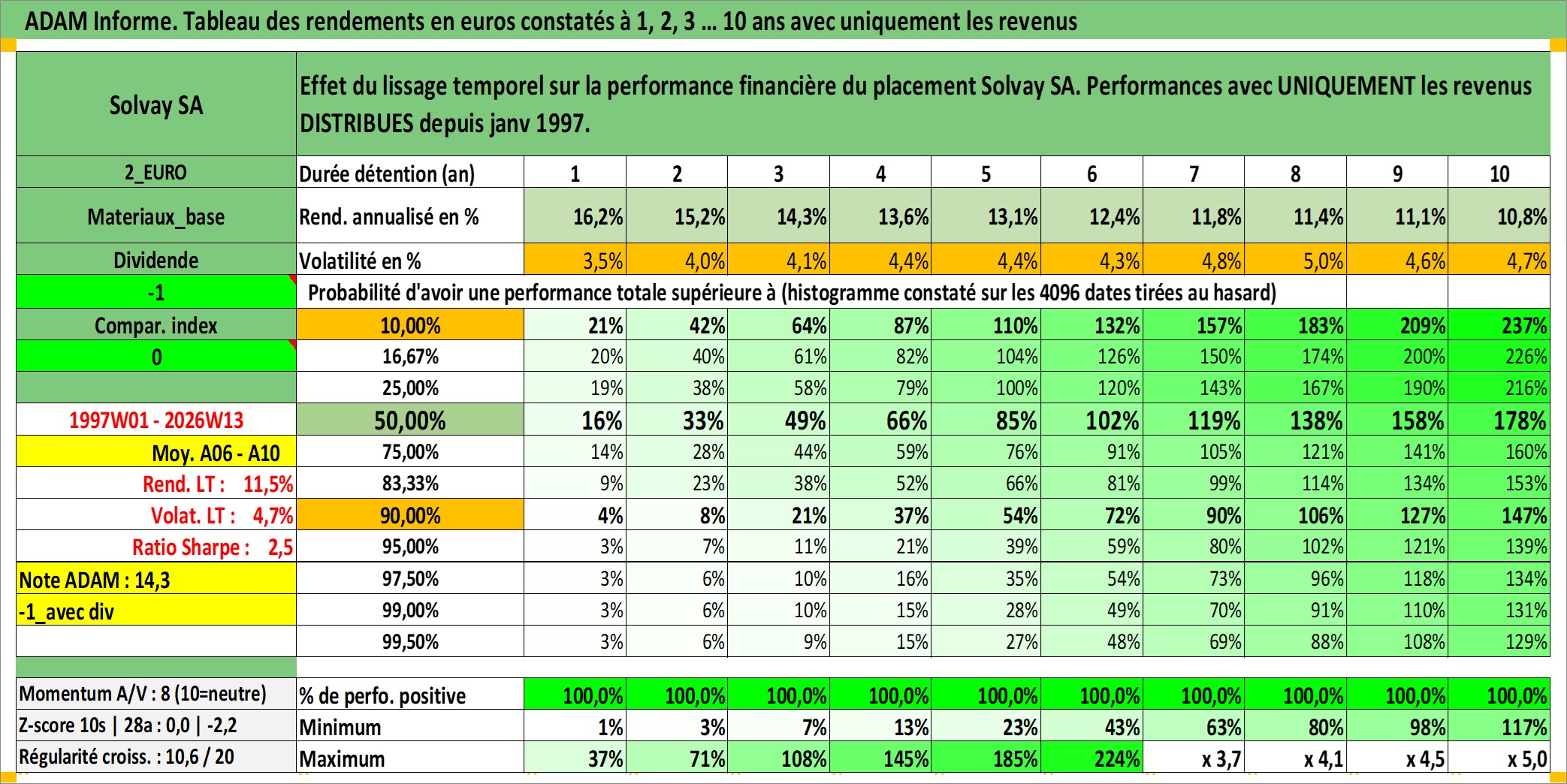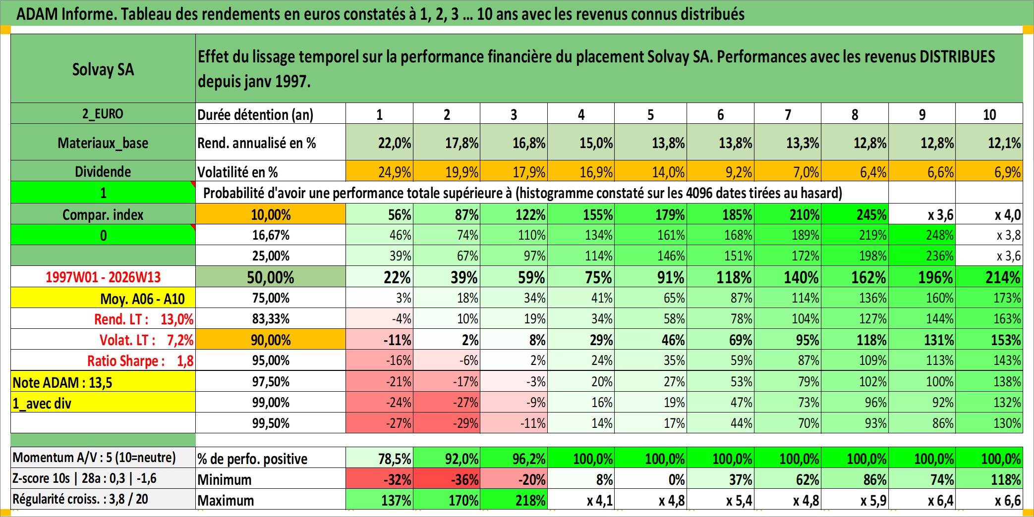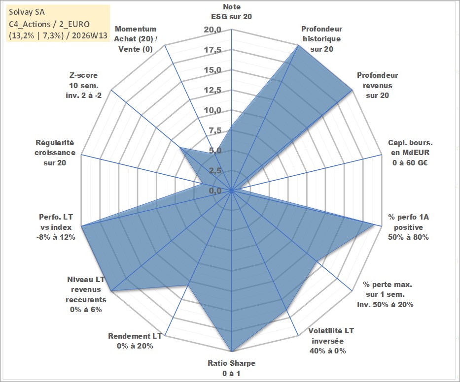 Site dédié aux investisseursPage dédiée sur site financeAnalyse des valorisations hebdomadaires de l'action Solvay SA. Cet actif est cote en EUR. Les valorisations couvrent les semaines 1997W01 a 2026W13. Les revenus de cet actif financier sont pris en compte depuis la semaine 1997W04. La note globale ESG de cet actif est estimee a 8.0 (apres rebasage entre 0 et 20).